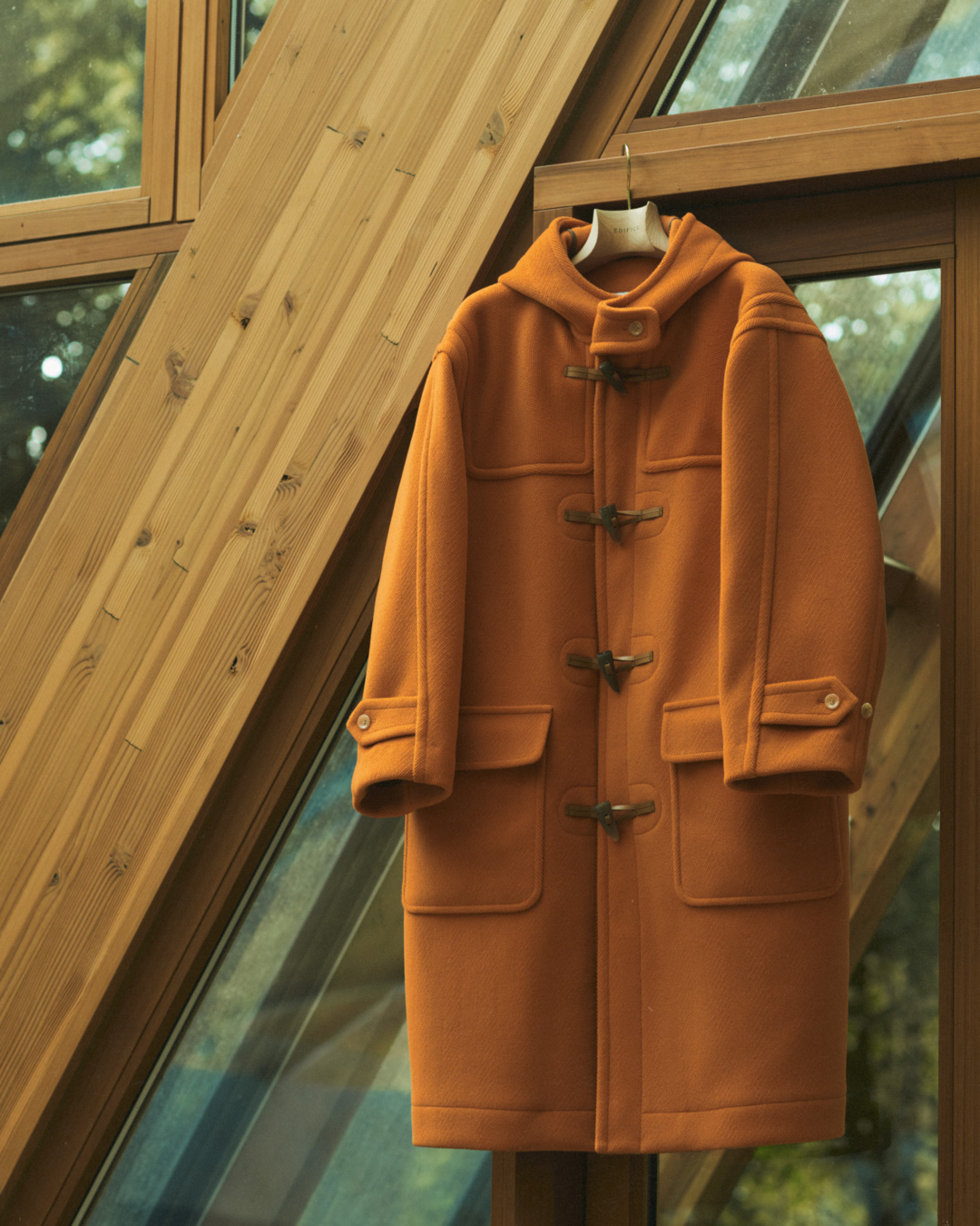 ダッフルコートオールドイングランドがパリで生まれたのは1867年で、なんとオペラ座の開業よりも先。しかし、今回エディフィスが生地に選んだジョシュアエリスはさらに100年前の1767年創業というから気が遠くなりそう。1980年代ごろのコートを基にしながら、肉厚ウールのトリプルパイルが活きるよう、たっぷりと着られる今っぽい形に。フードももちろん大きめだ。