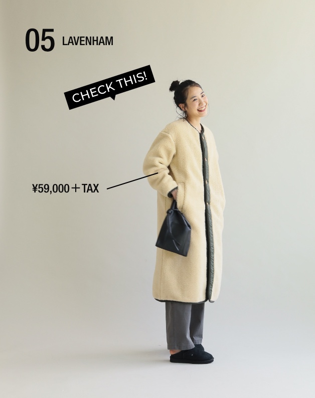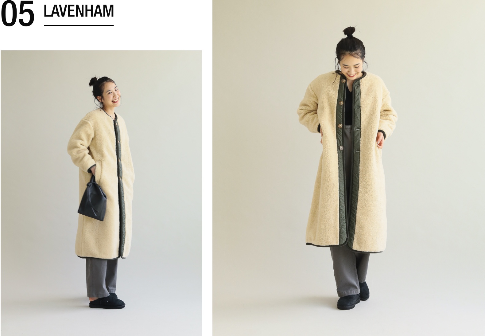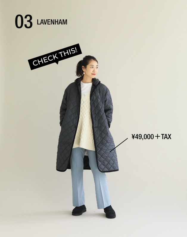 - LAVENHAMから今シーズンは新型のボアキルトコートをセレクト。シンプルなスタイルを格上げしてくれる、存在感のある一枚。
