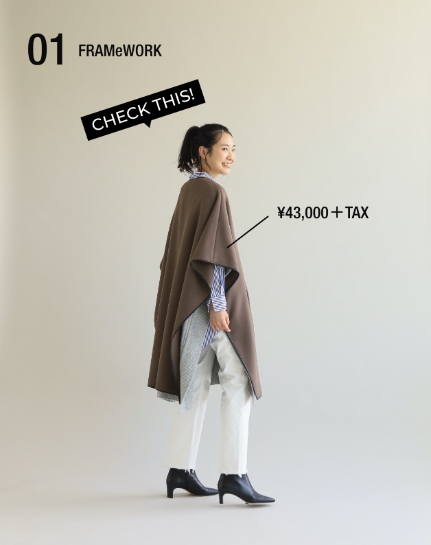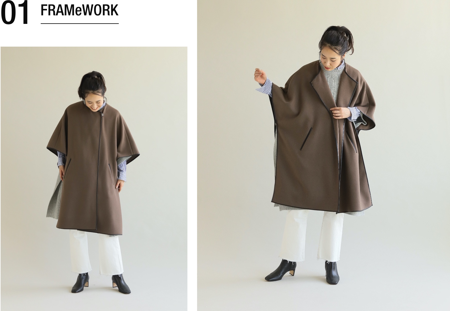 オーバーシルエットながら軽い着心地で、あえて細くしたパイピングはさりげないアクセントと全体にメリハリをプラス。前のボタンをとめたり開けたり、スタイリング次第でがらりと表情が変化するデザインアウター。 - FRAMeWORKポンチョコート◆¥47,300(税込)