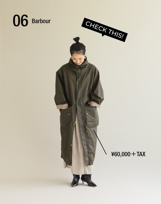 首元のボタンを止めて首元を立てて着る着こなしも、モードな雰囲気が出て◎。使い込むことによって、自分に馴染むコートになる、ずっと使い続けたいコート。 - FRAMeWORK【BARBOUR】別注HIKING COAT 40Z fabrice◆¥66,000(税込)