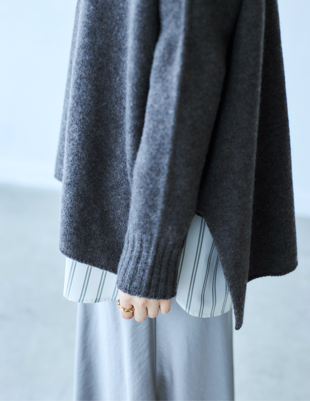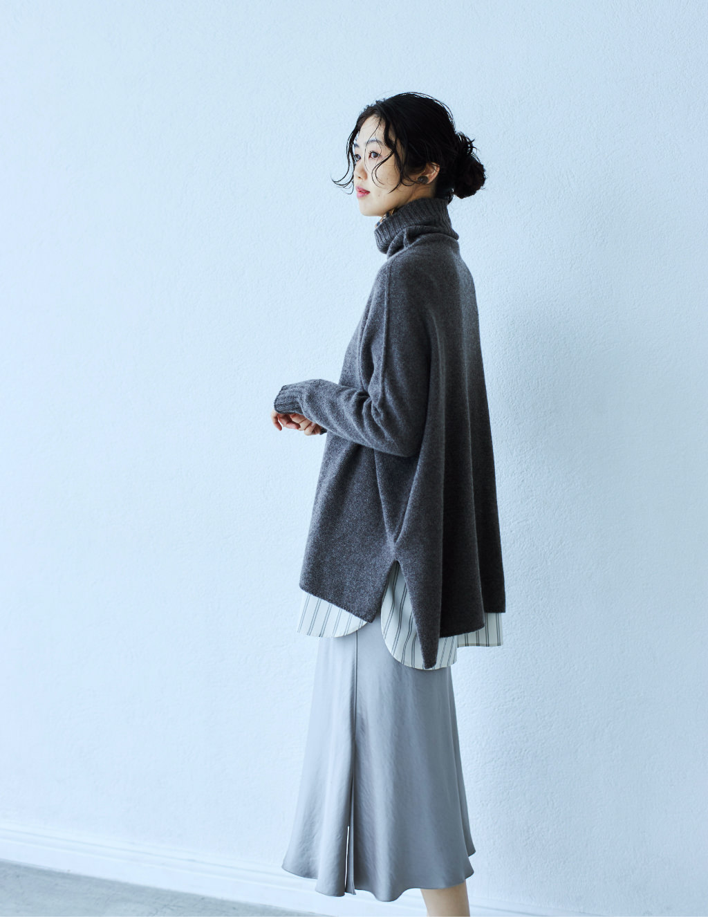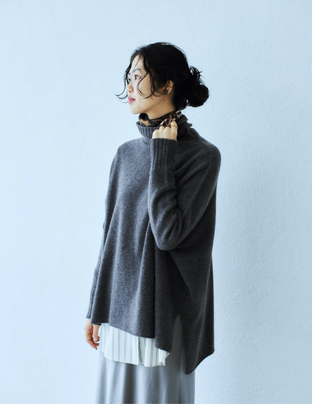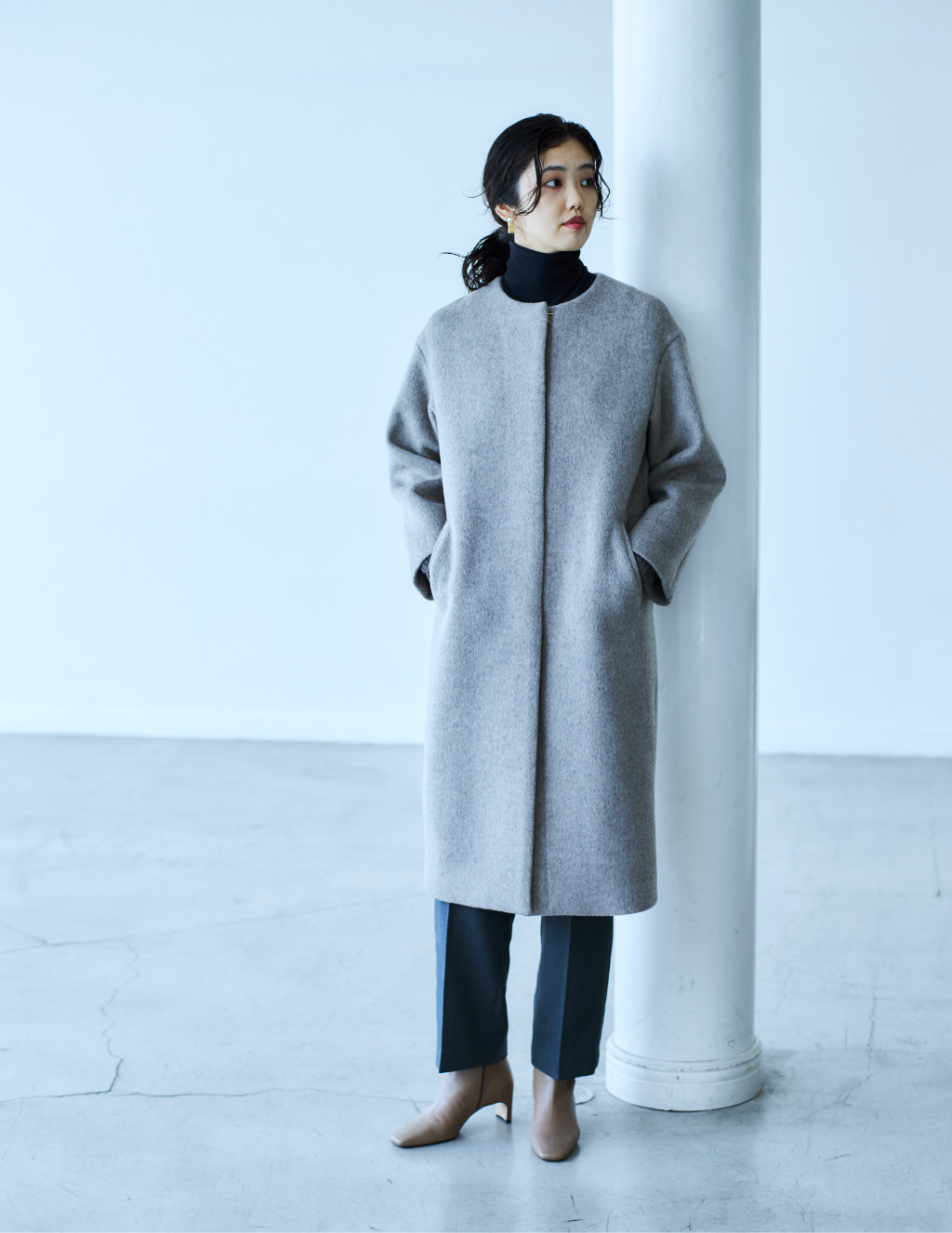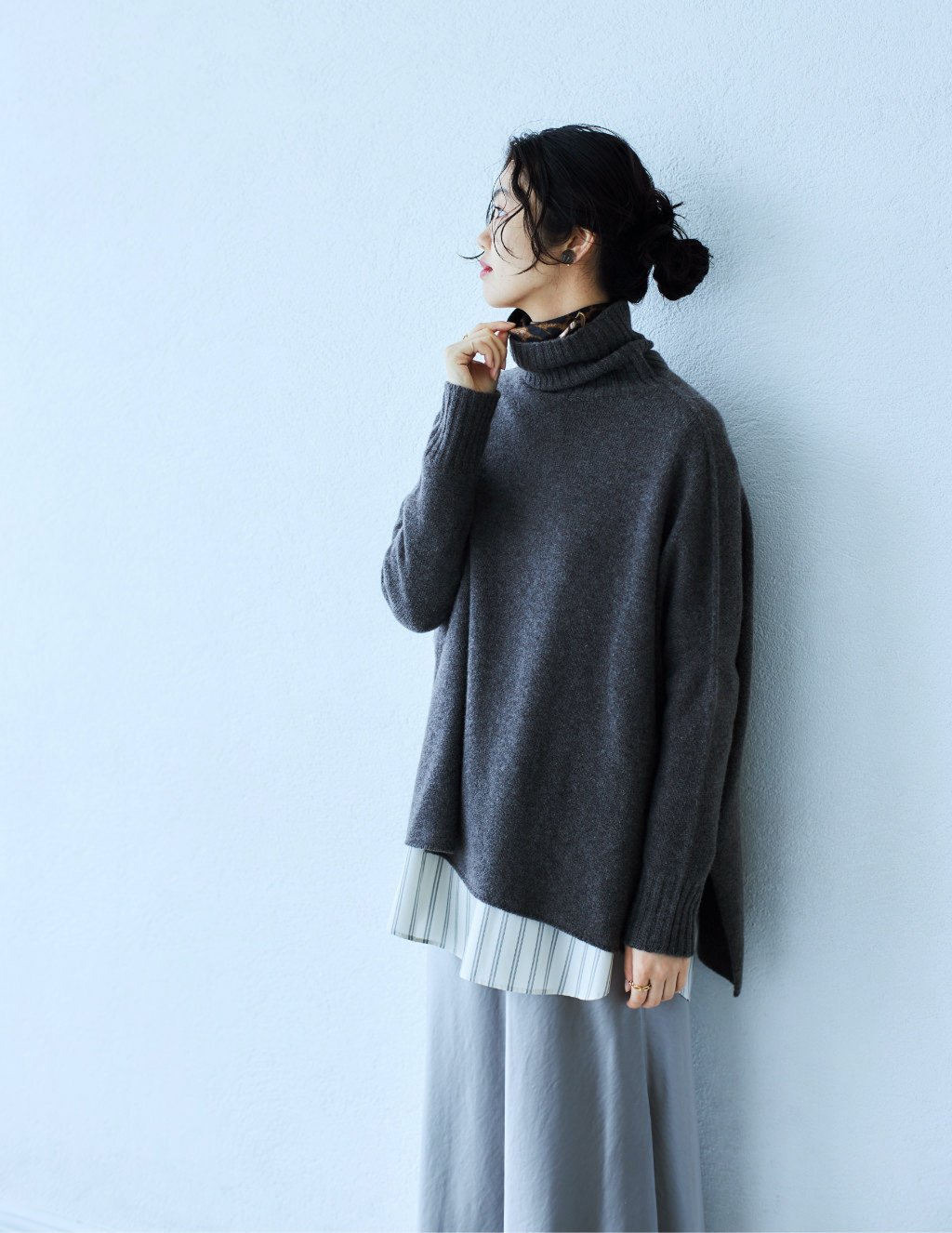ハイネックのニットでも羽織りやすい首周りのラインやリラックス感のあるシルエットがポイント。