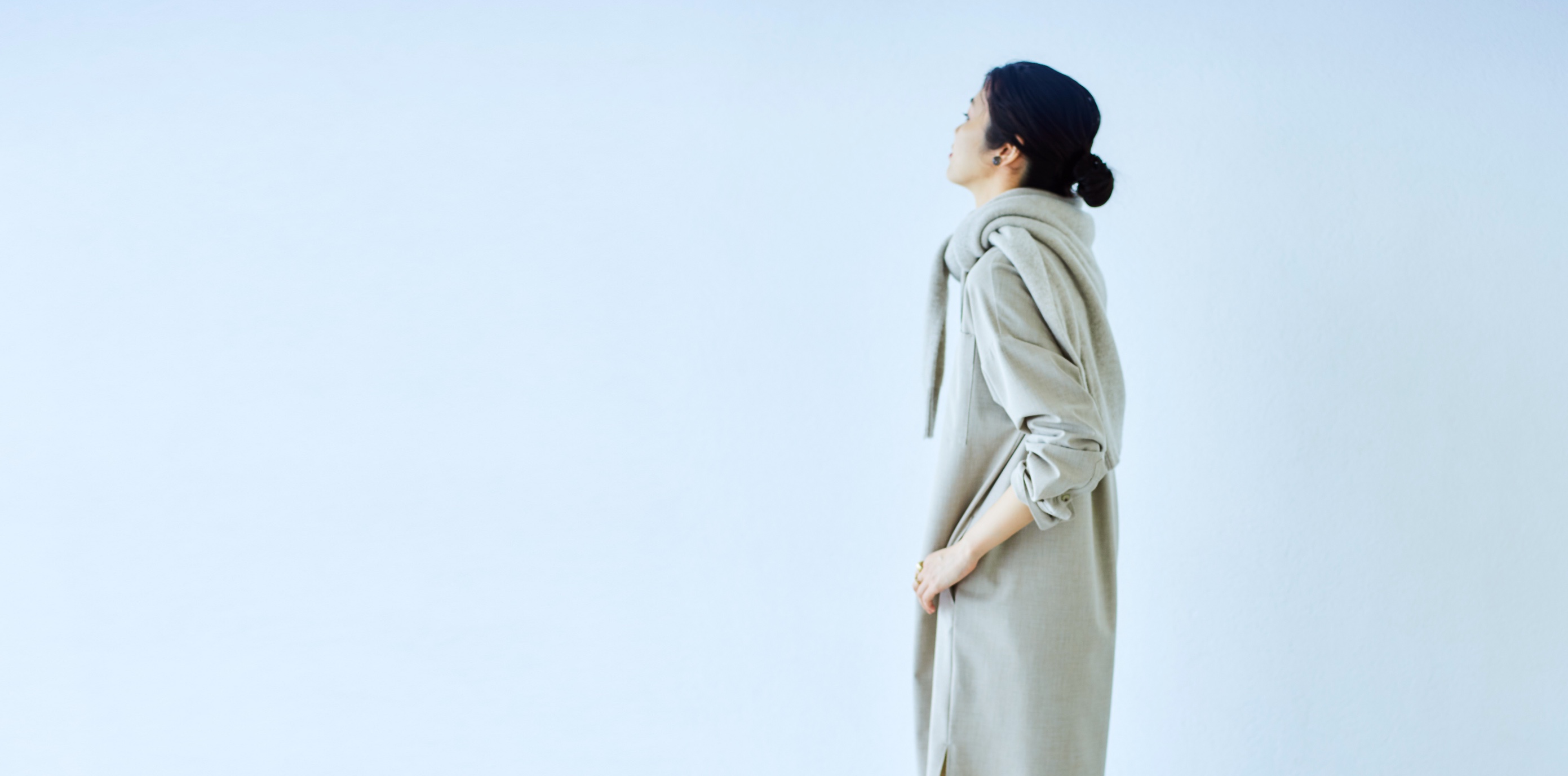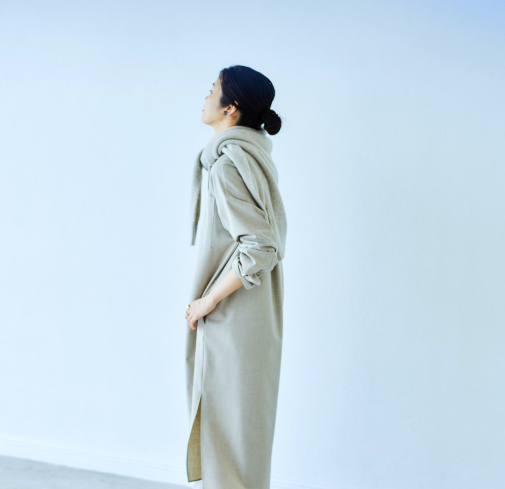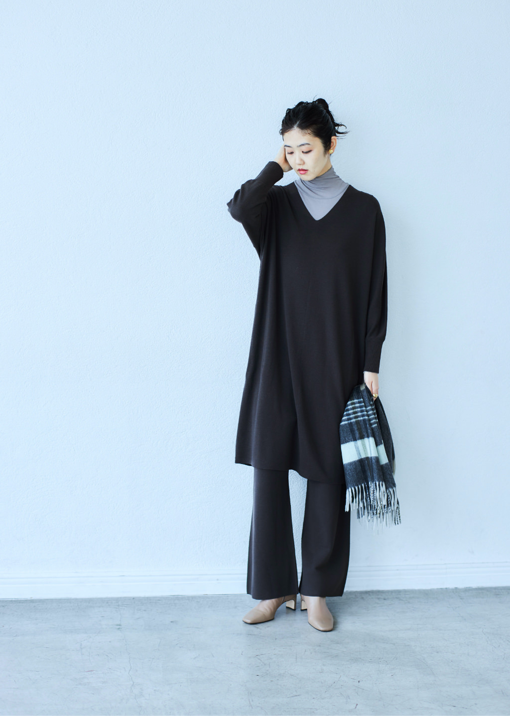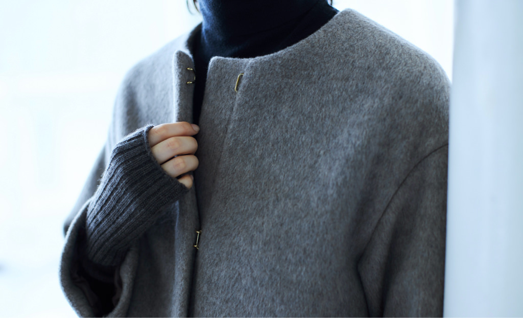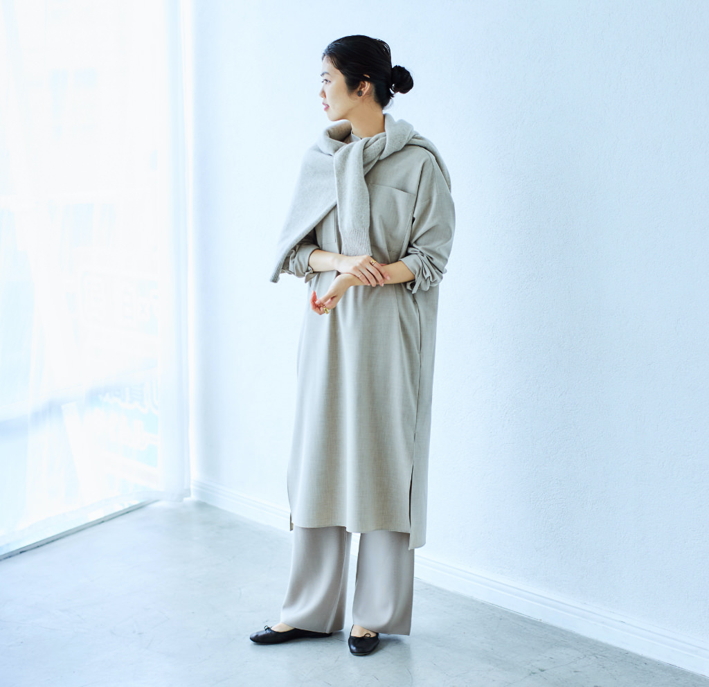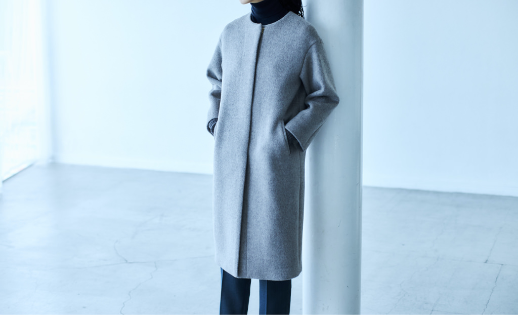 ハイネックのニットでも羽織りやすい首周りのラインやリラックス感のあるシルエットがポイント。