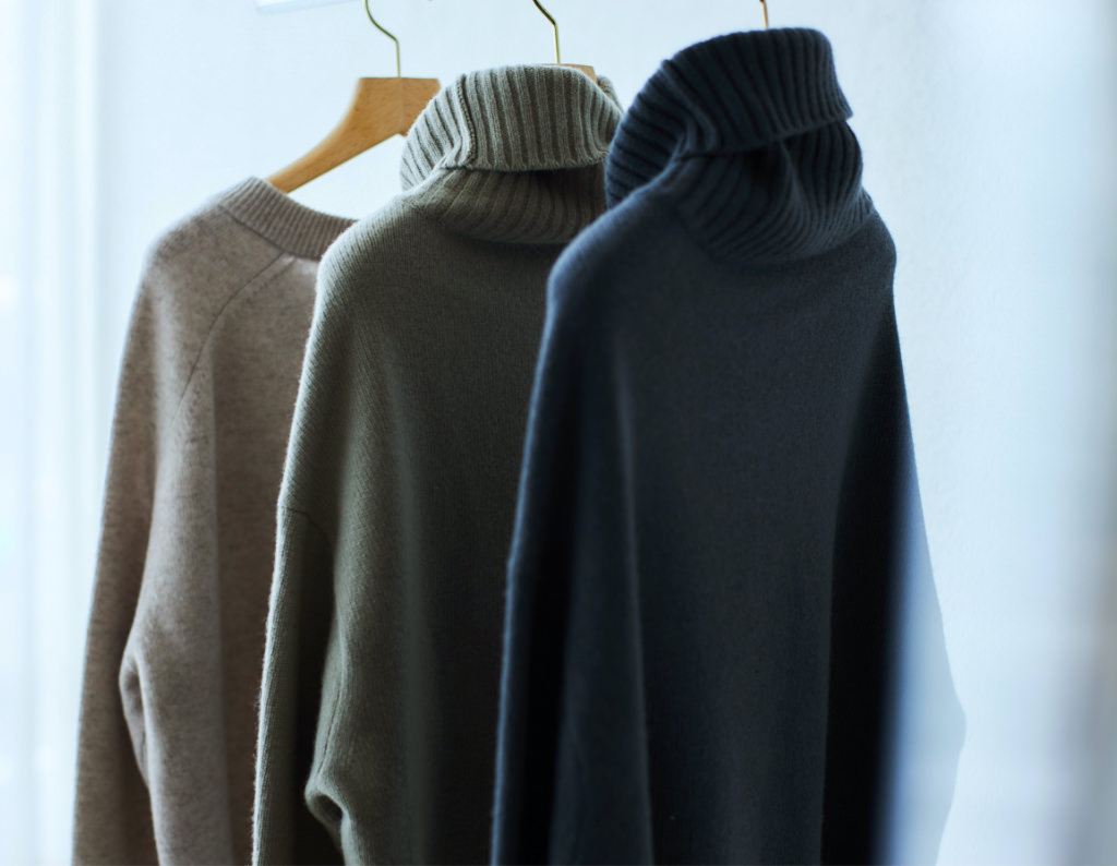 カシミヤ混で細い糸を使用しているのでボリュームがありながらも軽い着心地のニット。