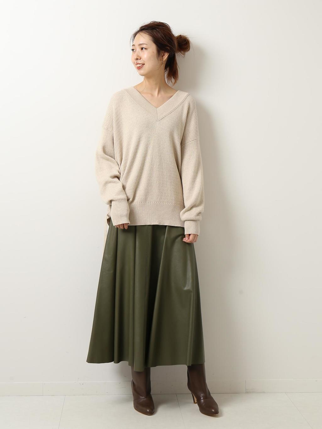 フレアスカートはカーキのレザー風で洗練度アップ。