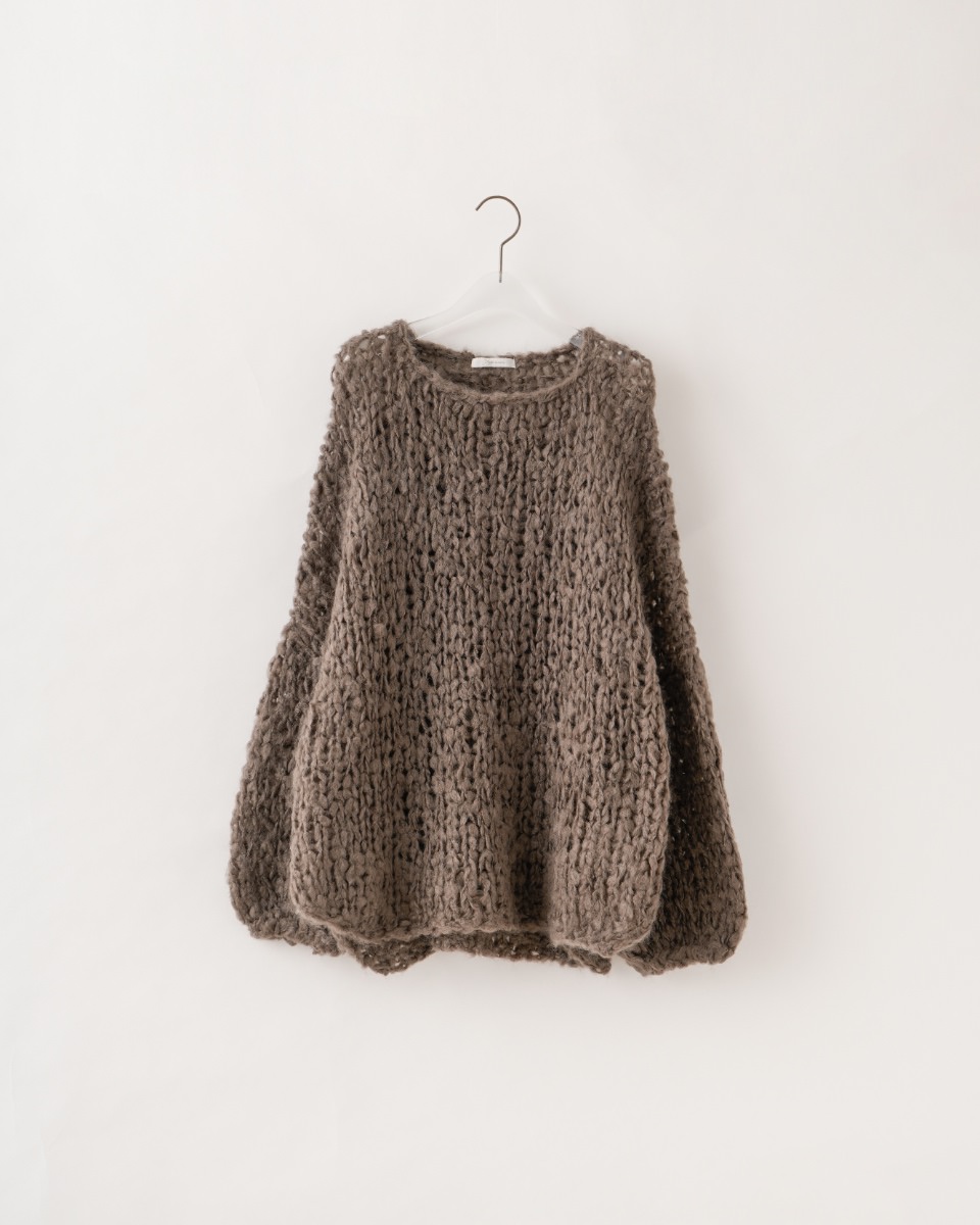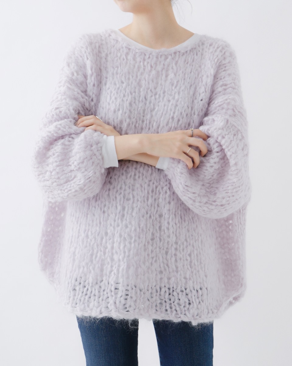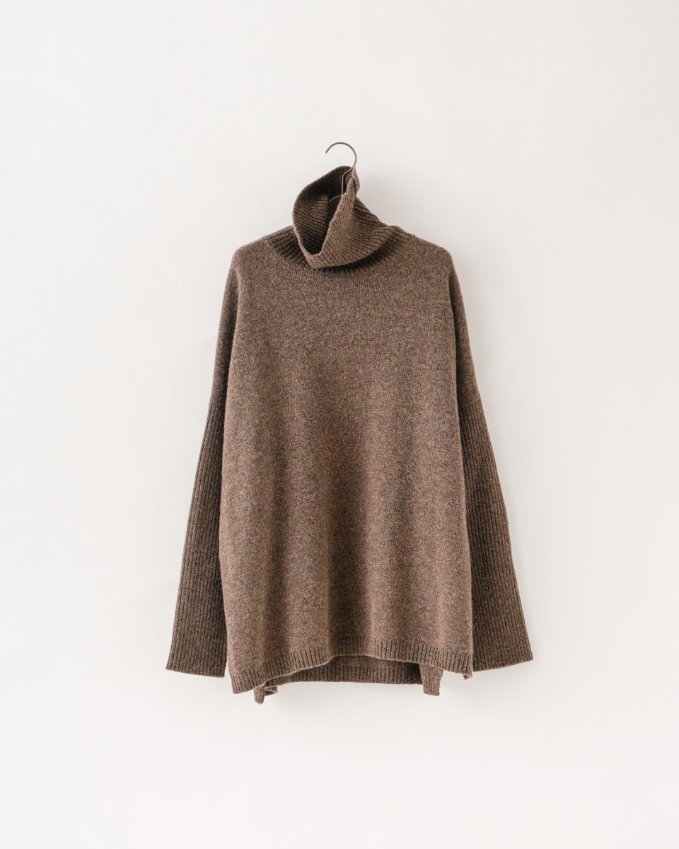 かなりワイドなシルエットで袖もゆるっと長く、サイドに大きくスリットが開いているので着用するとポンチョの様な身体を包み込む雰囲気になります。よく見るといろんな色が入った糸を使用しているので着た時に表情があります。