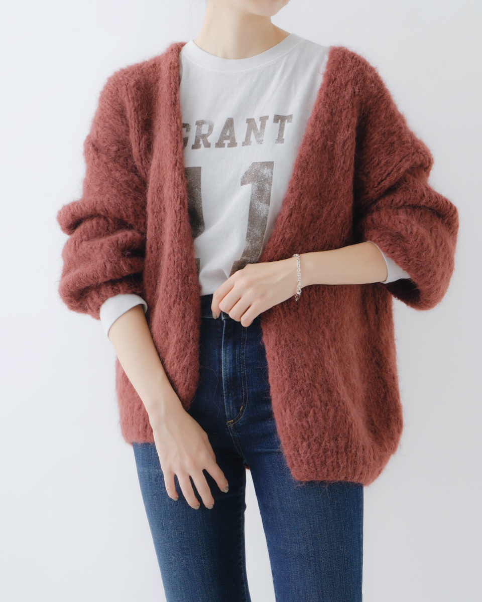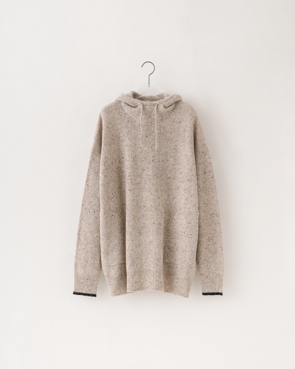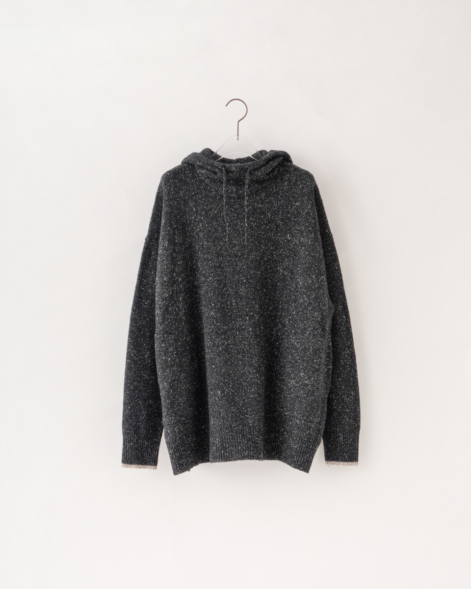 かなりワイドなシルエットで袖もゆるっと長く、サイドに大きくスリットが開いているので着用するとポンチョの様な身体を包み込む雰囲気になります。よく見るといろんな色が入った糸を使用しているので着た時に表情があります。