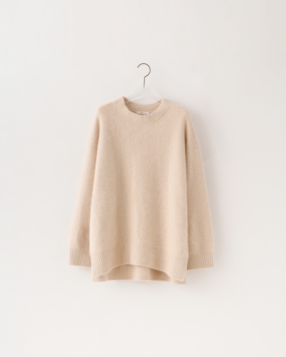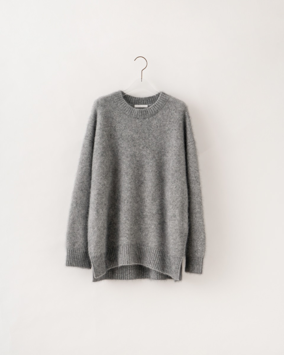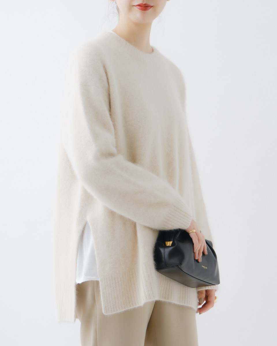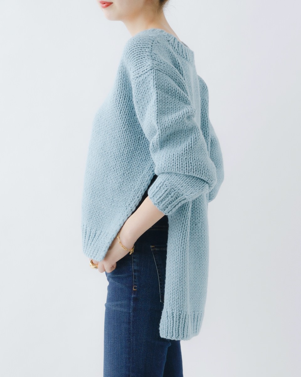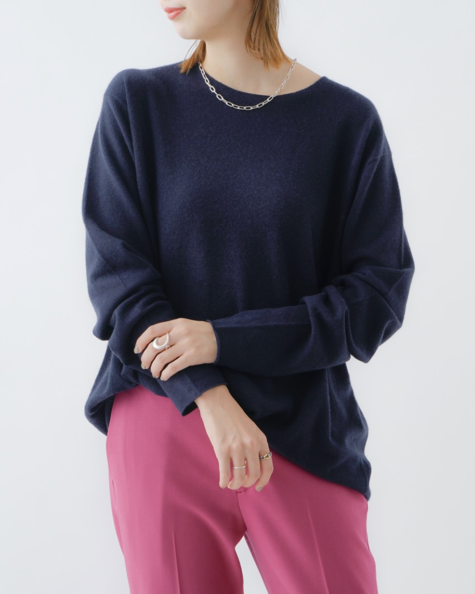 少し大きめのサイズ感でスウェットのような感覚で着れるニット。サイドにスリットが入っているのでカットソーやシャツとレイヤードスタイルも楽しむことができます。肌触りの良さととても軽い着心地は一度着たら手放せません。