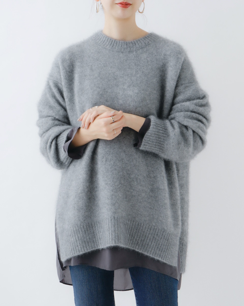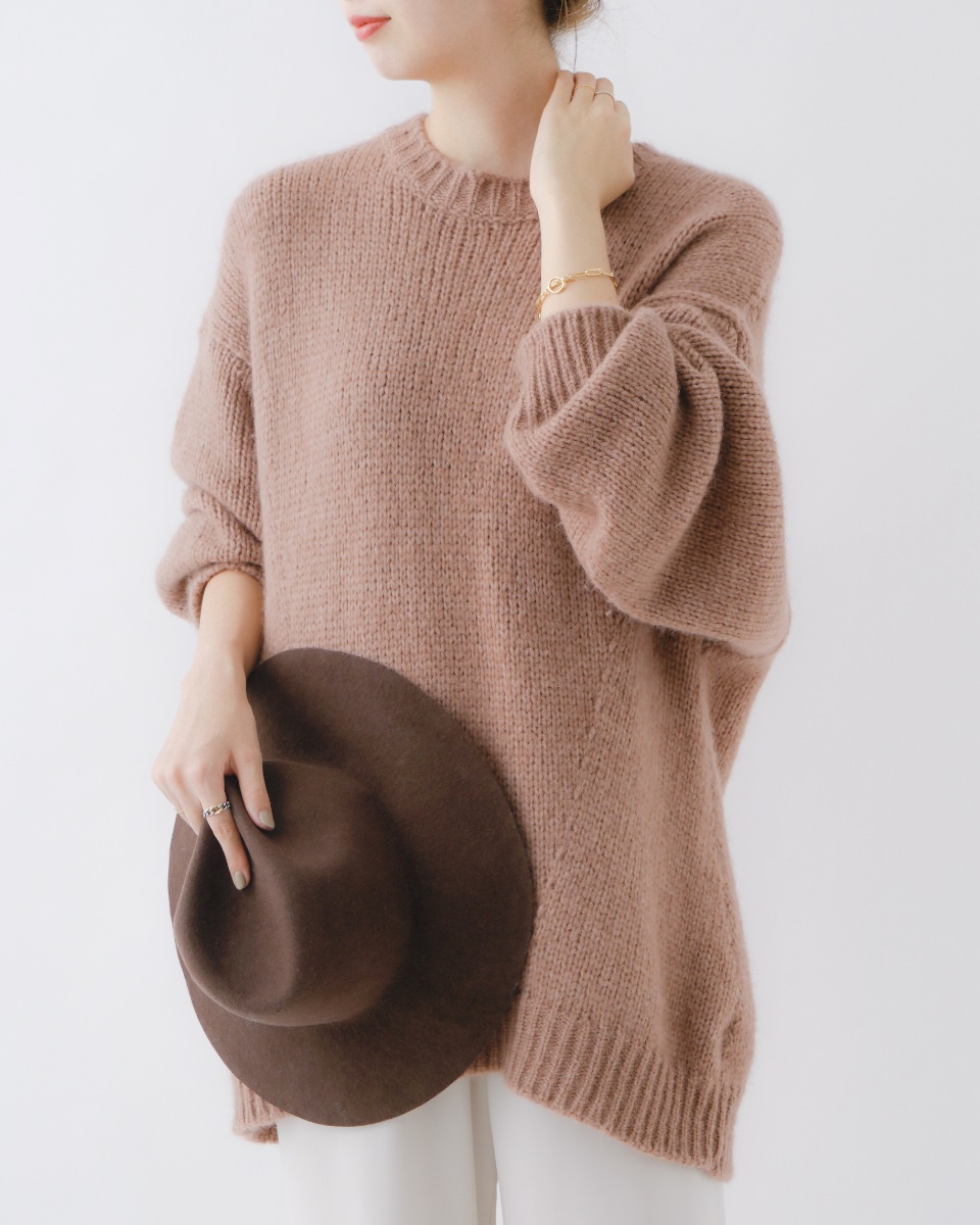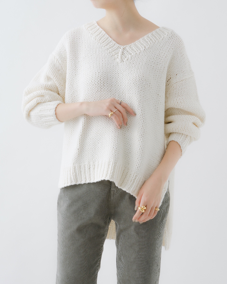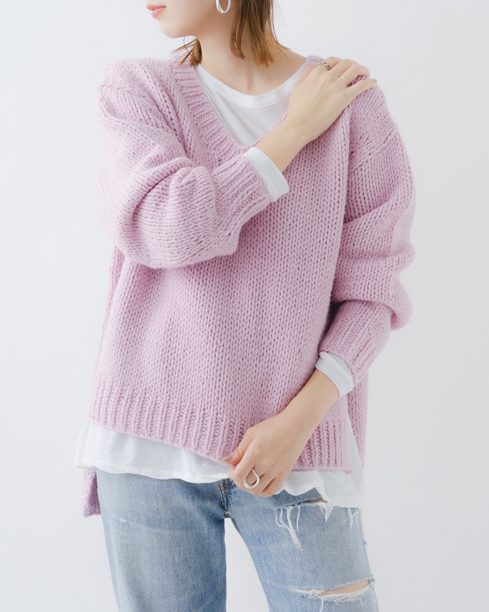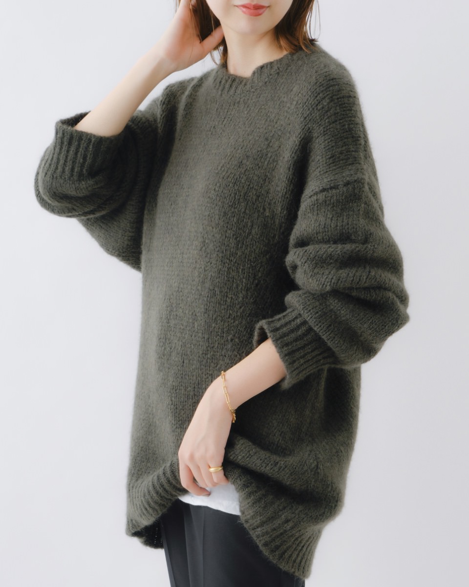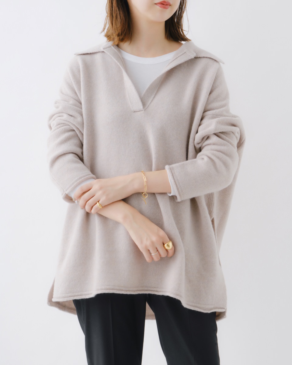 少し大きめのサイズ感でスウェットのような感覚で着れるニット。サイドにスリットが入っているのでカットソーやシャツとレイヤードスタイルも楽しむことができます。肌触りの良さととても軽い着心地は一度着たら手放せません。