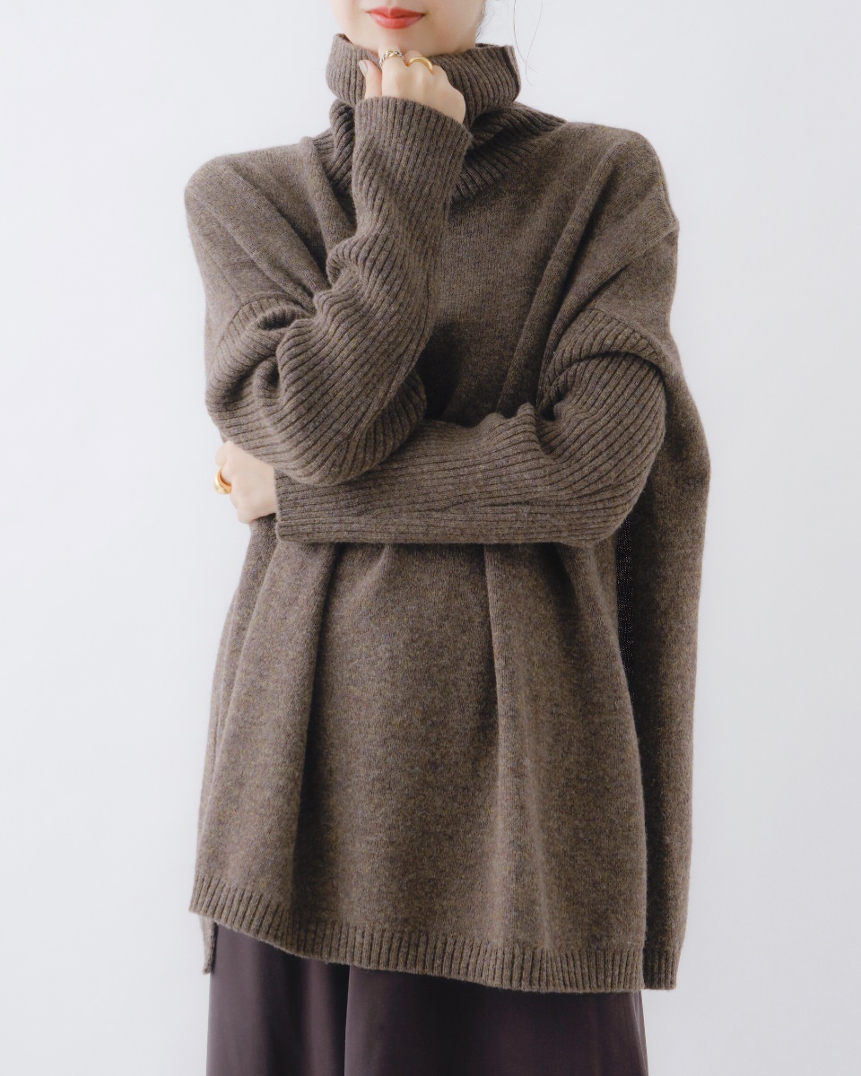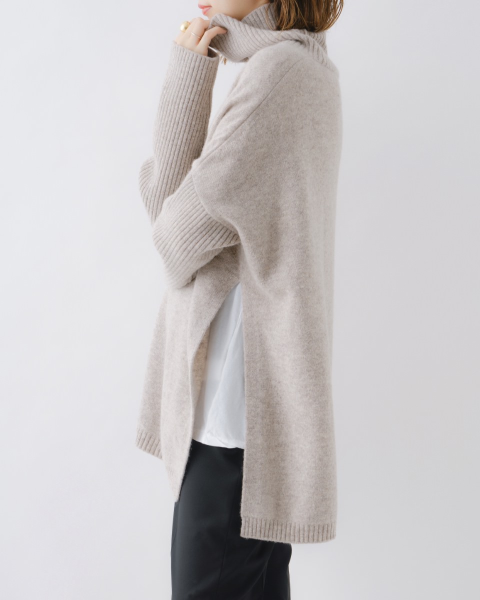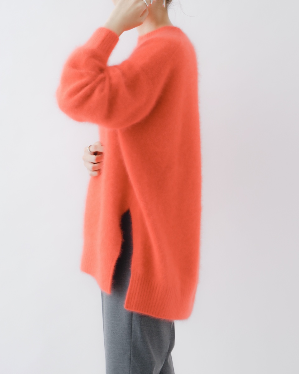 肉厚な編地と華やかなカラーバリエーションで目を惹く1枚。後ろが少し長いデザインなので細身なパンツに合わせても相性◎サイドに深いスリットが入っているのでスタイリングによってレイヤードを楽しめます。デコルテがすっきりと見えるのもうれしいポイント。