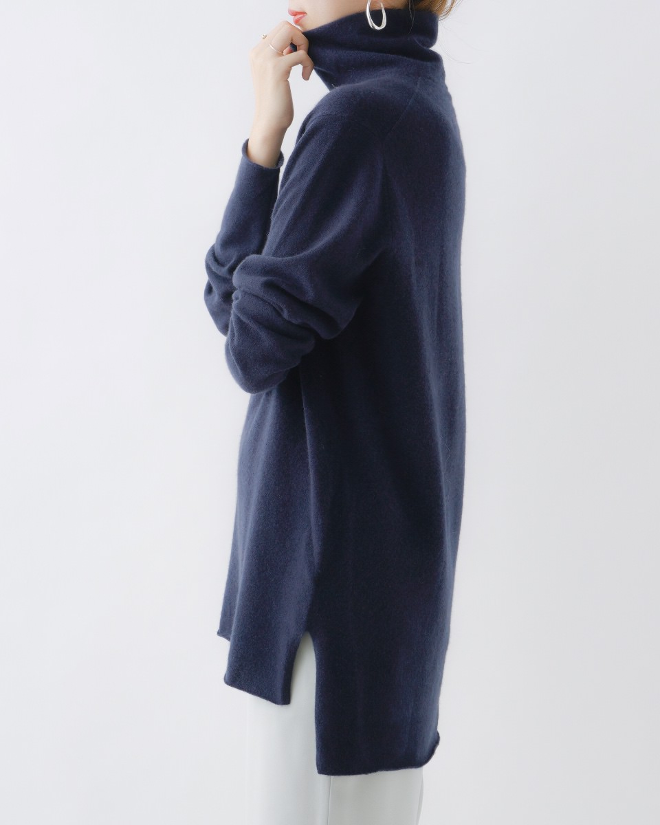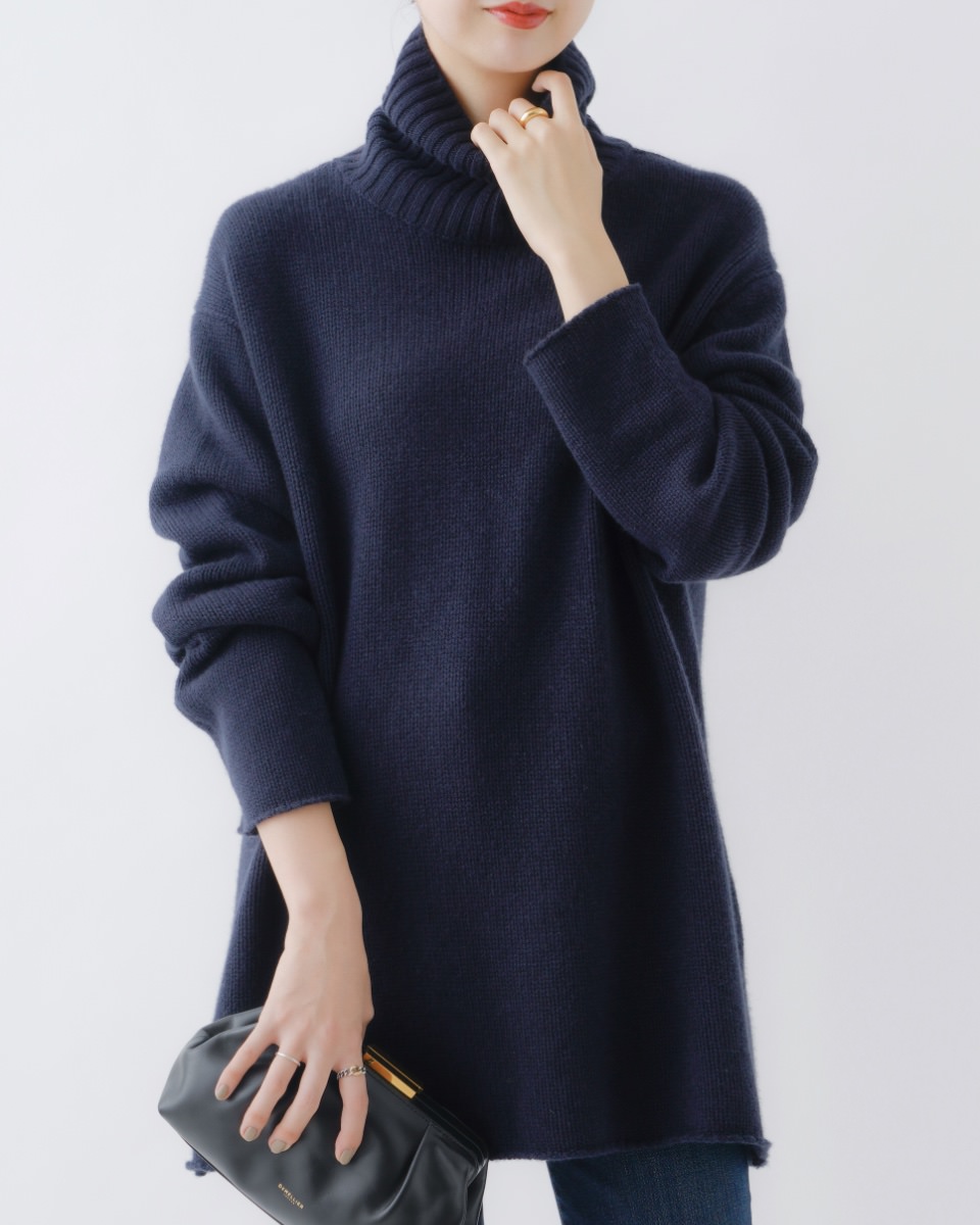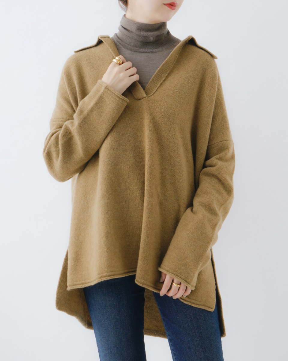 肉厚な編地と華やかなカラーバリエーションで目を惹く1枚。後ろが少し長いデザインなので細身なパンツに合わせても相性◎サイドに深いスリットが入っているのでスタイリングによってレイヤードを楽しめます。デコルテがすっきりと見えるのもうれしいポイント。