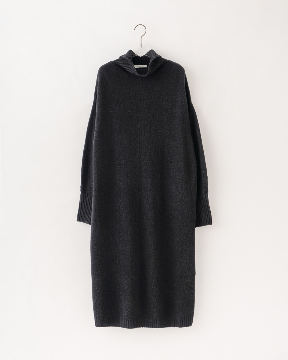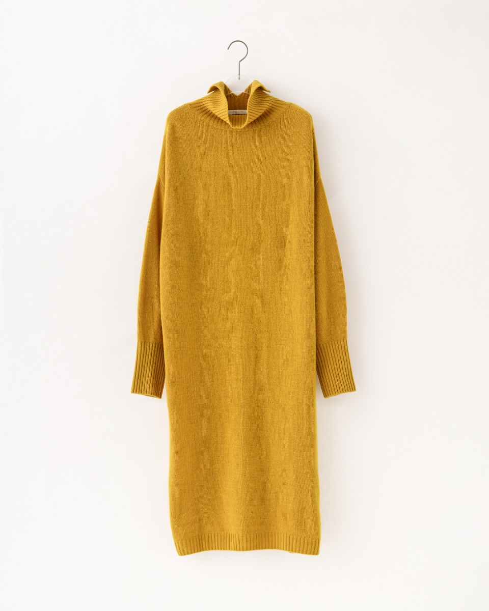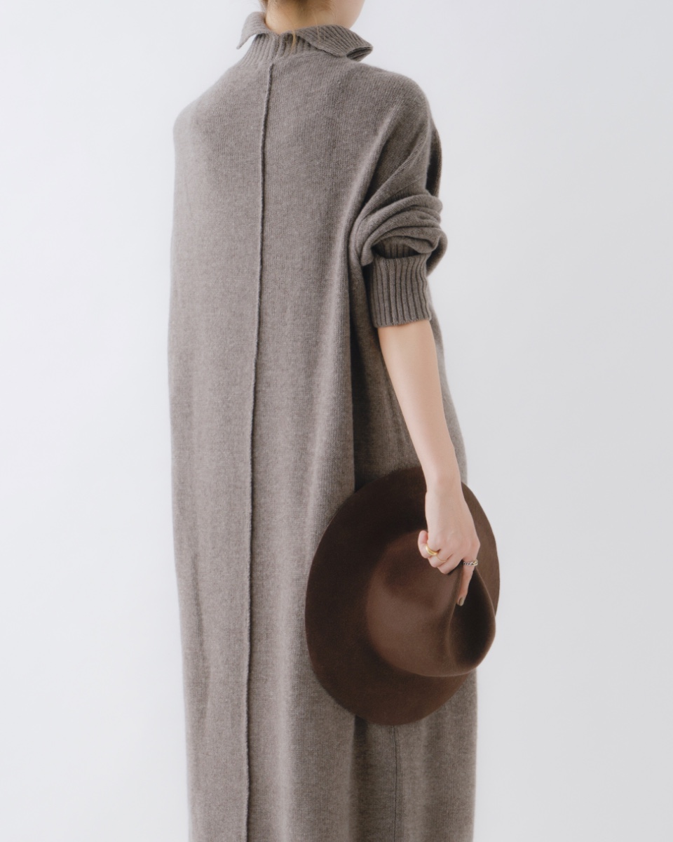 冬に欠かせないニットワンピース。前から見るとシンプルなデザインですが首元の後ろにスリットが入っていて着るだけでニュアンスが出ます。カシミヤが入っているため暖かく肌さわりもいいのが特徴です。