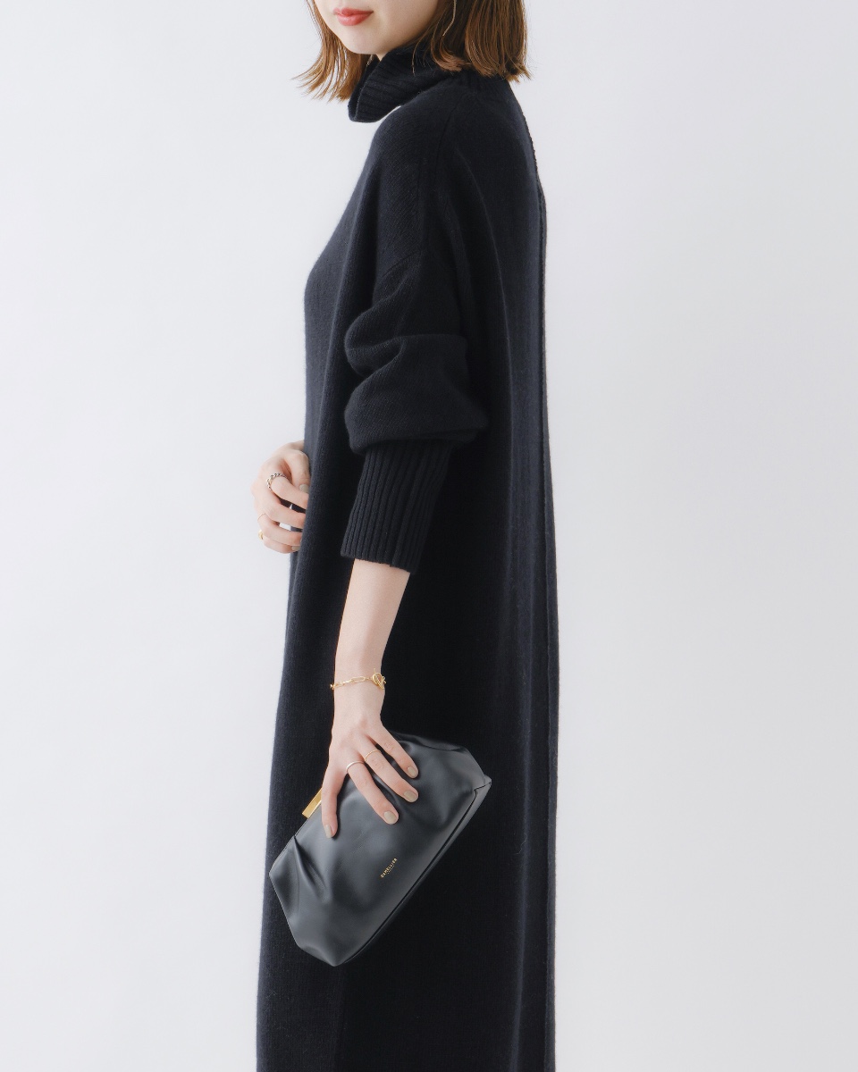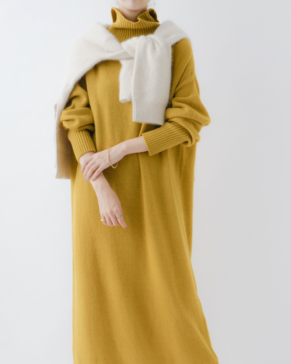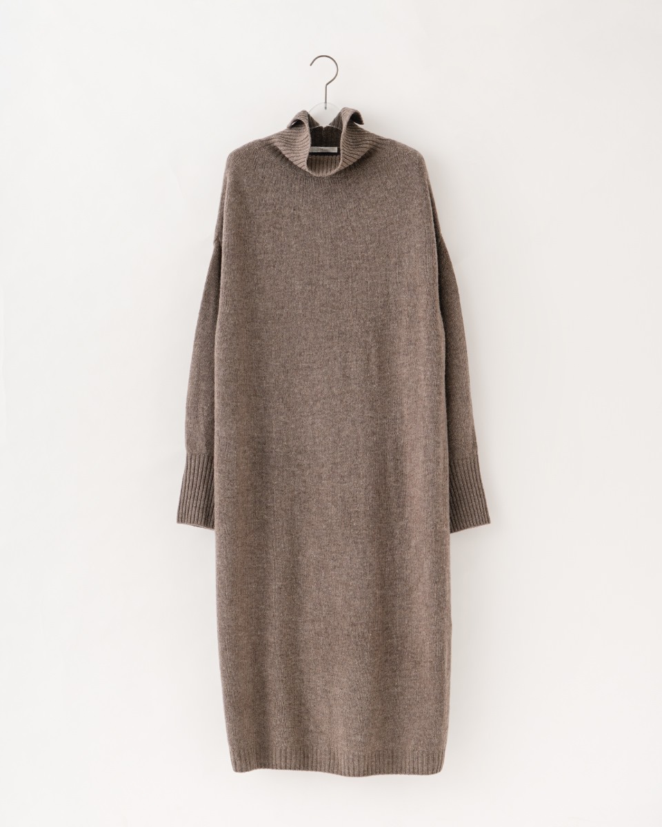 冬に欠かせないニットワンピース。前から見るとシンプルなデザインですが首元の後ろにスリットが入っていて着るだけでニュアンスが出ます。カシミヤが入っているため暖かく肌さわりもいいのが特徴です。