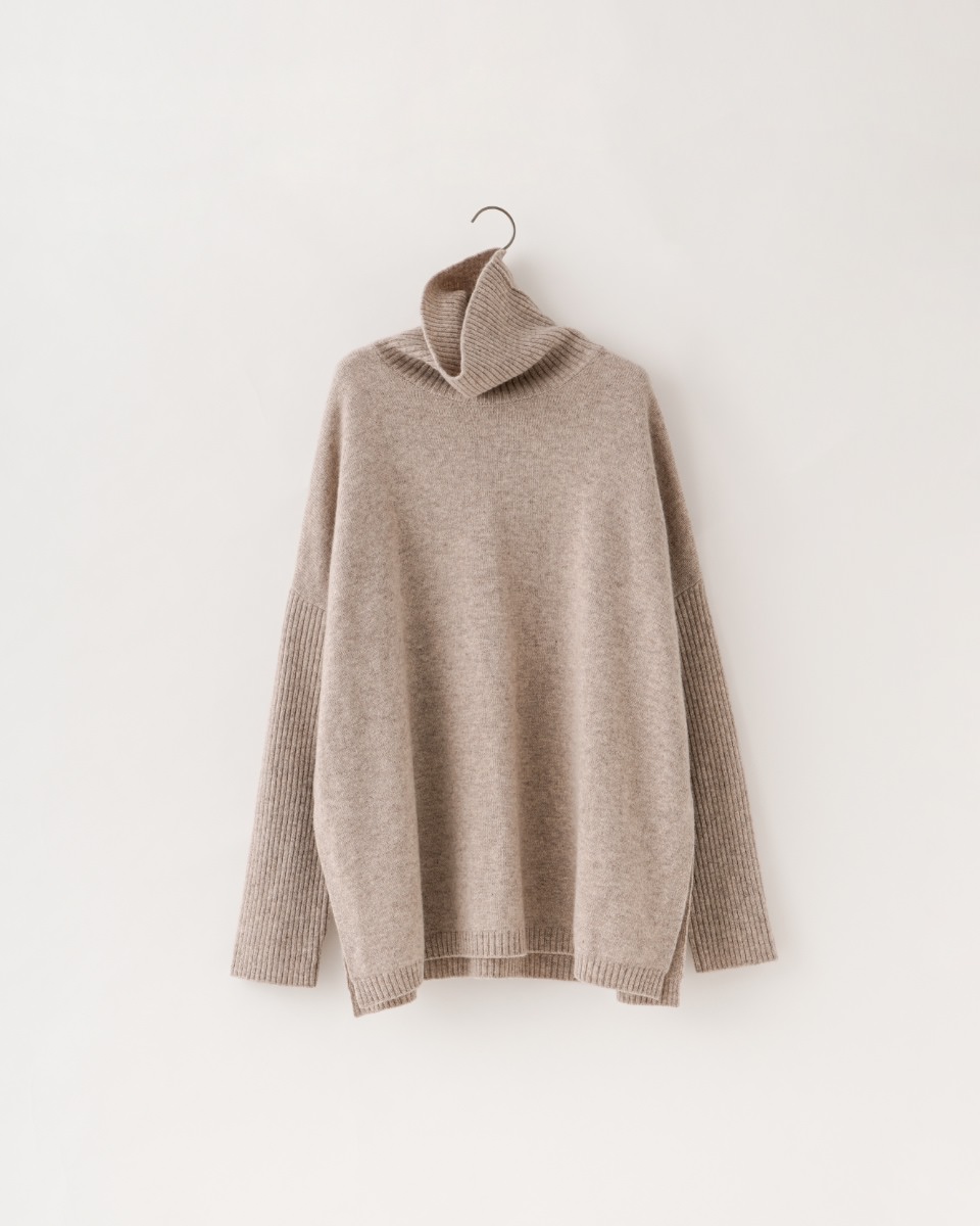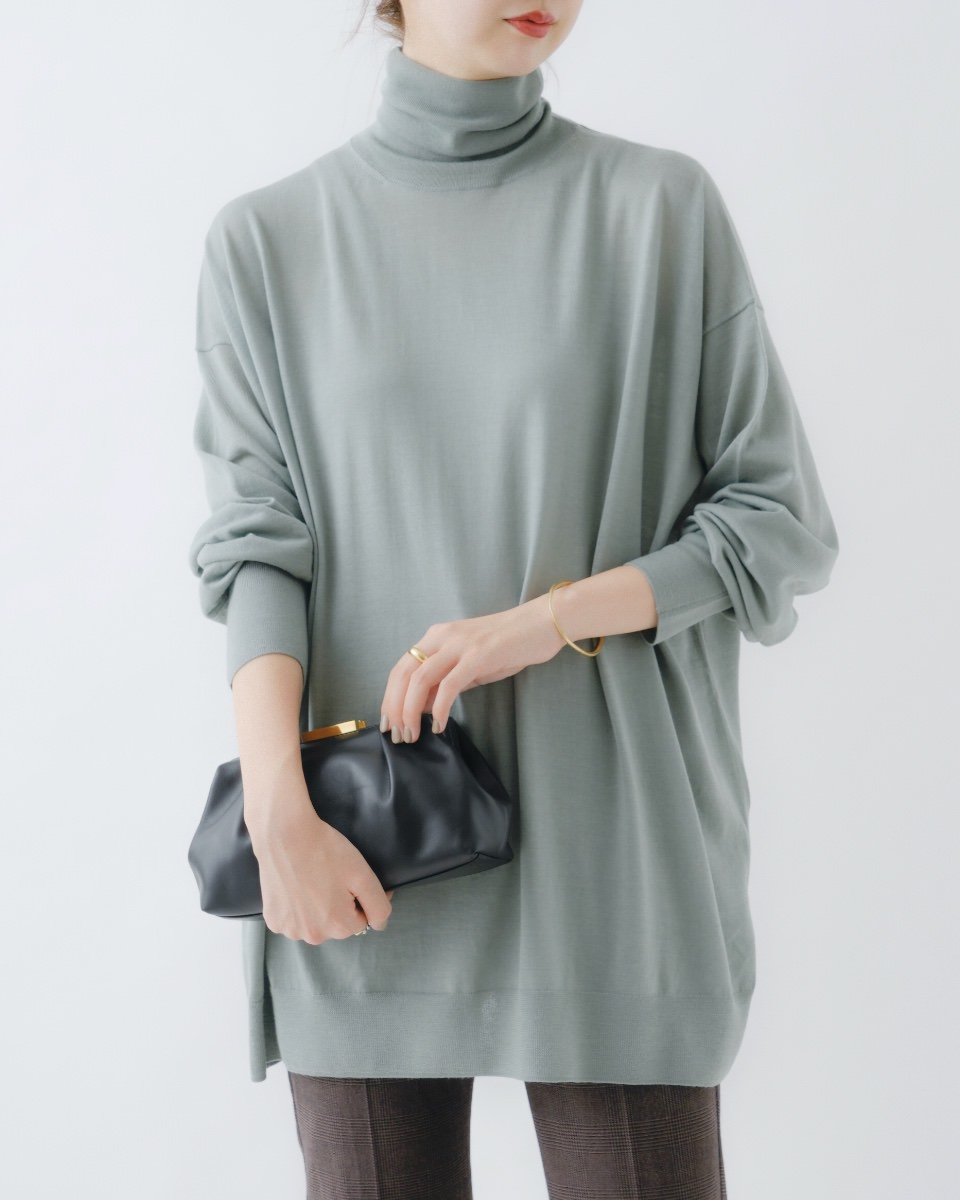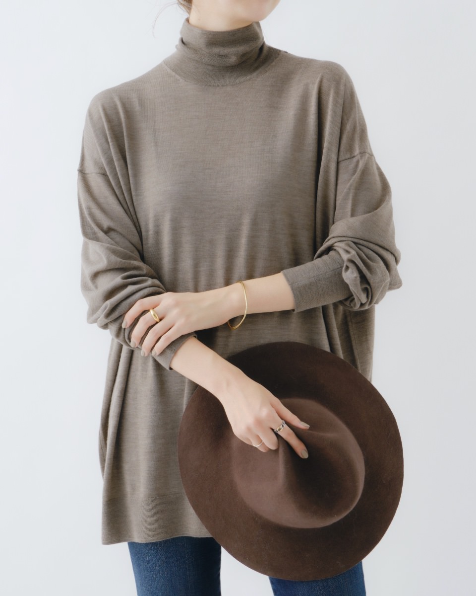 今年初めて取り扱うニットブランド【PICEA】最上級の素材をあえてカジュアルなデザインに落とし込み、長く着られるアイテムを展開しています。こちらはざっくりと編まれたオーバーサイズが特徴のタートルニット。ビッグシルエットですが落ち感があり女性らしい印象になります。