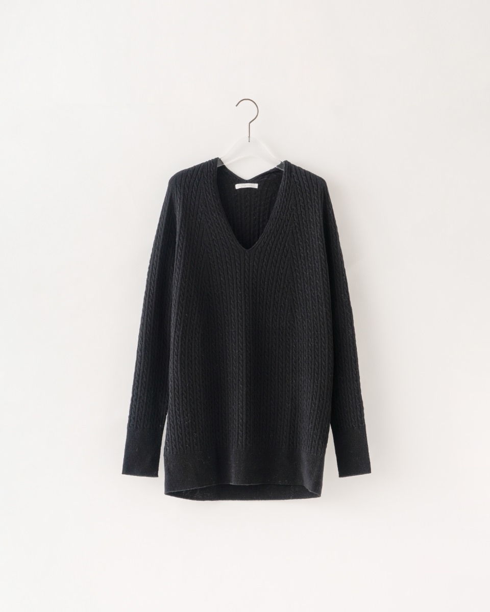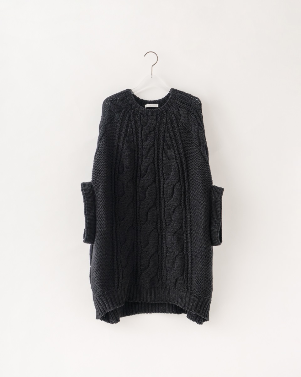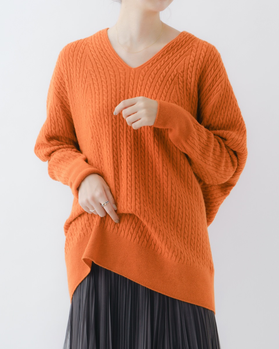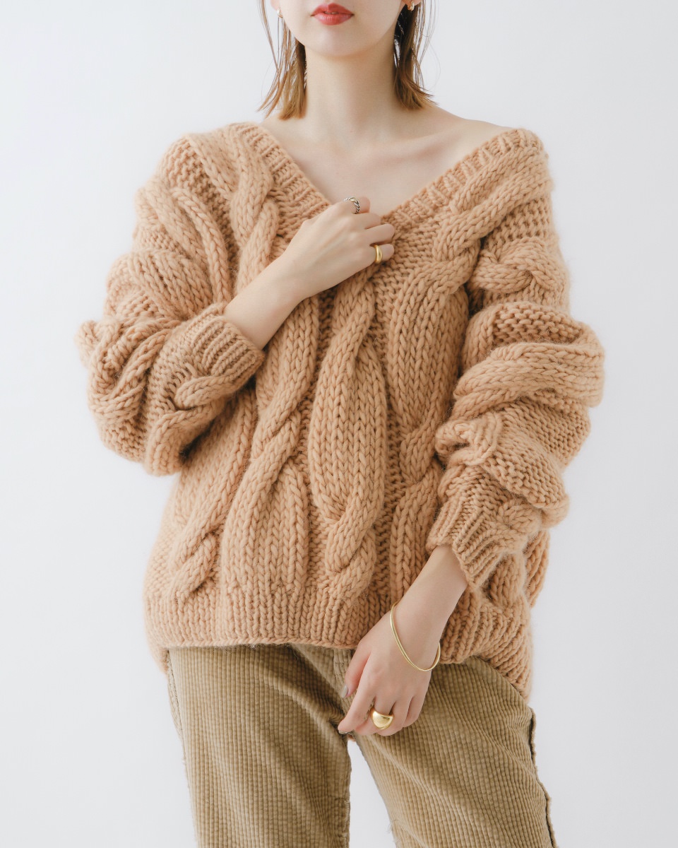クラシカルなケーブル柄が新鮮な1枚。カラーの発色も良く1枚で着映えするのでデニムなどシンプルなボトムにも◎。立体感のある編地ながらにもたつかないすっきりとしたシルエットに仕上げました。