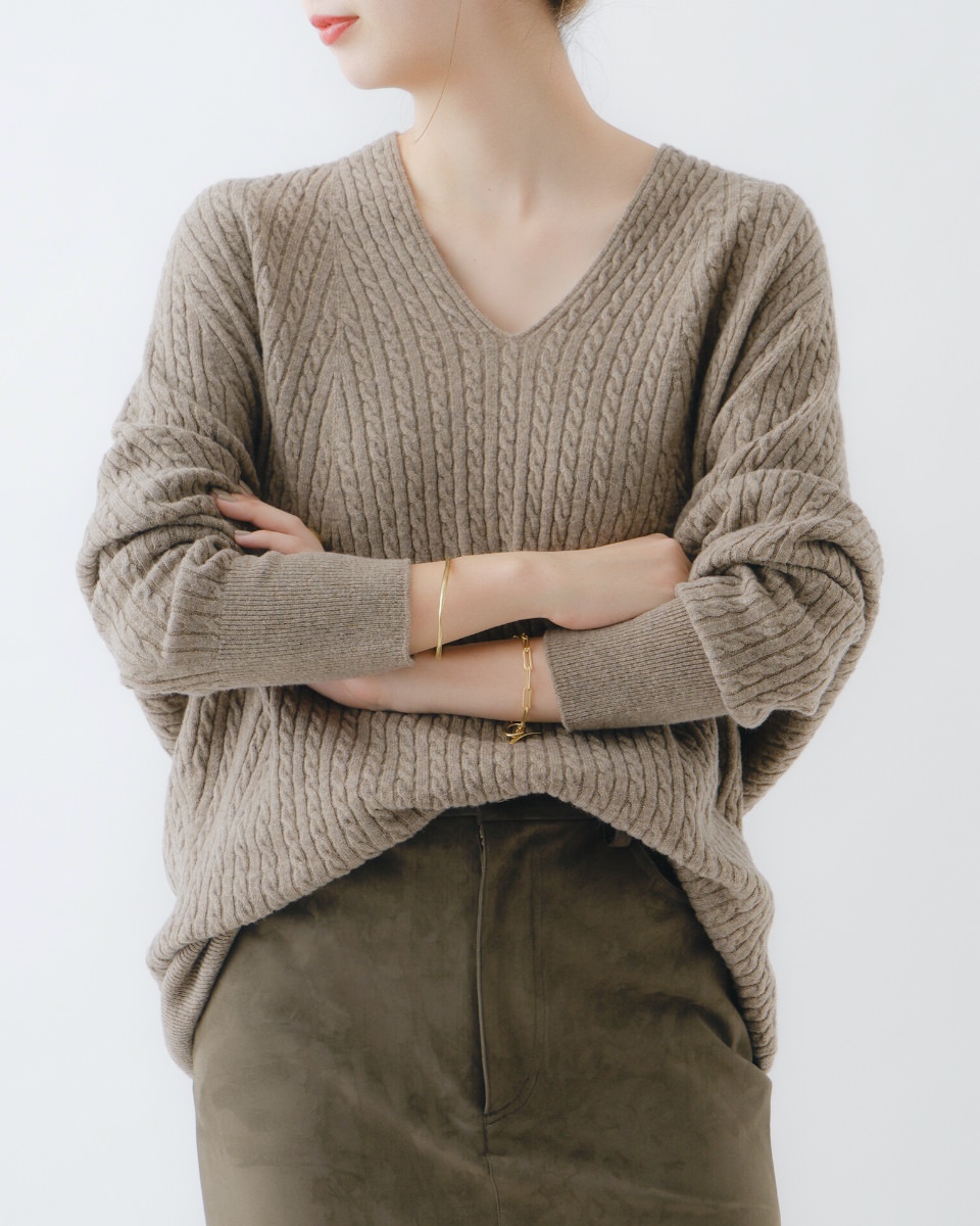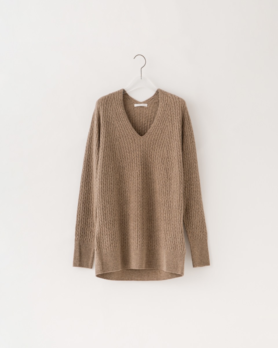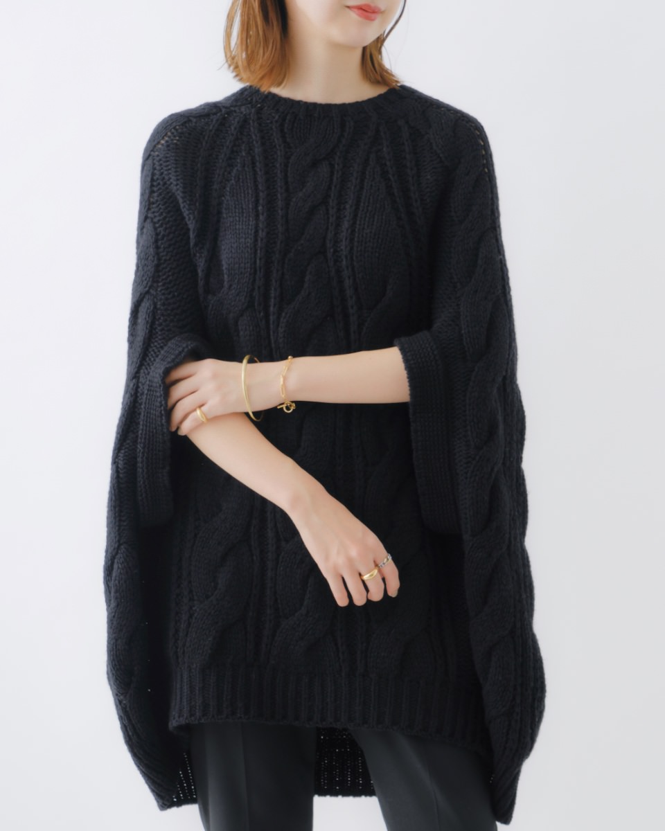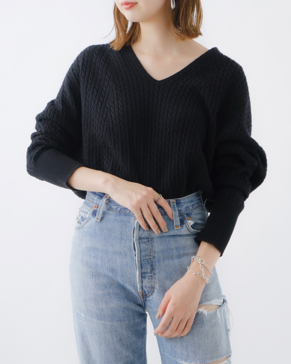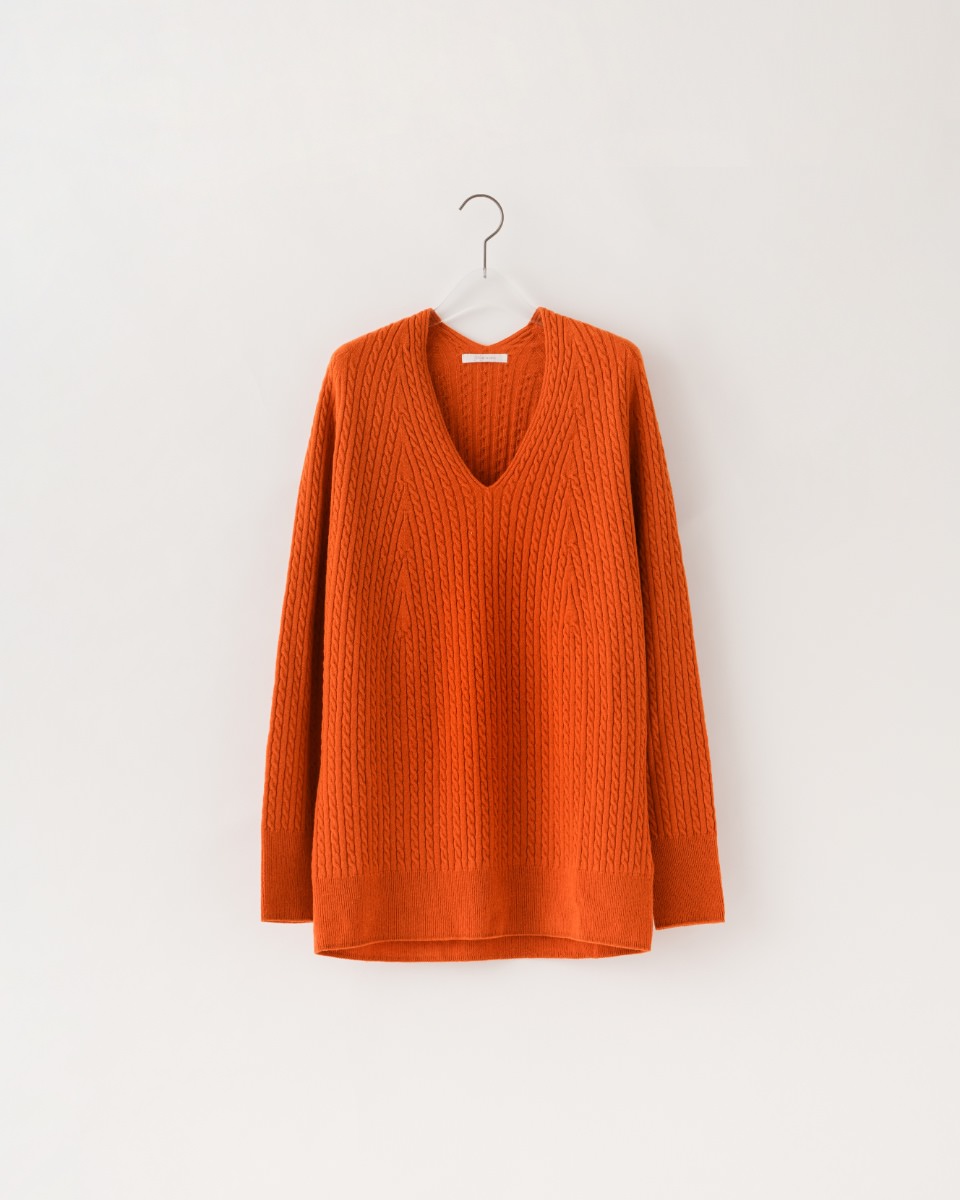 クラシカルなケーブル柄が新鮮な1枚。カラーの発色も良く1枚で着映えするのでデニムなどシンプルなボトムにも◎。立体感のある編地ながらにもたつかないすっきりとしたシルエットに仕上げました。