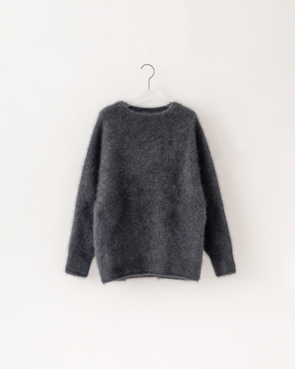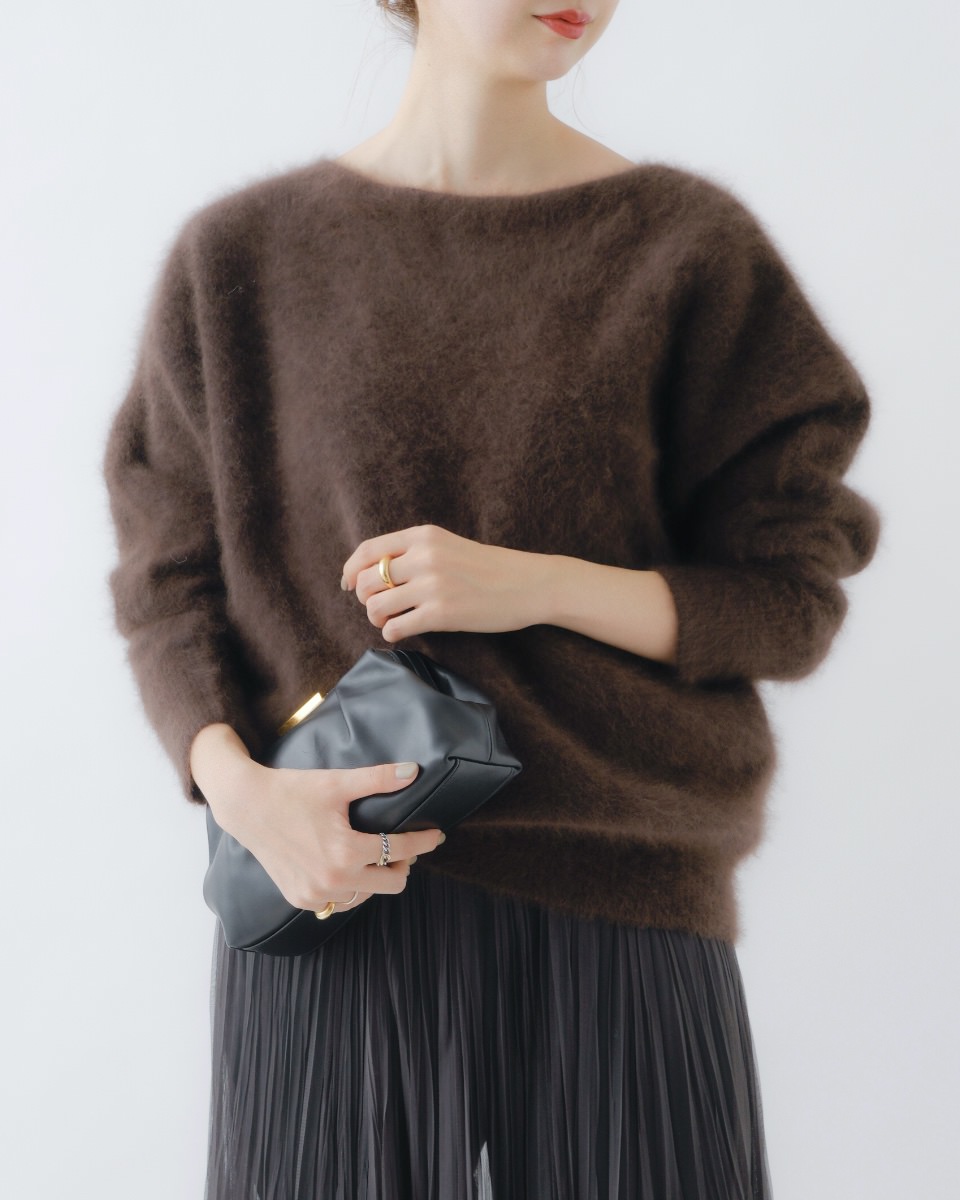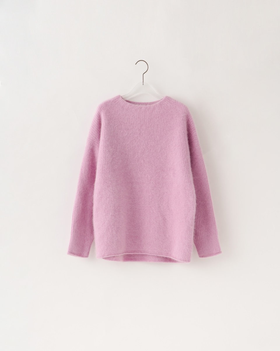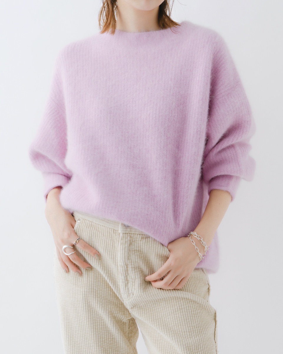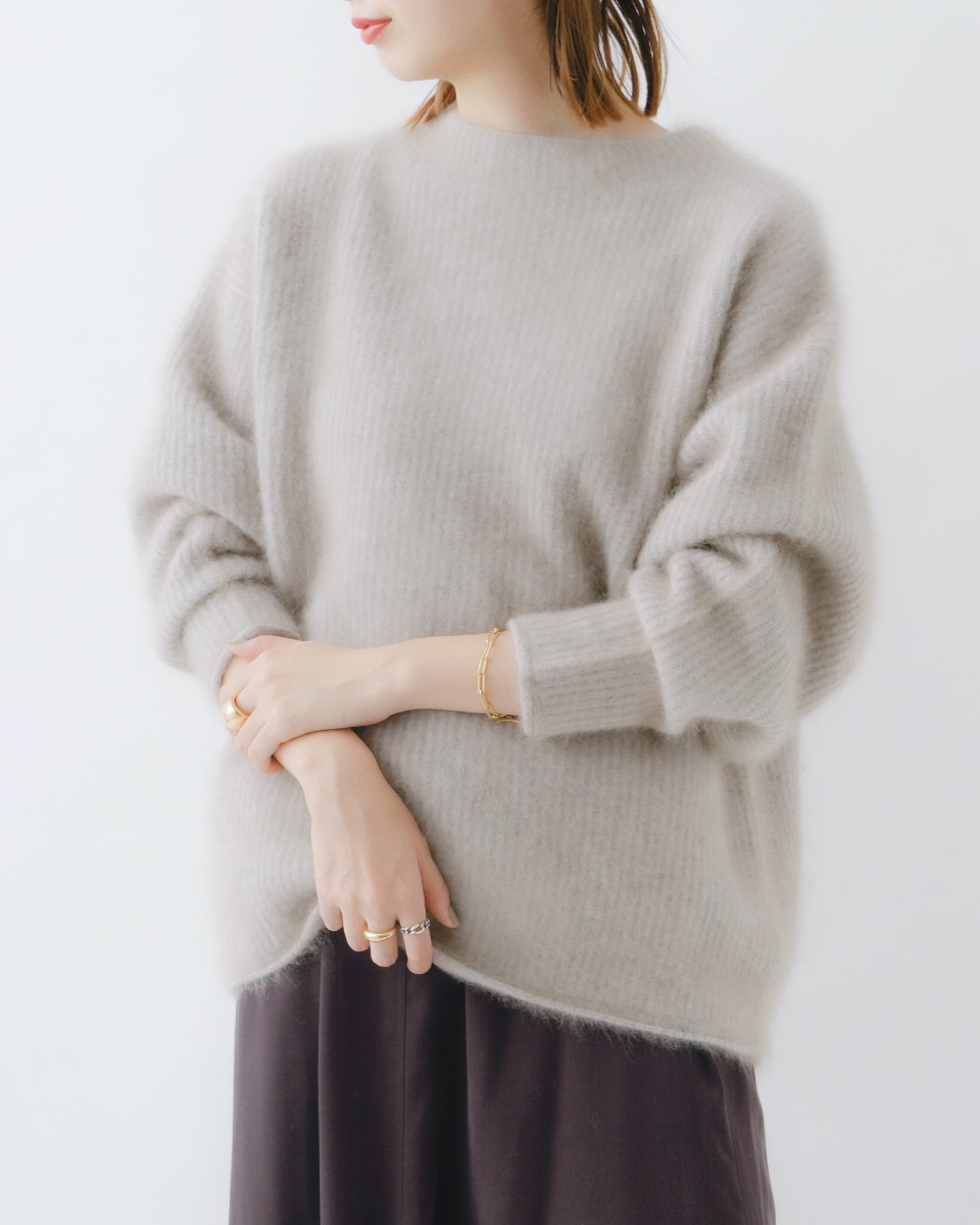 昨年大人気だったFur畦編みニットと同じ素材を使用し暖かな厚みのあるニットです。ゆったりとしたデザインながらに今年はスッキリと見えるようボートネックにリモデルしました。袖を少しまくって手首を出した着こなしがおすすめ。