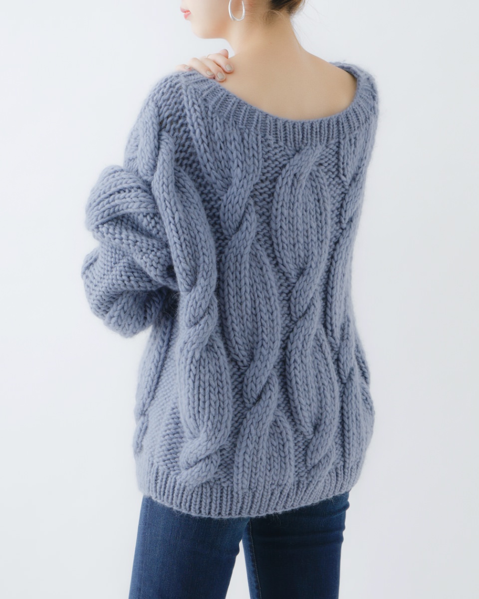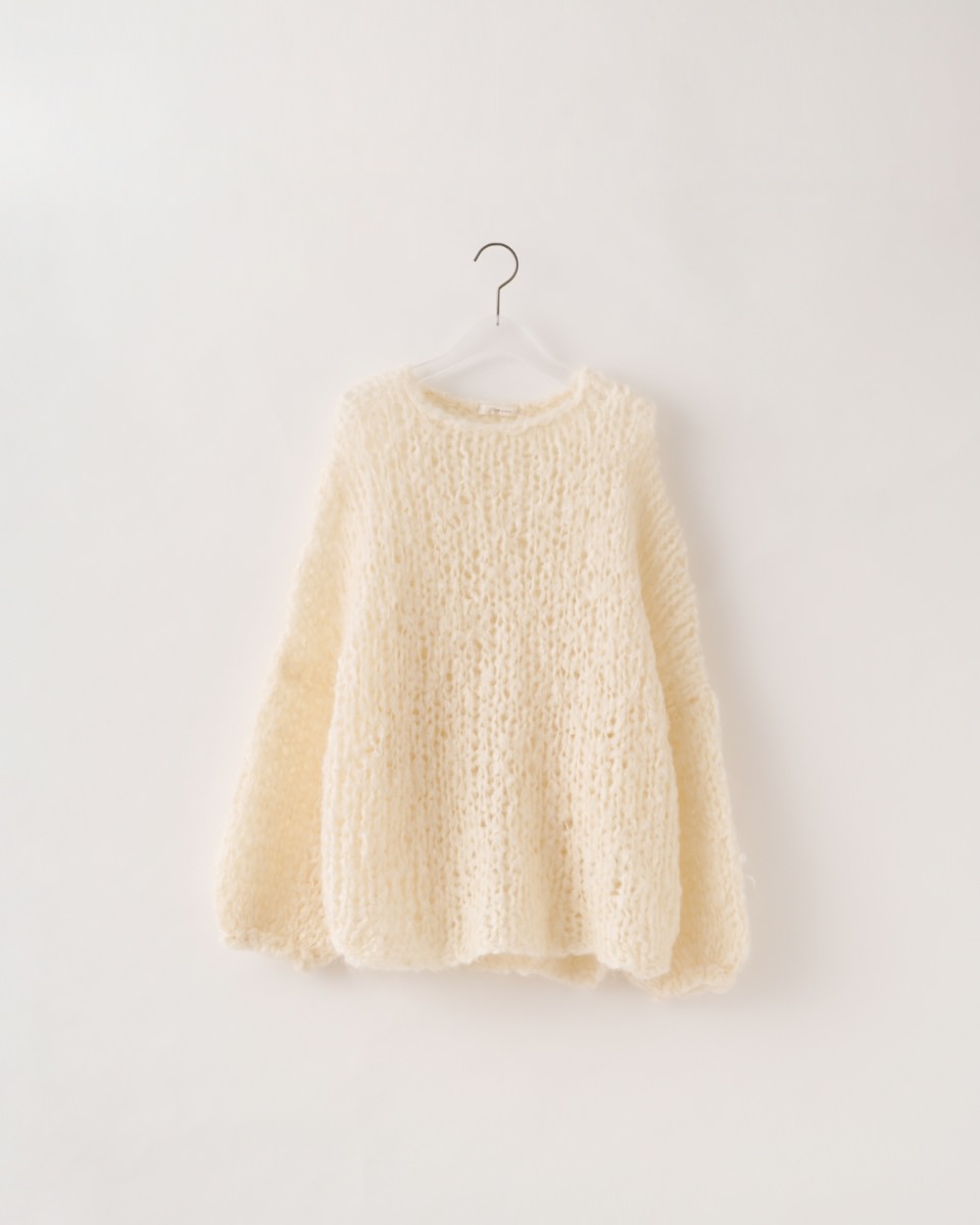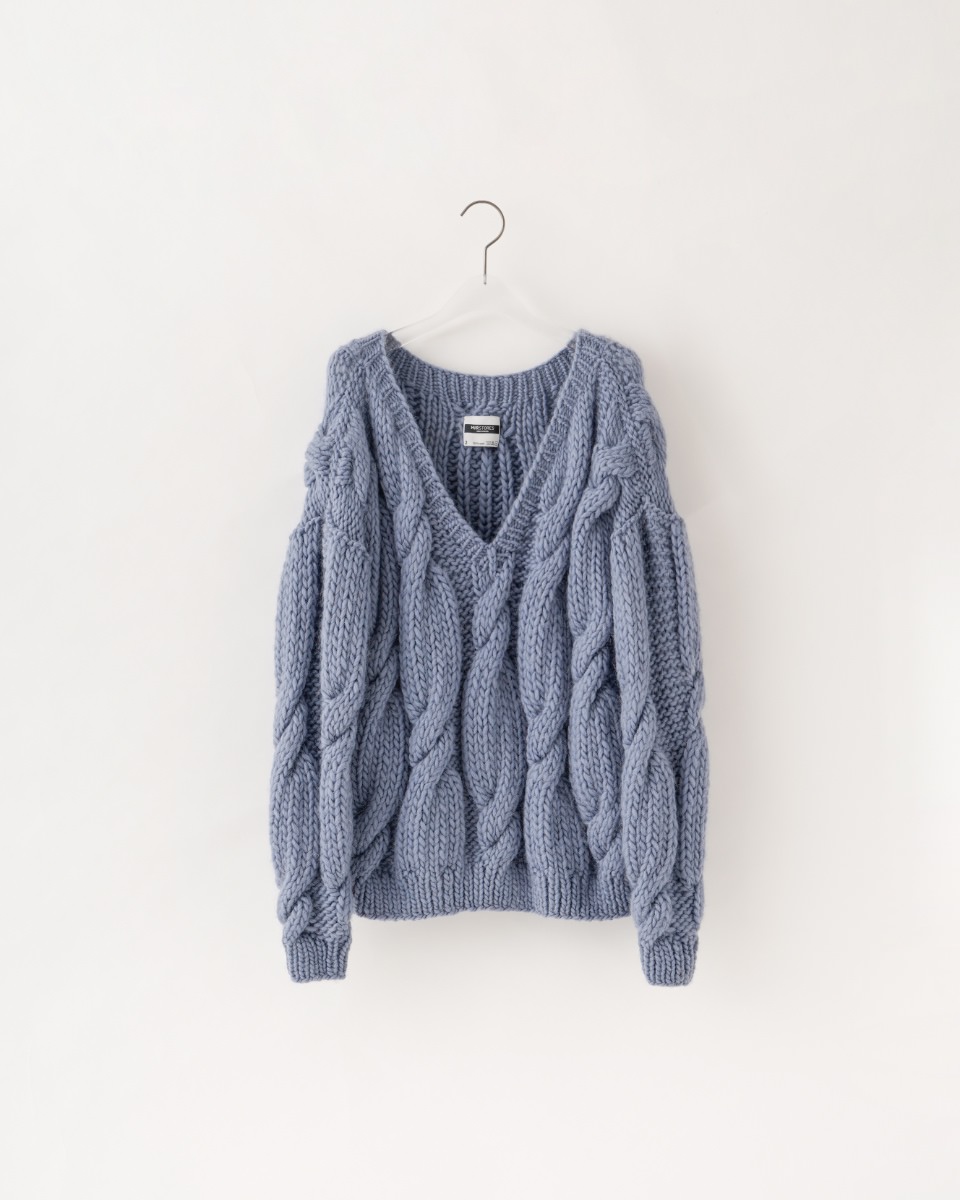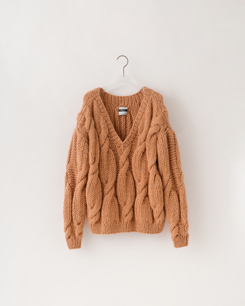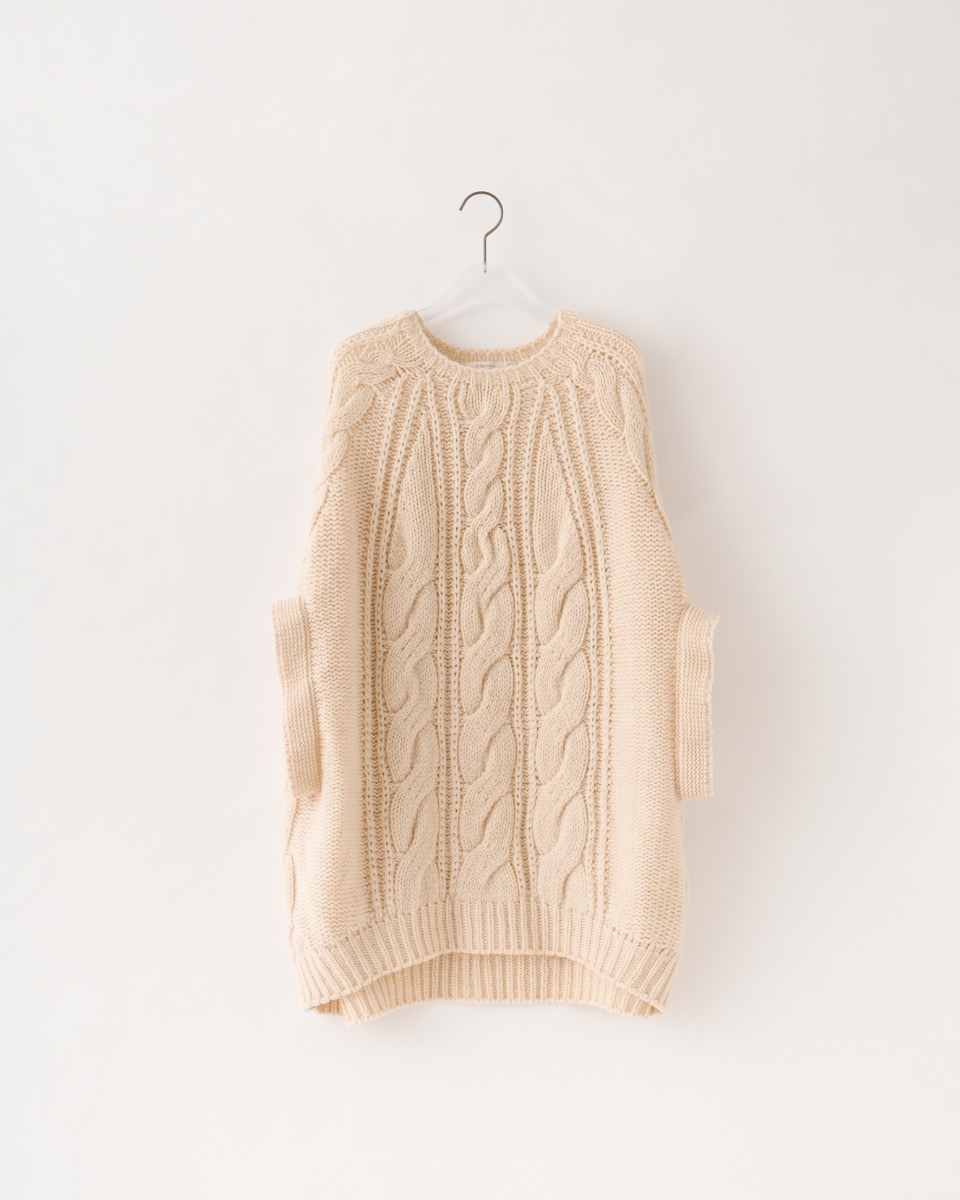 ロシアのブランドMIRSTORESに別注したニット。ふっくらとした糸と他にはなかなかない特徴的なケーブル模様がポイント。ボリュームがある分少し抜け感が出るようにネックデザインやバランスを調整しました。1枚で様になる主役ニットです。