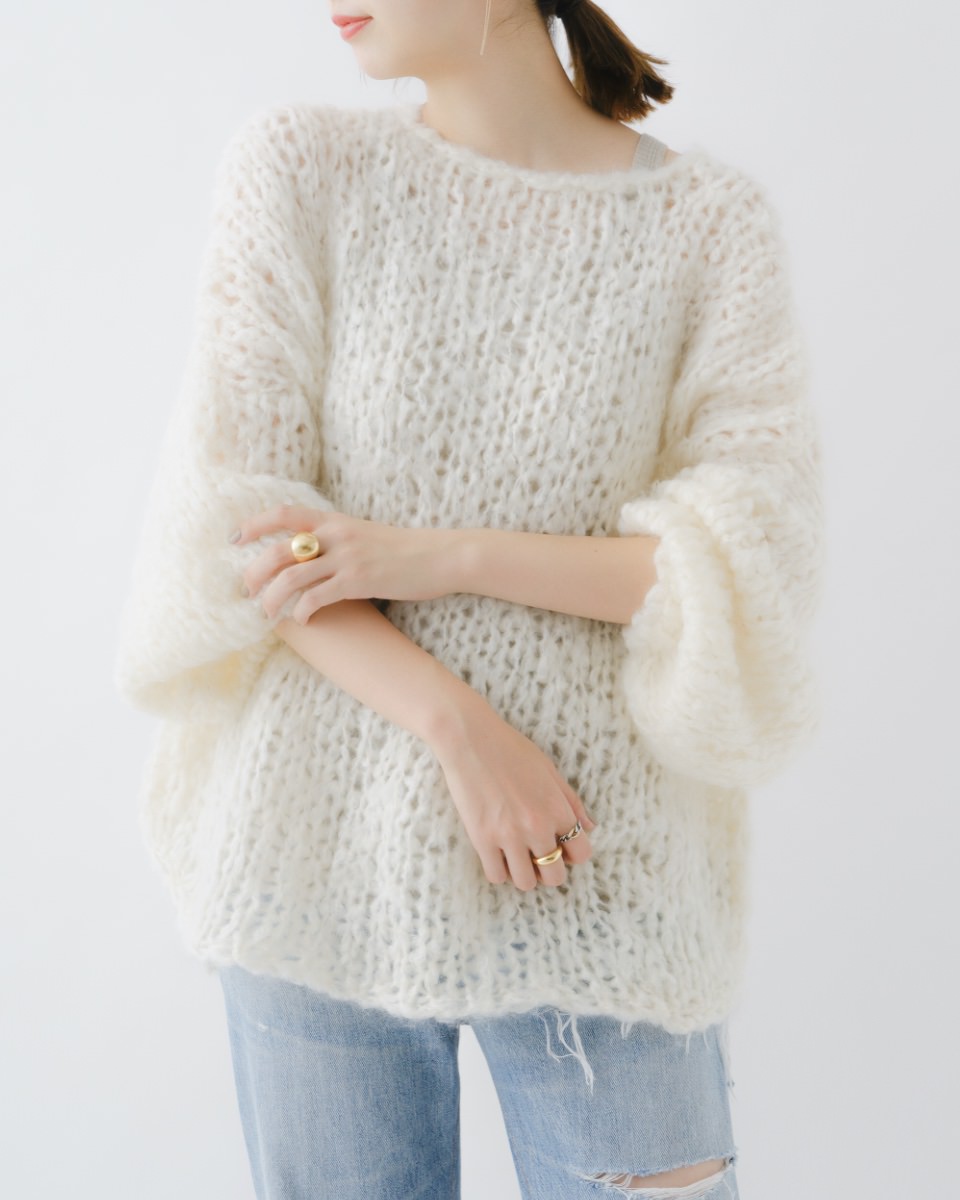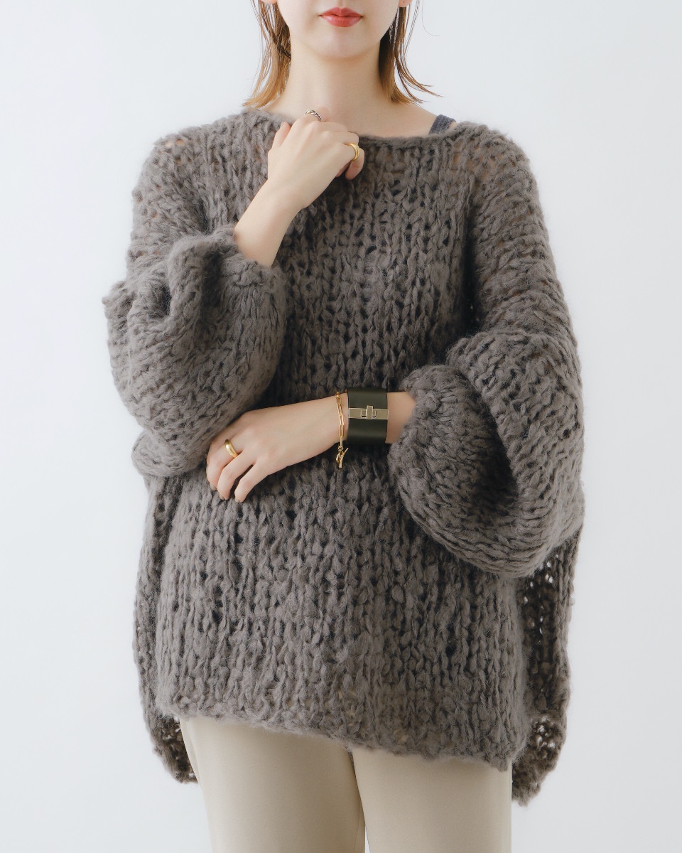 既に予約にてご好評いただいているこちらのニットは透け感があるので秋から着れる1枚です。ざっくりとした編地でボリュームがありますが様々なボトムに合わせられるように着丈やバランスを調整しています。