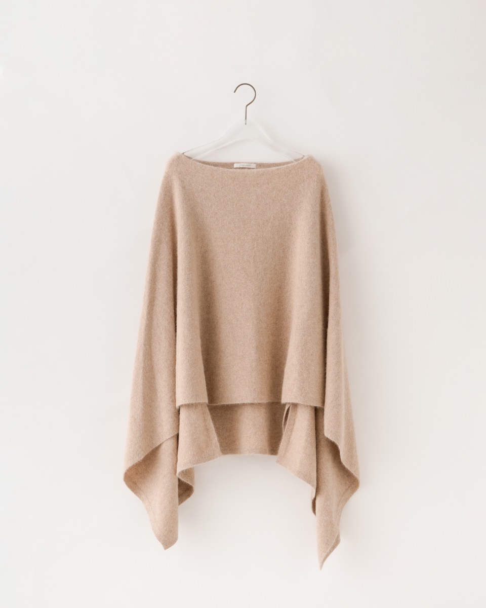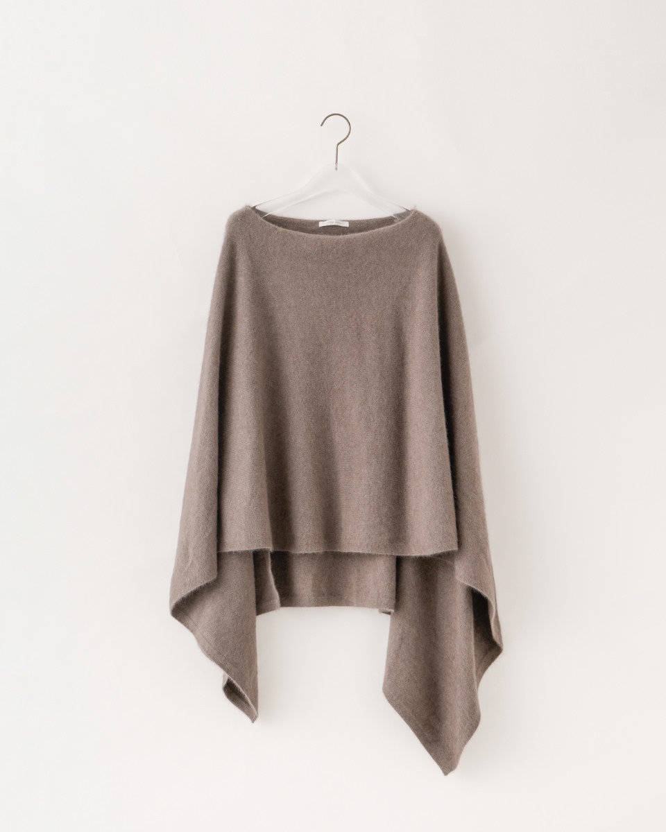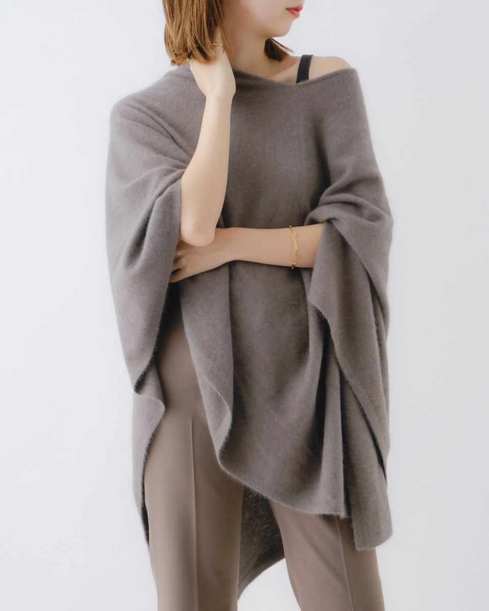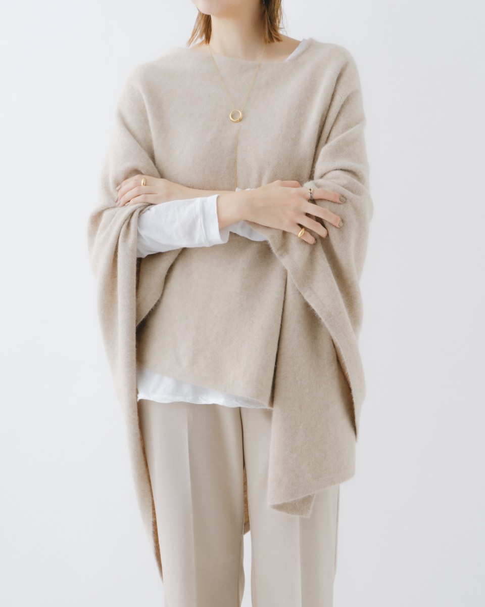 ボートネックでシンプルに仕上げたケープ型のプルオーバー。ふんわりとした柔らかい毛が特徴のフォックスが入った糸を使用しているのでアルパカなど他の毛足のある素材に比べて少し上品さがあるのが特徴です。ストールを巻いているかのようなエレガントなデザインで、そのままボートネックに着たり、オフショルにしたり、左右にずらしたり、、と好きなようにアレンジができます。冬はスヌードのように巻けばコートとの相性も◎