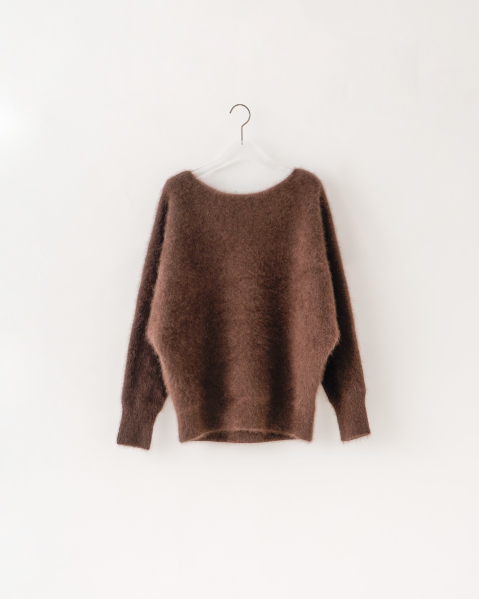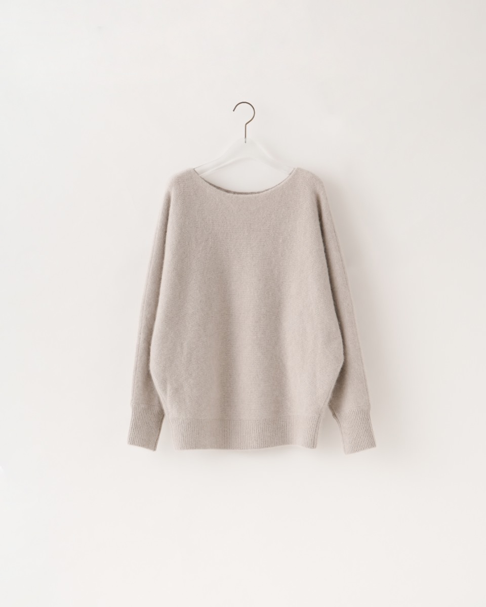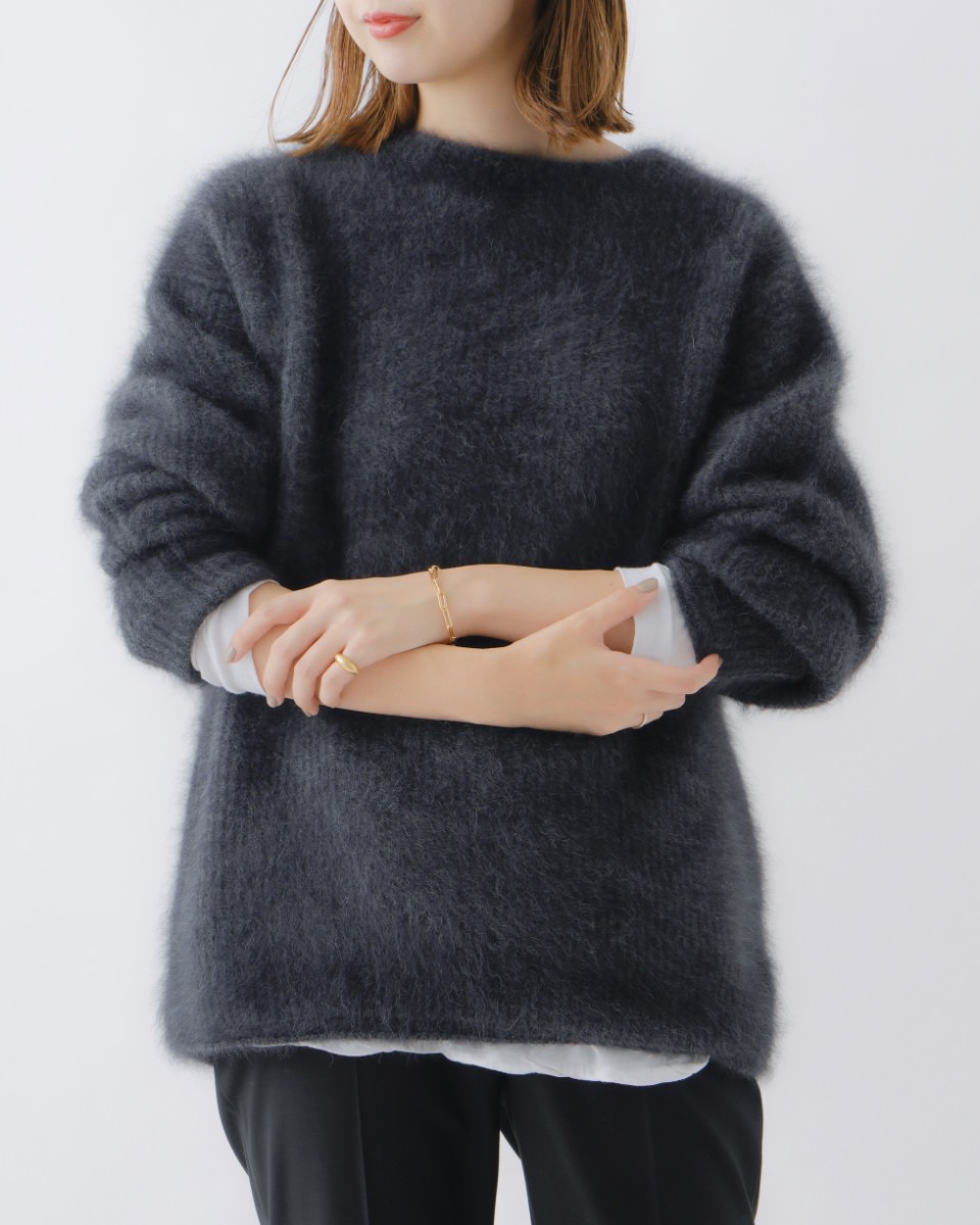 ボートネックでシンプルに仕上げたケープ型のプルオーバー。ふんわりとした柔らかい毛が特徴のフォックスが入った糸を使用しているのでアルパカなど他の毛足のある素材に比べて少し上品さがあるのが特徴です。ストールを巻いているかのようなエレガントなデザインで、そのままボートネックに着たり、オフショルにしたり、左右にずらしたり、、と好きなようにアレンジができます。冬はスヌードのように巻けばコートとの相性も◎