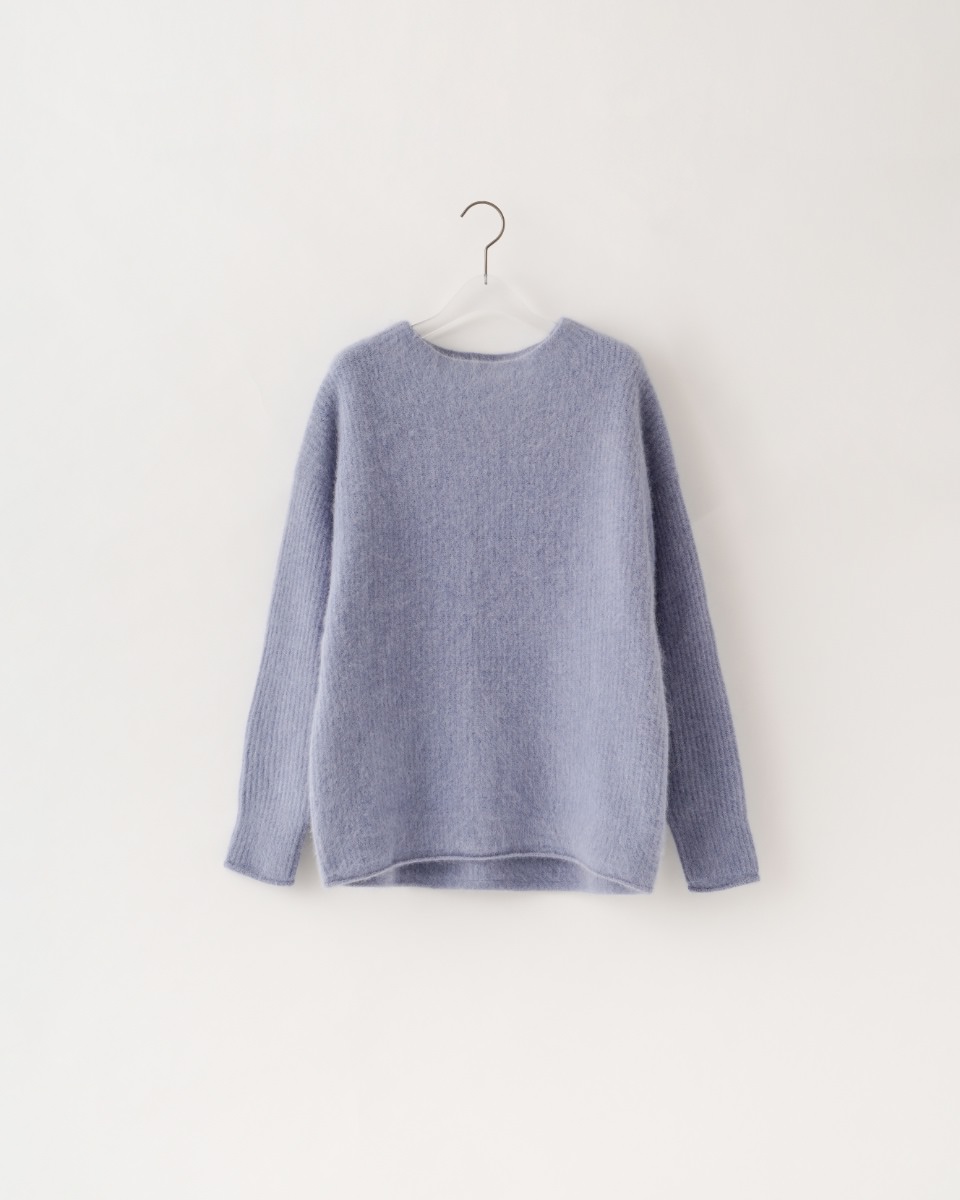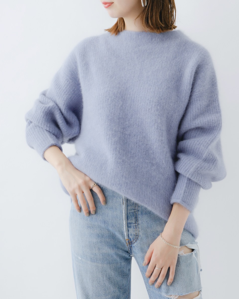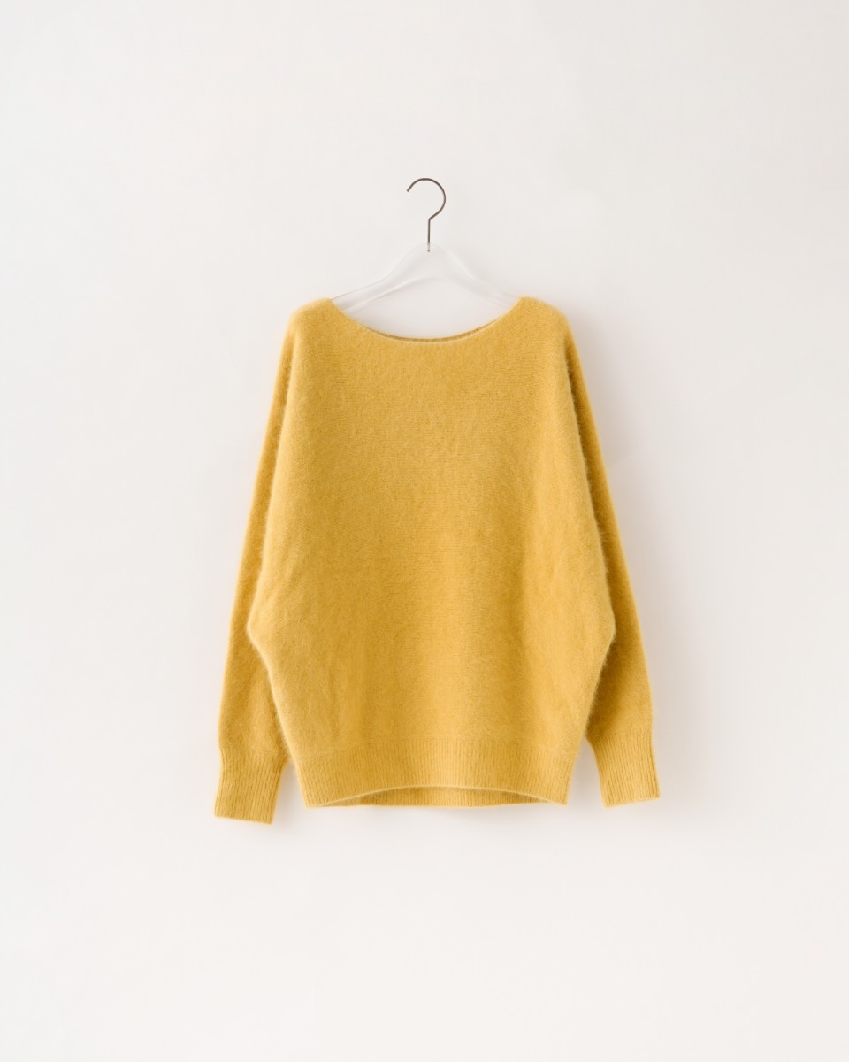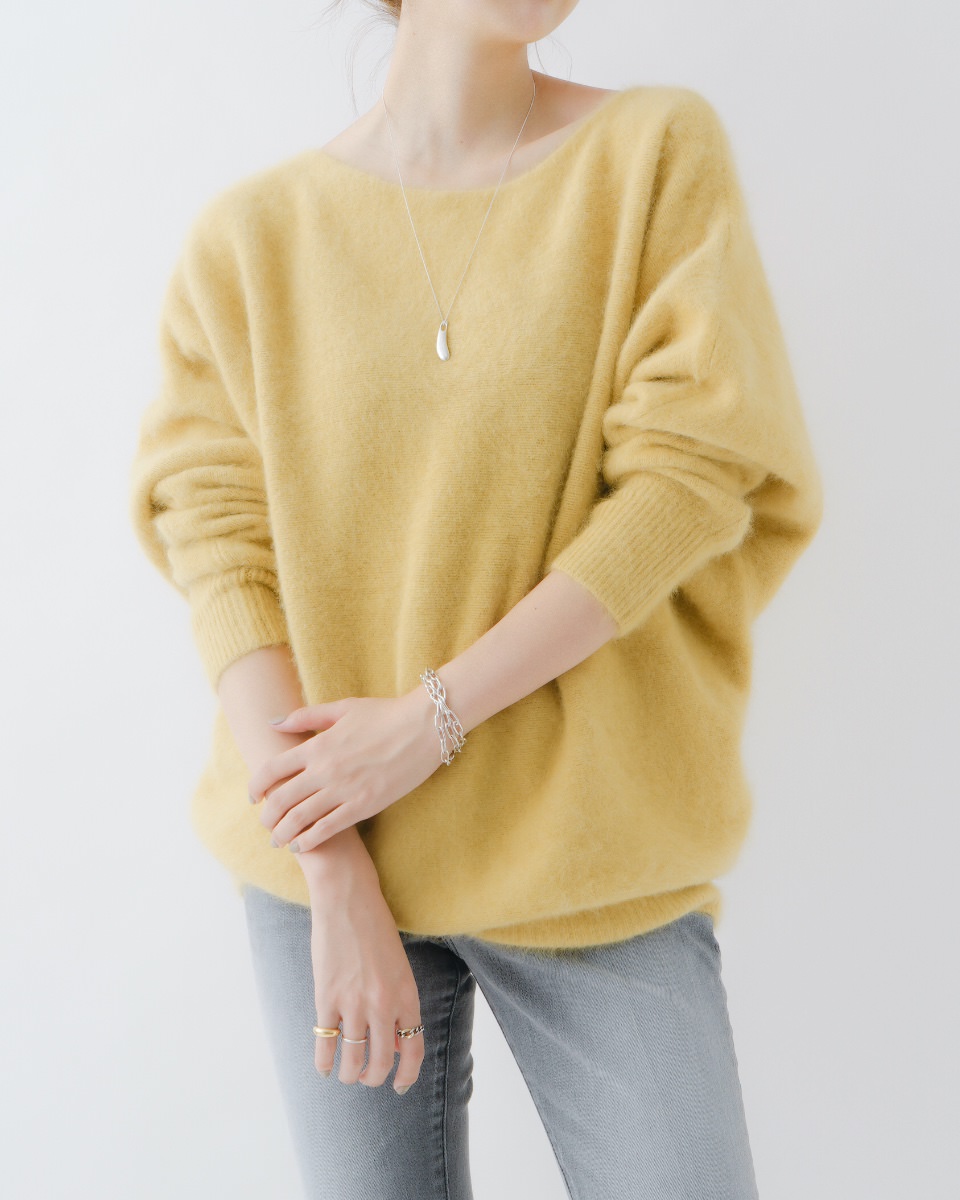 ボートネックでシンプルに仕上げたケープ型のプルオーバー。ふんわりとした柔らかい毛が特徴のフォックスが入った糸を使用しているのでアルパカなど他の毛足のある素材に比べて少し上品さがあるのが特徴です。ストールを巻いているかのようなエレガントなデザインで、そのままボートネックに着たり、オフショルにしたり、左右にずらしたり、、と好きなようにアレンジができます。冬はスヌードのように巻けばコートとの相性も◎