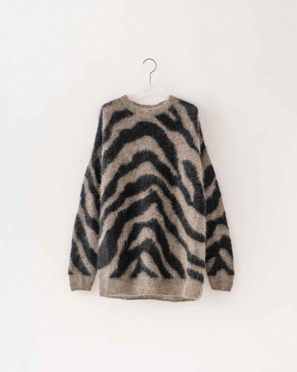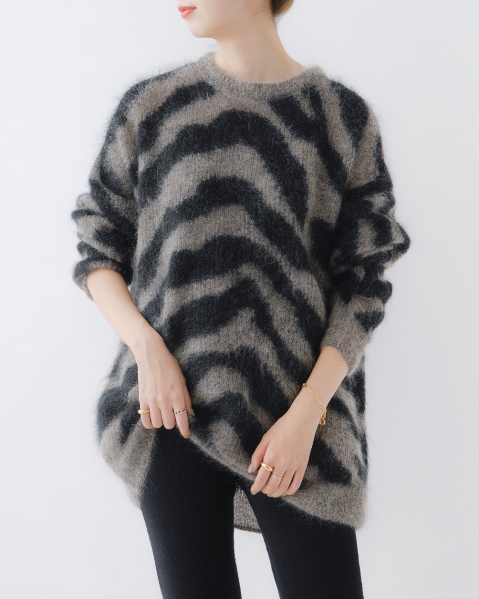 目を惹くゼブラ柄のニット。上質なモヘアを使用しているので肌触りが良い上にすっきりとしていて着やすい1枚です。ゆったり大き目のシルエットが可愛く、シンプルなボトムスに合わせても、上からアウターを重ねても映えるニットです。