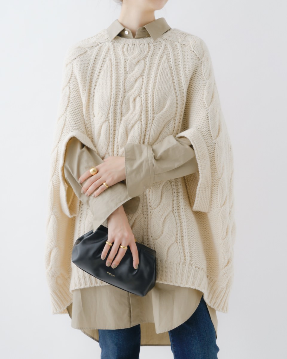 今年注目のケープ型ニット。軽くて肌触りの良い紡毛糸を使用しているので着心地も◎ざっくりとしたハンドニットの様な編地がポイントで、コクーンシルエットなのでサイドから見ても可愛いです。タートルネックのPOやシャツなどと合わせて初秋からお召しいただけます。