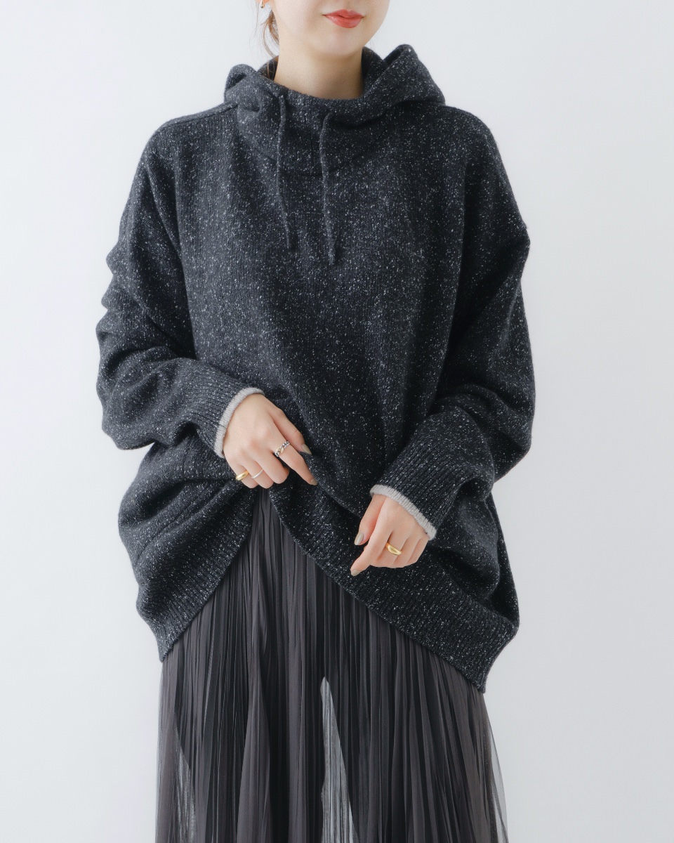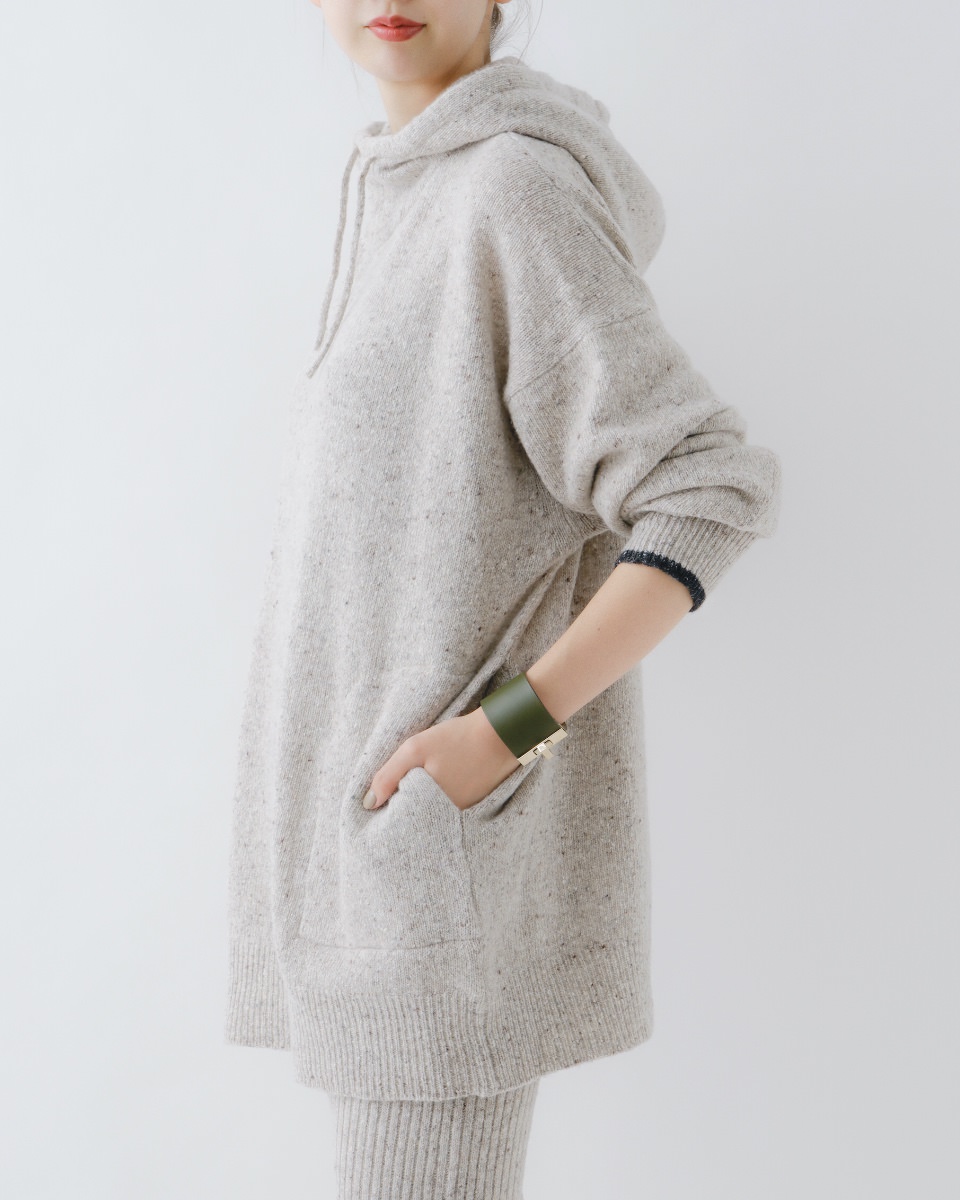 メンズサイズのワイドなシルエットのパーカーをニットで作りました。ポケットがついているのもうれしいポイント。カラフルなシルクネップ素材で表情感があるニットです。セットのパンツもおすすめ。