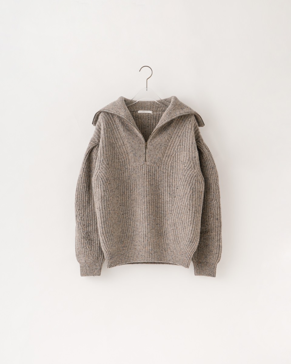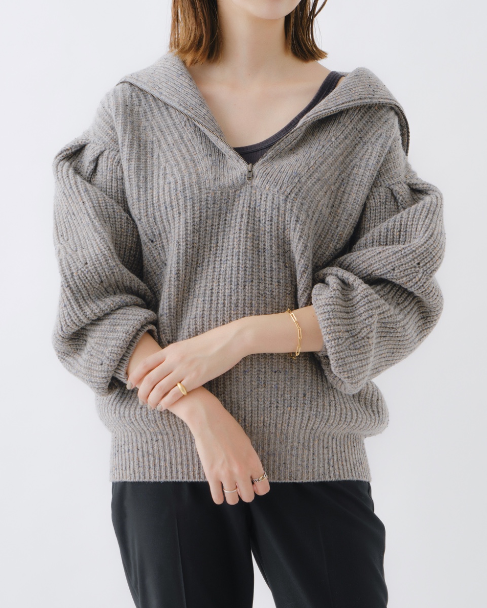 様々な色の糸を混ぜた畦編みの立体感のあるニット。ジップが付いていて開き具合によってシルエットが変化します。深く開けると今年おすすめのセーラーカラーのように。華奢なインナーを合わせて女性らしく着るのがおすすめです◎