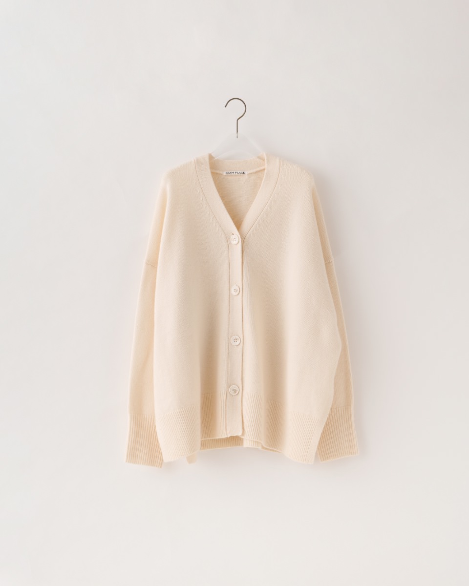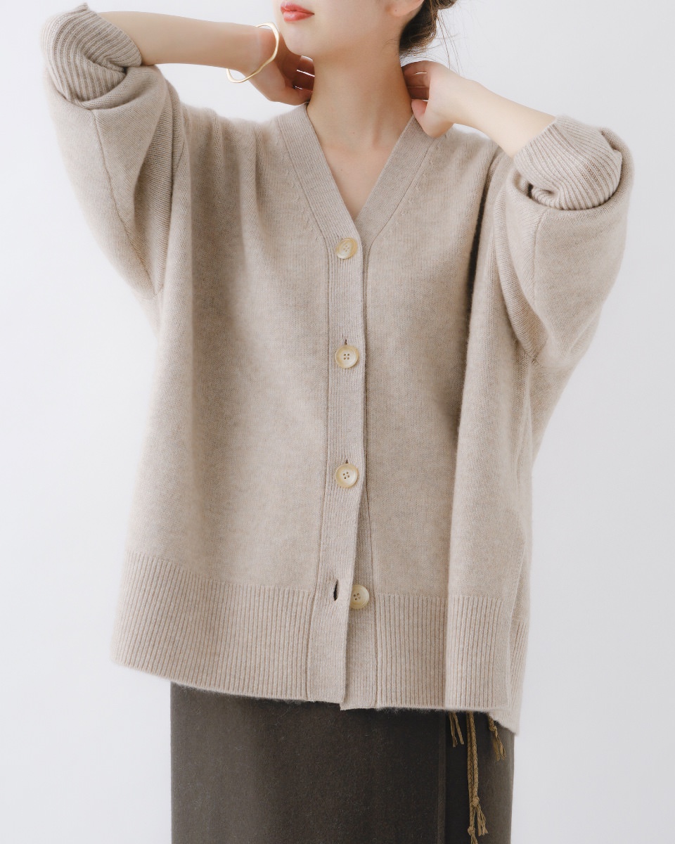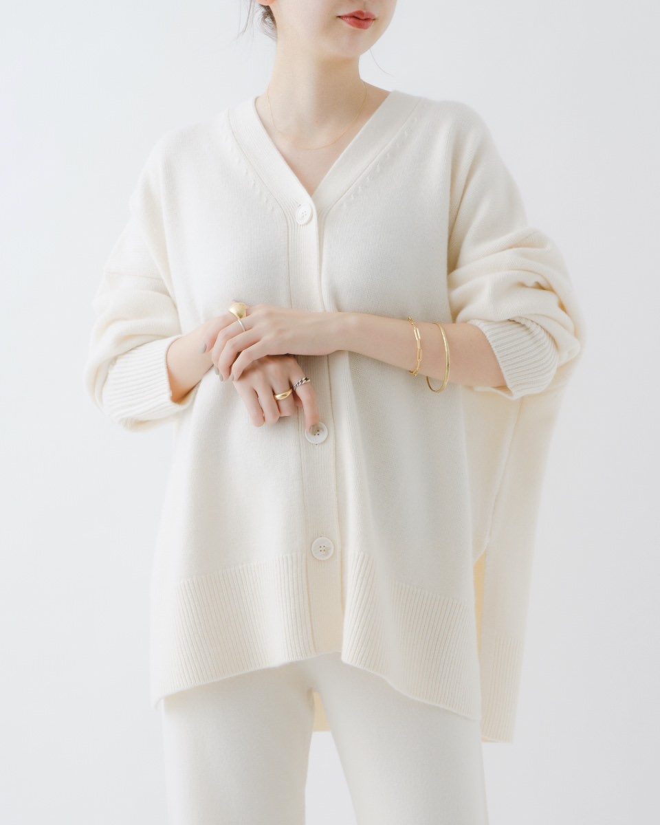 ウールとカシミヤで肌さわりが抜群なうえにおうちでお洗濯もできるニット。同じ素材のニットパンツと合わせて着てもリラックス過ぎない見え感にこだわりました。ボタンの色もクリーンな色に見えるよう調整しすっきりとお召しいただけます。