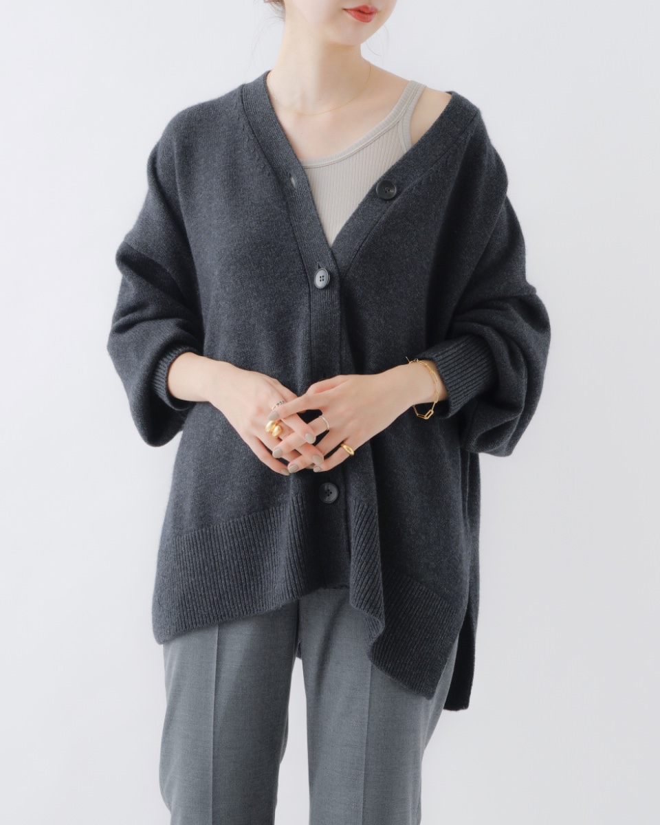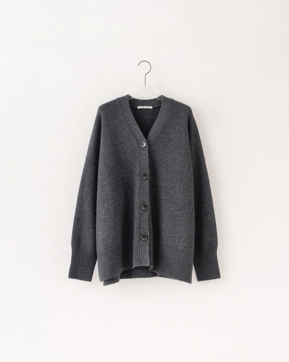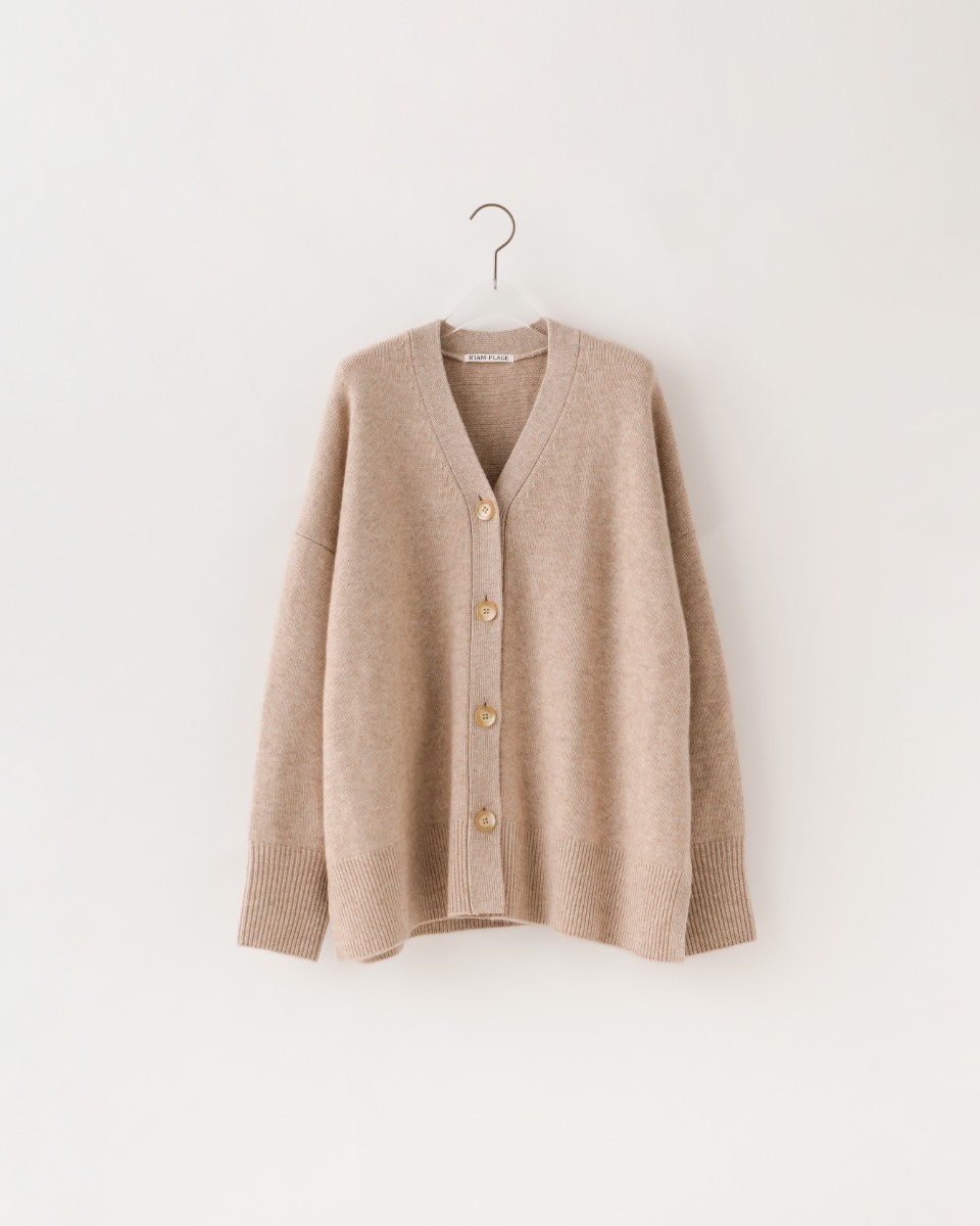 ウールとカシミヤで肌さわりが抜群なうえにおうちでお洗濯もできるニット。同じ素材のニットパンツと合わせて着てもリラックス過ぎない見え感にこだわりました。ボタンの色もクリーンな色に見えるよう調整しすっきりとお召しいただけます。