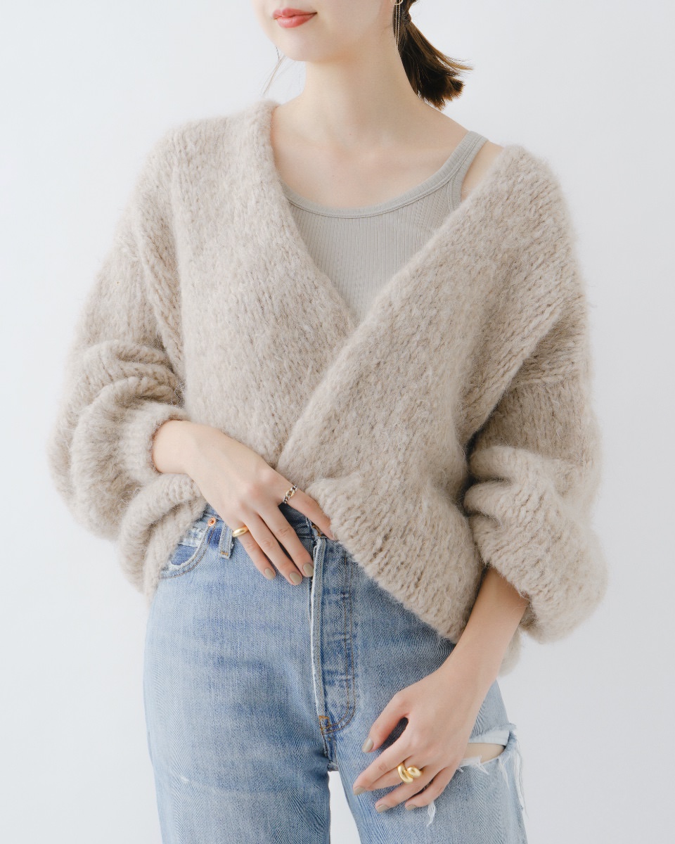 日本ではPlageのみの取り扱いブランド『LOLA ME』のニット。ざっくりとしたカーディガンですがカシュクールのようにしてプルオーバーとしても着ることができます。柔らかな風合いでシルエットが綺麗な1枚です。華奢なタンクやカジュアルなカットソーなどスタイリングの幅が広い万能アイテムです。