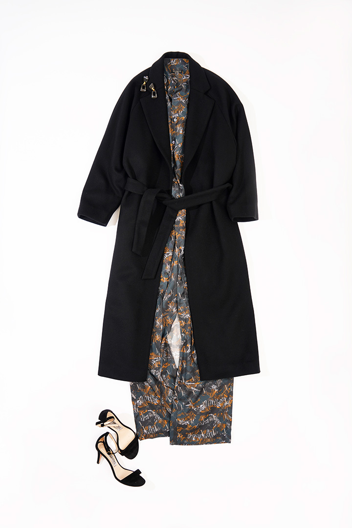 上質なウールで仕立てた、ラップコート。ベルトマークするとマニッシュな雰囲気が引き立ちますが、たっぷりととったサイドスリットが抜け感を演出。このディテールを生かして、インナーはカモフラ柄のパンツセットアップで大人の遊び心を盛り込みたい。