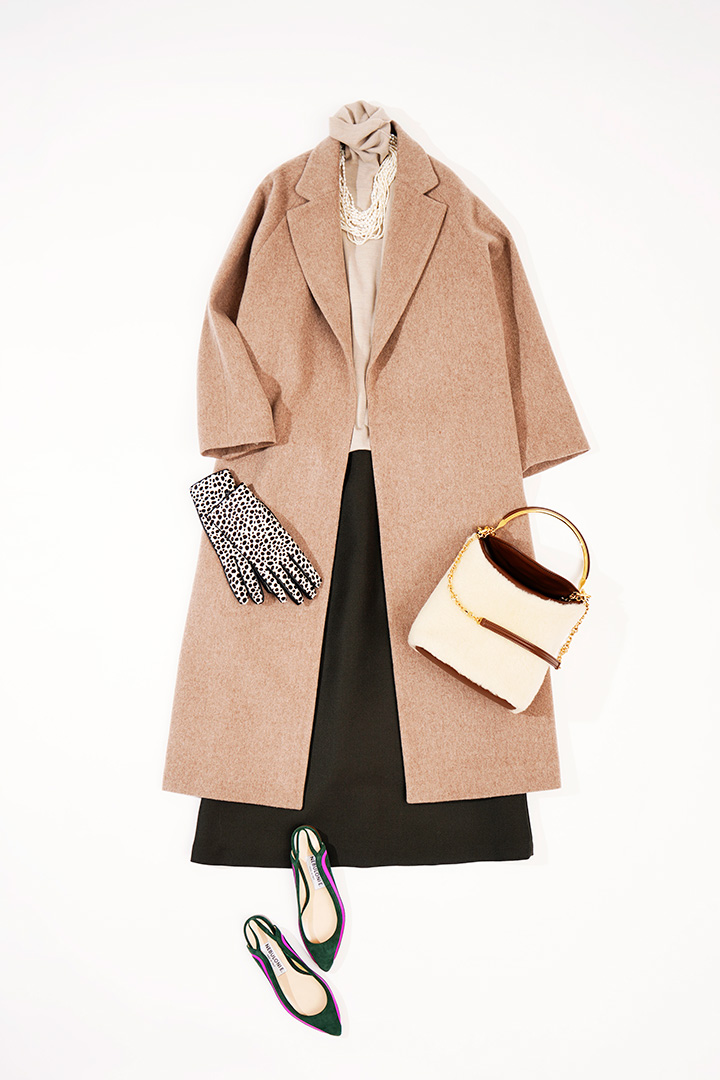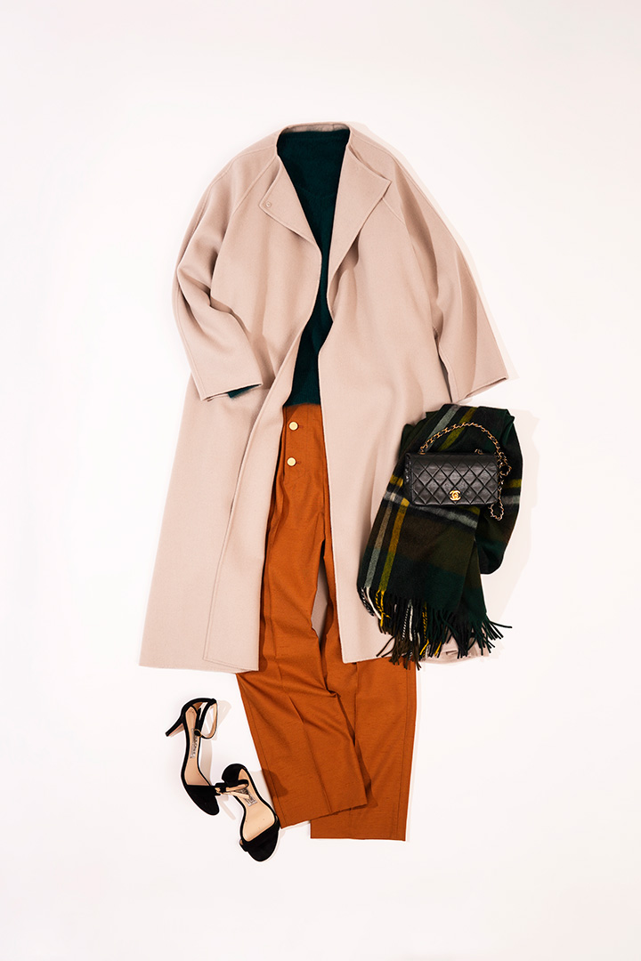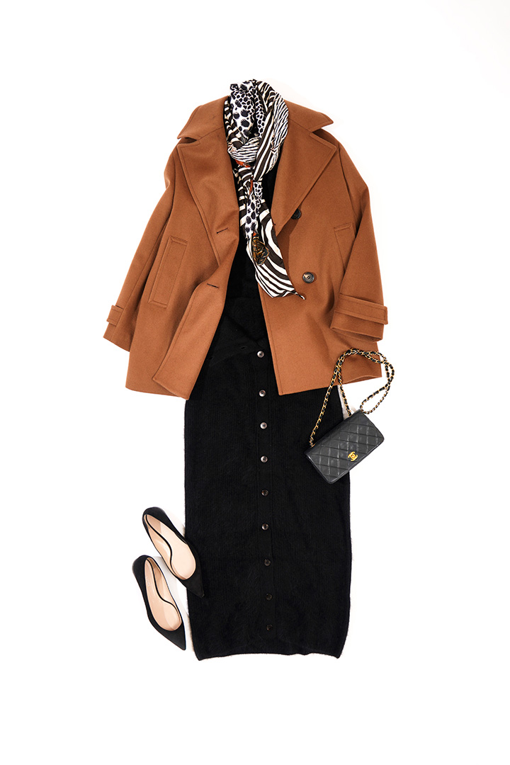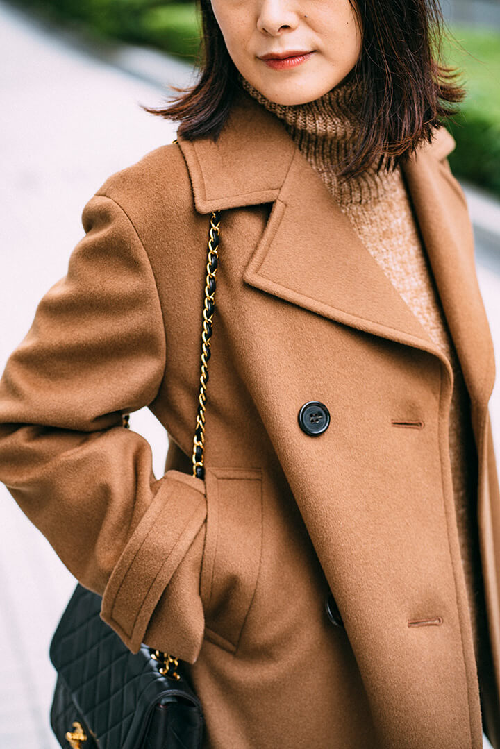 今年らしいクラシックムード満載の、大きなラペルのPコートは軽い着心地で気軽に羽織れるのも嬉しい。ウールカシミヤならではの品の良い艶が、キャメルの上質感をさらに後押しします。インナーはブラックで統一しつつ、トレンドのアニマルスカーフでアクセントを。