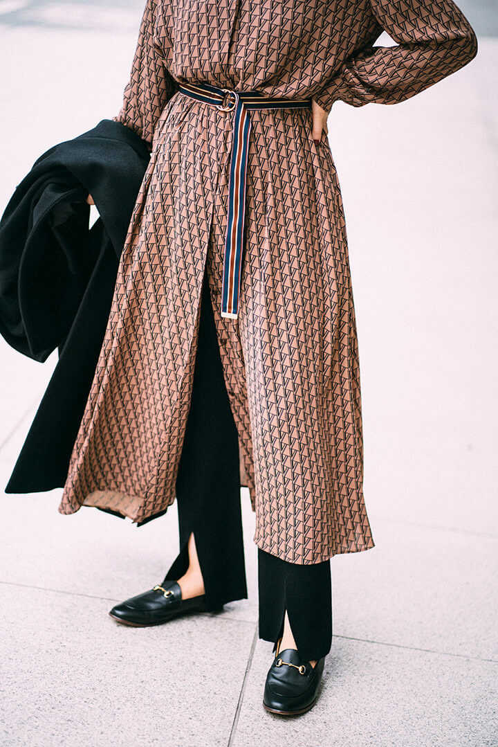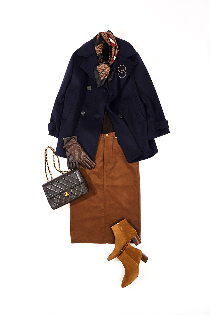 ネイビーとブラウンのカラーコンビネーションは、トラディショナルな雰囲気を醸し出すのにうってつけ。マニッシュなスカーフやフォークロア調のブーツが好相性。大きなフープピアスで顔まわりにも視線を集めて。