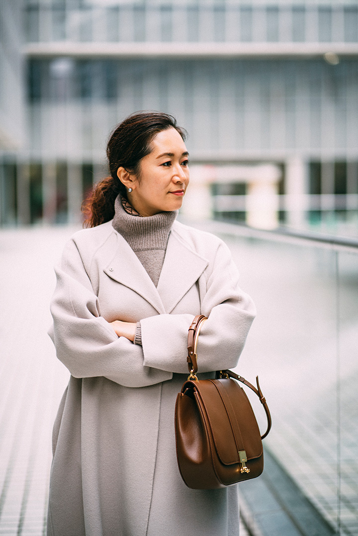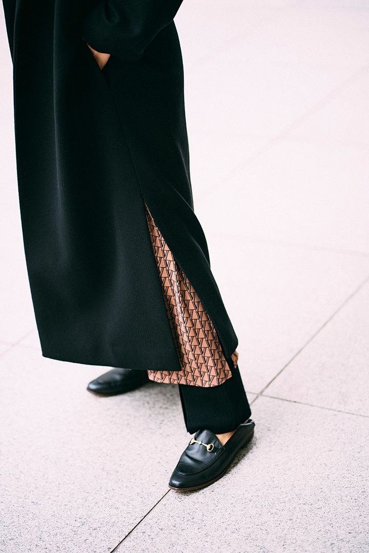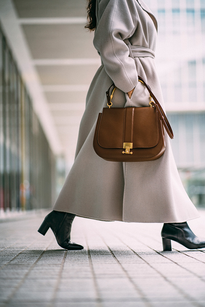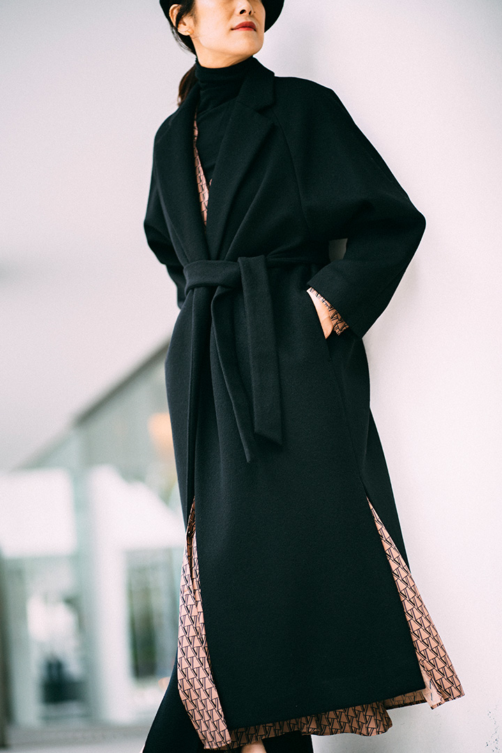 たっぷりとAラインのボリュームをたたえつつ、首回りはノーカラーですっきりとした印象にまとまるリバーコート。サイドスリットから、テラコッタカラーのパンツをのぞかせてさりげなく色を効かせたい。ほかのアイテムはダークトーンで統一して、引き立てて。