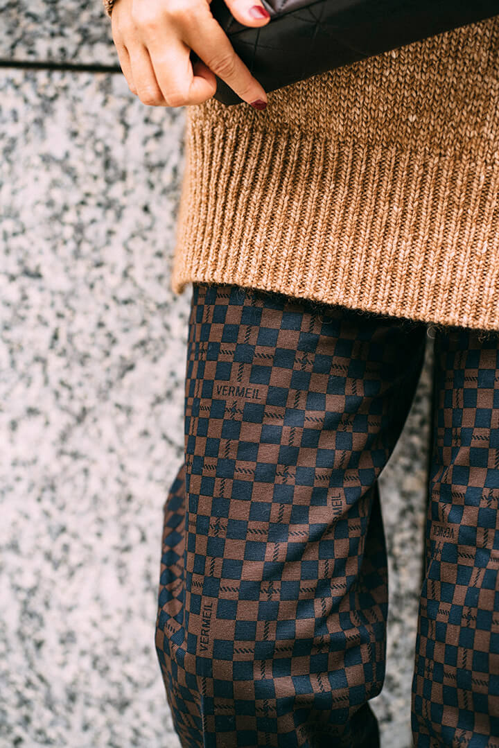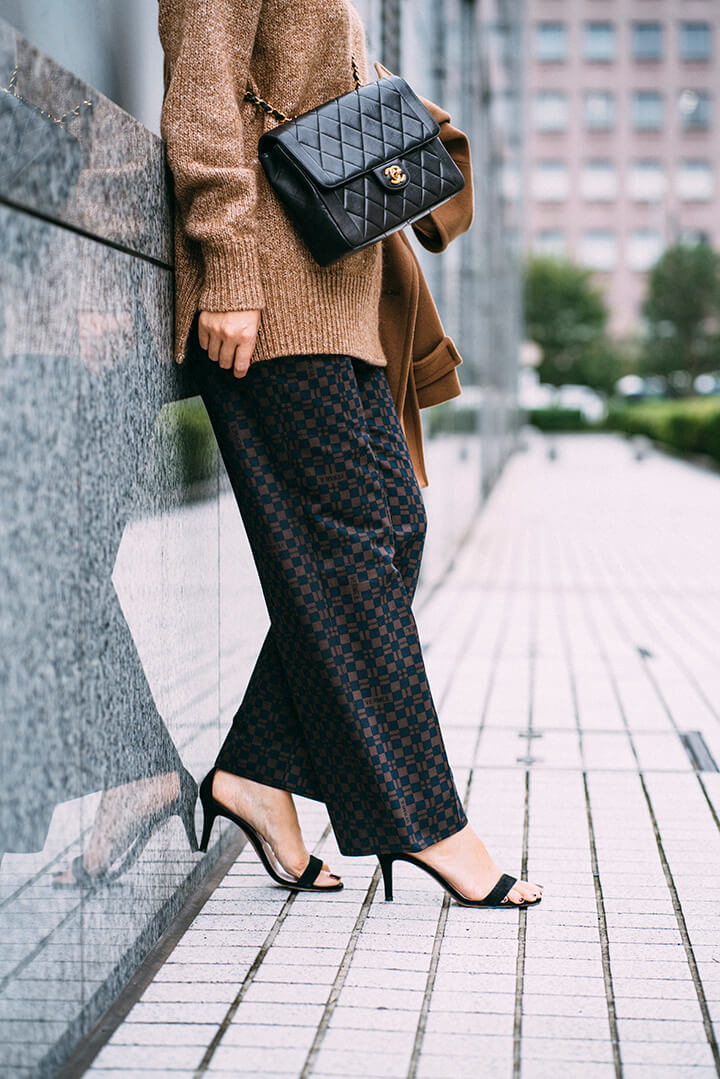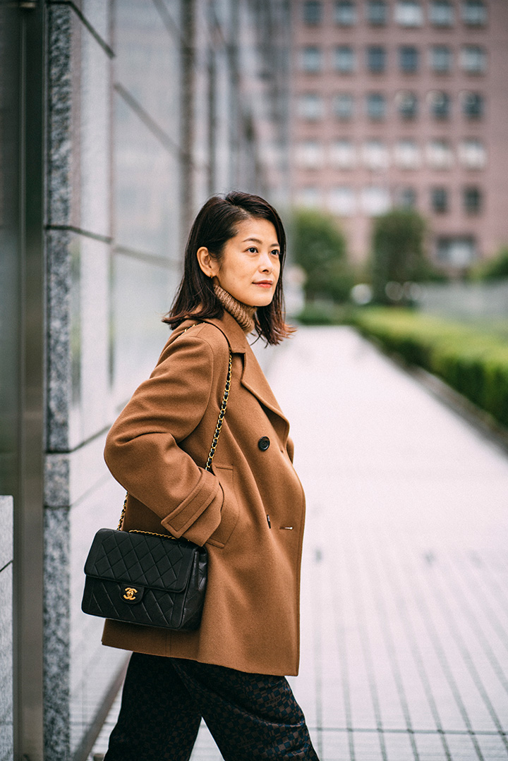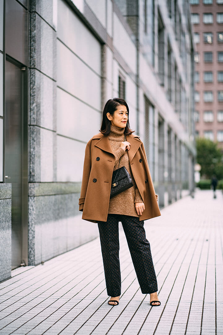 トラッドな印象のキャメルPコートは、ハンサムコーデでまとめつつ大人小物をピリリと効かせてメリハリを。コートと色味を合わせた上質なニットと合わせたのは、ジオメトリック模様のプリントパンツ。仕上げにシャネルバッグでモードなエッセンスも添えて。