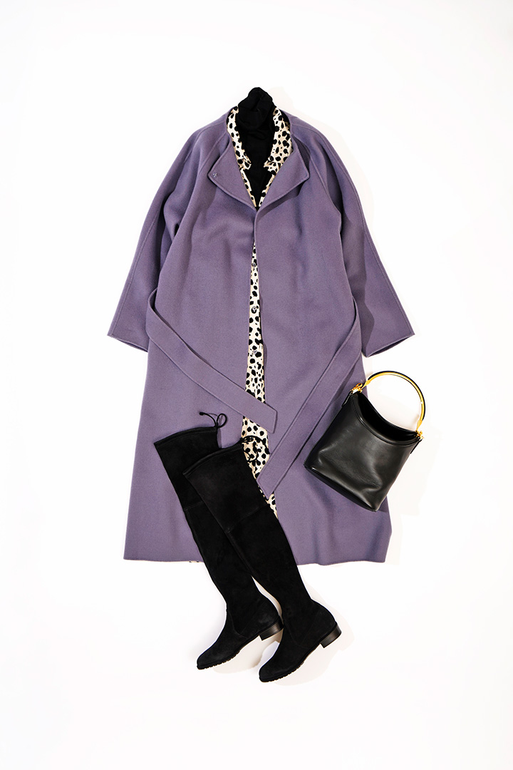 1枚で艶のあるグロッシーなスタイルが完成する、ライラックのカラーをチョイス。レイヤードを楽しめるノーカラーの首もとから、レオパードのシャツワンピをチラリ。トレンドのニーハイブーツで、モードにスタイルアップ。