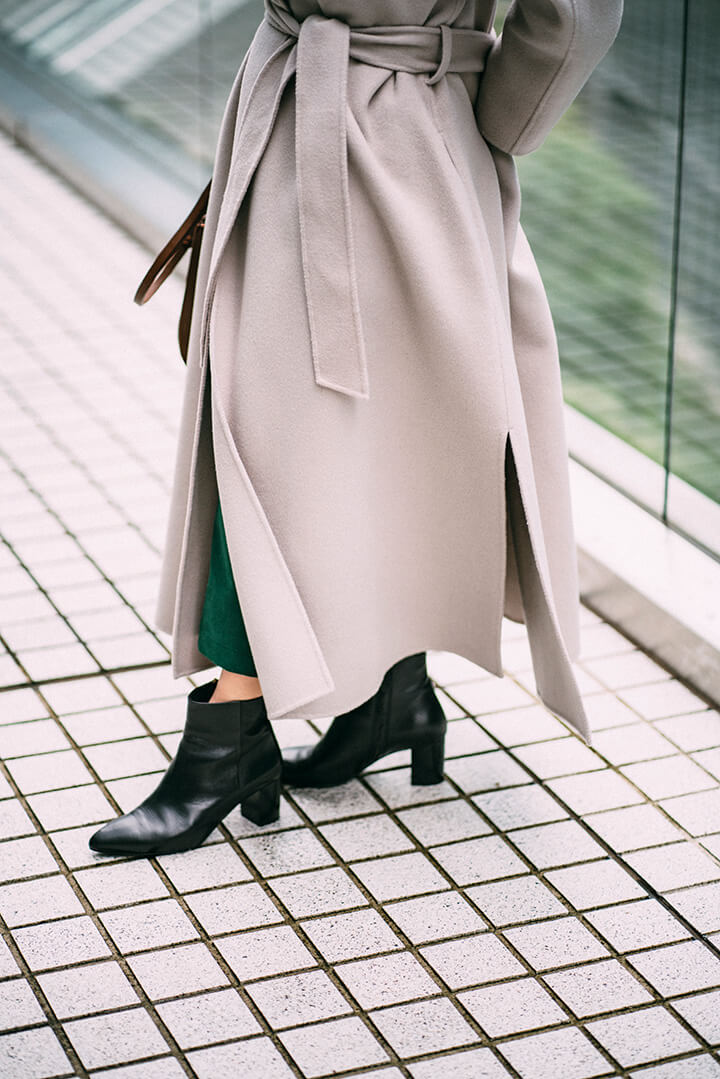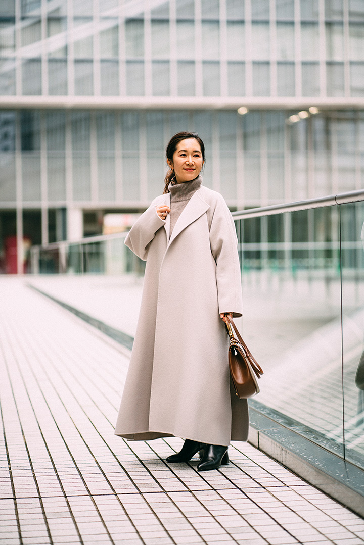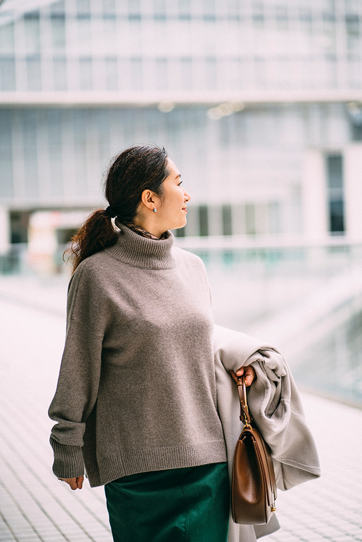 絶妙なニュアンスを生む、オフ白のリバーコート。たっぷりのボリュームでも主張しすぎず、お洒落上級者の風格を漂わせます。巻き物はトゥーマッチだから、タートルネックニットのみの潔さが◎。鮮やかなグリーンのスカートをさりげなく見せて、今時の冬コーデにアップデート。