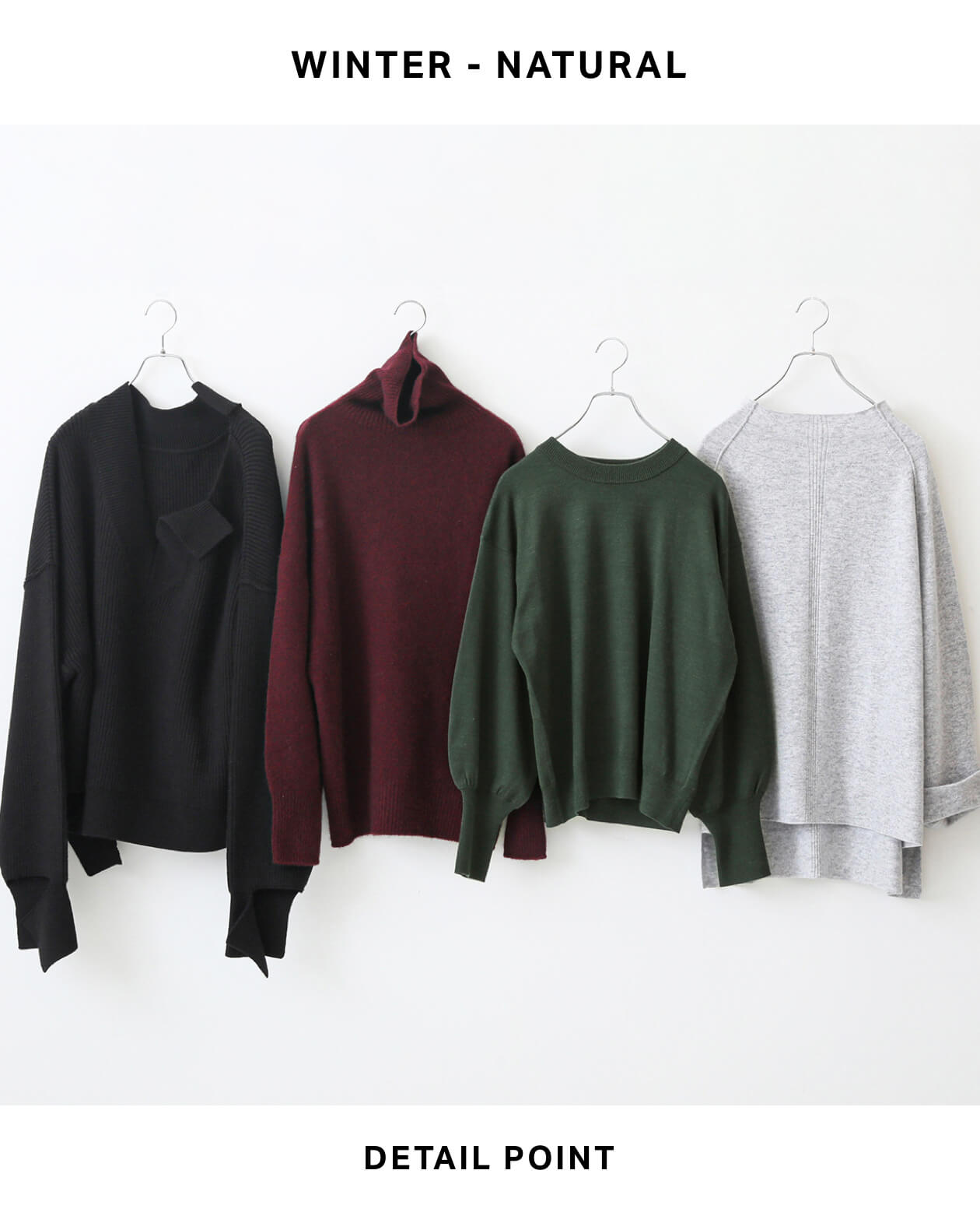 ゆったりとしたオーバーサイズのこなれた雰囲気が似合うナチュラルさん。ニットなら1番幅広くなんでも着こなせるタイプですが、ぴったりし過ぎるものや毛足の長いもの、首元が開きすぎているものは体のフレーム感が悪目立ちするため注意が必要です。パフスリーブニットでスタイルに抑揚をつけて。Vネックのラインがユニークな畔編みニットは、1枚で洒落感たっぷりのモードなデザイン。 - CITYSHOPBROKEN AZE KNIT¥16,500(税込)