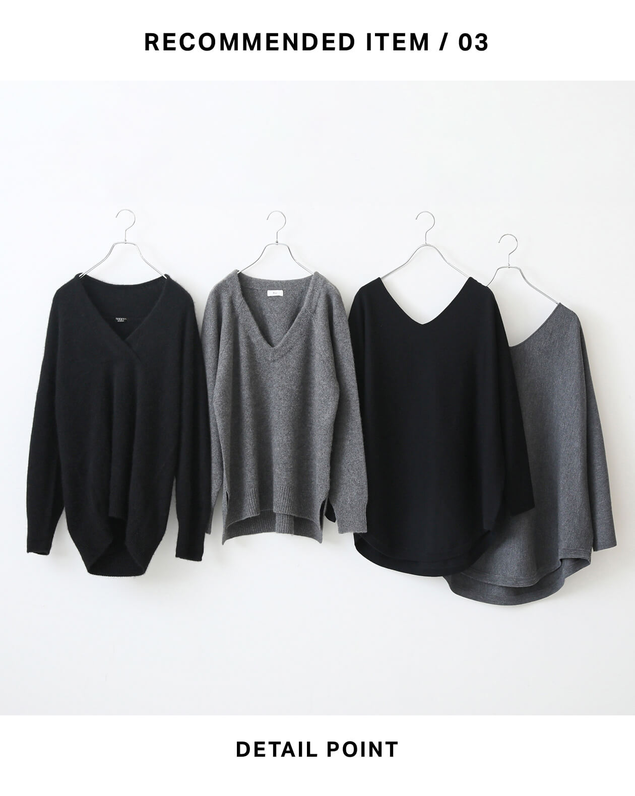 ベーシックなデザインのVネックニットは何枚持っていても重宝するアイテム。スタイリッシュにまとまるブラックは、今っぽいラウンドヘムのディテールに更新して。寒くなってきたらピンクやブルーなど、ウィンタータイプらしいビビッドカラーをインナーやボトムスに取り入れてアクセントを加えても◎。 - VERMEIL par ienaピュアカシミヤ Vネックプルオーバー◆¥28,600(税込)