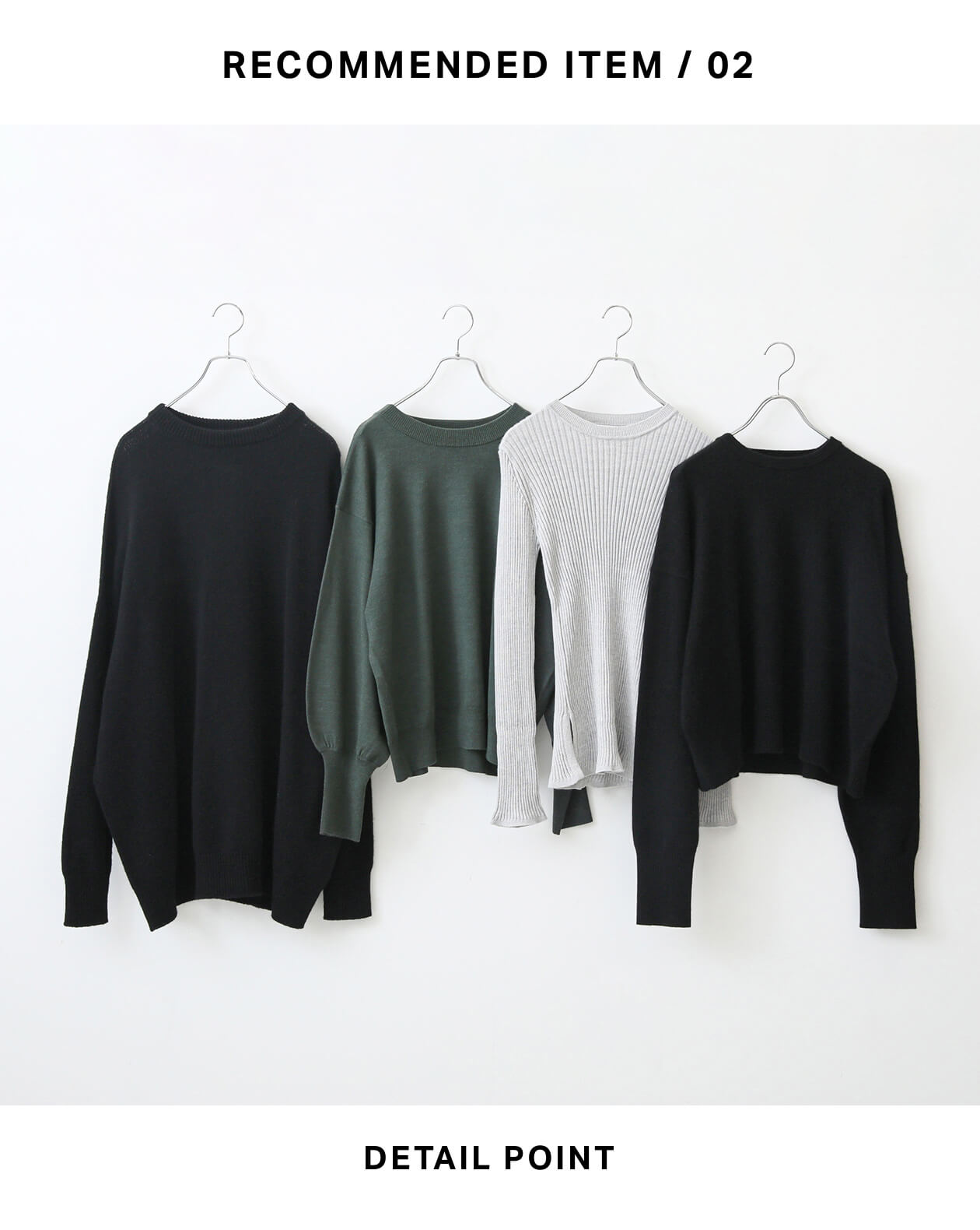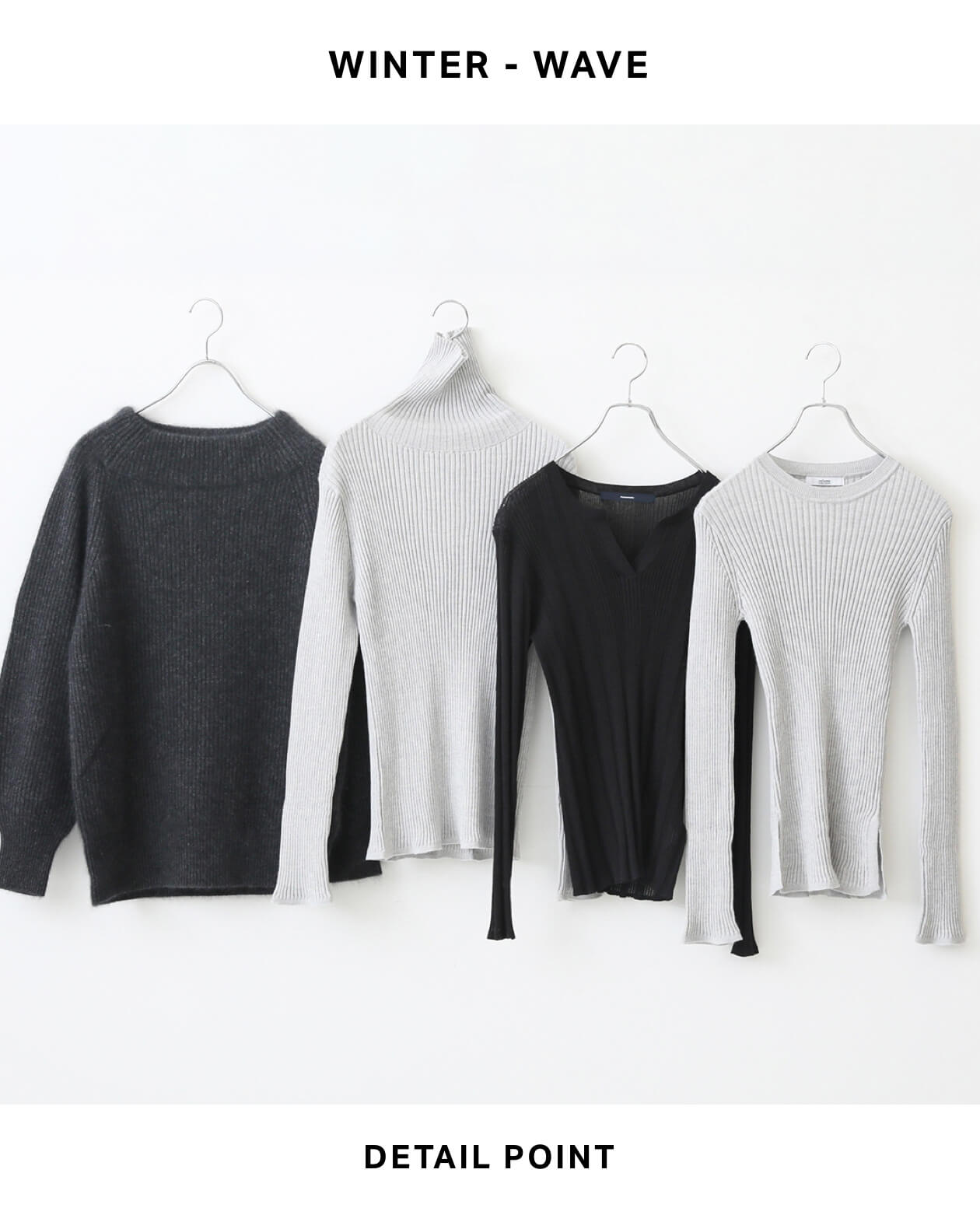 おすすめのアイテム毛足の長いふわふわのニットやリブなどのフィットする素材がお似合いになるウェーブさん。長めの丈だと“着られている感”が出てしまうので、腰骨より短い丈感がおすすめです。ファーミックスのニットは大人なグレーに可愛らしさを足し算。タートルネックやクルーネックはレイヤードにも重宝する一方で、首を覆うデザインはデコルテが寂しく見えないようアクセサリーを重ねるなどの工夫を。 - Spick and SpanFURMIX畦ボトルネックプルオーバー◆¥16,500(税込)