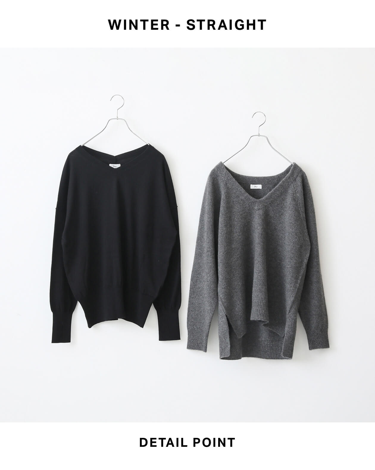 肌を覆えば覆うほど着膨れしてしまうストレートさん。特にタートルネックなど首元にボリュームが来るものが苦手なので、Vネックで縦ラインを意識して。ゆったりとヒップまで覆う長めのシルエットが今年っぽい。アンゴラなどのやわらかい素材を着たい時は、極力毛足の短いものがおすすめです。 - Bonumコットンカシミヤ Vネックプルオーバー¥13,200(税込)
