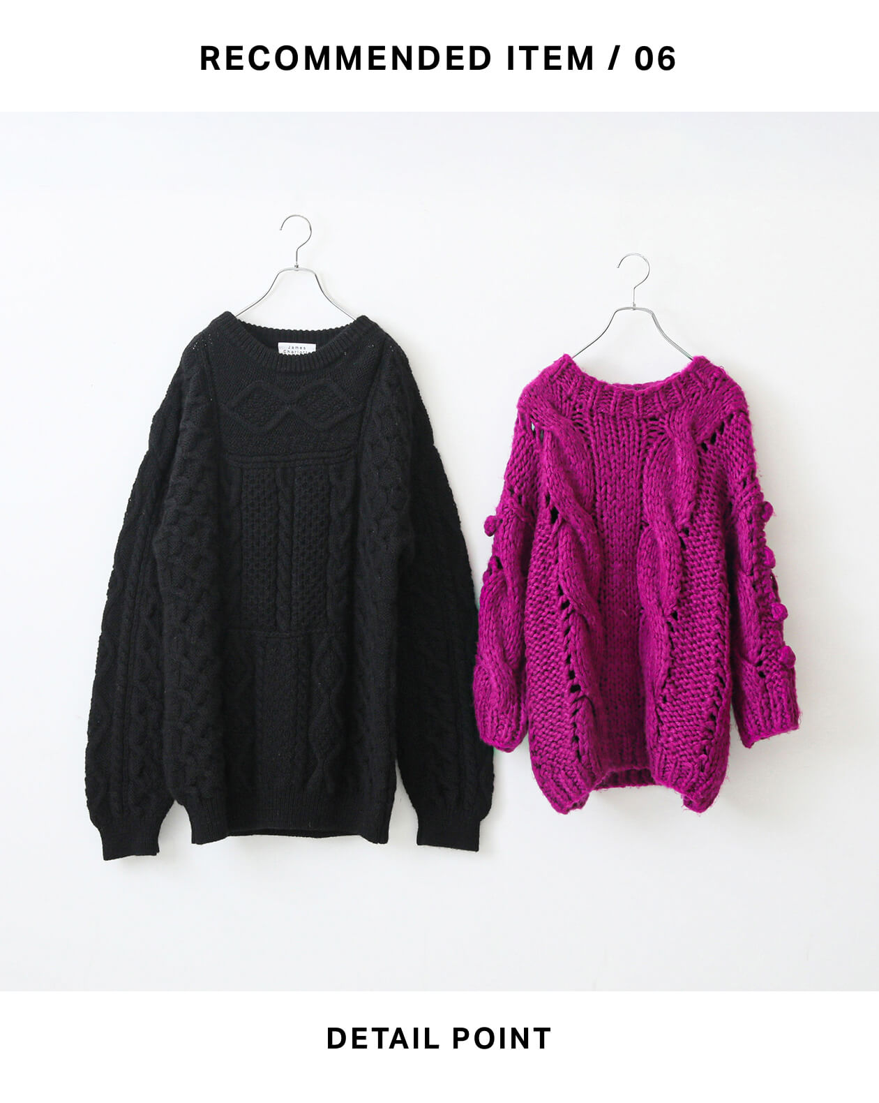ヴィンテージライクな雰囲気が魅力のニットですが、生成り色はウィンターのNGカラー。青みピンクのマゼンタならレトロなムードはそのままに、顔映りもばっちりです。ざっくり編まれたケーブルと、袖のぽんぽんが可愛げたっぷりの主役ニット。異なる編み地をランダムにつないだ表情豊かなタイプはシンプルなブラックをチョイス。 - JOURNAL STANDARD【JAMES CHARLOTTE/ジェームスシャルロット】クレイジーアランプルオーバー◆¥23,100(税込)