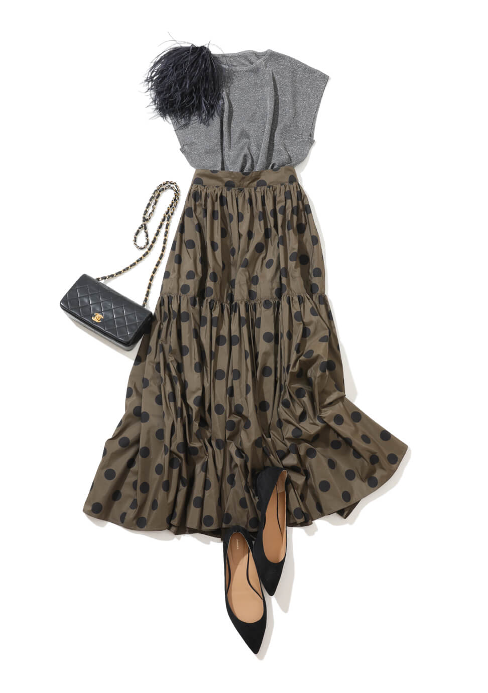 気のおけない友達と、週末の夜のお出かけ。ツヤのあるラメ糸混のトップスに、ドットのティアードスカートでおしゃれをとことん楽しみたい。スカートはカーキがベースだから甘くも幼くもならず、大人っぽい雰囲気に。キャッチーなコサージュをアクセントにヴィンテージのシャネルバッグを下げれば、さらにテンションアップ!