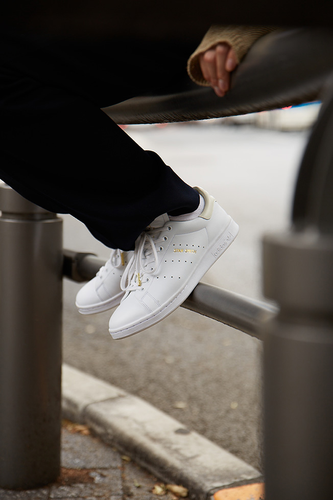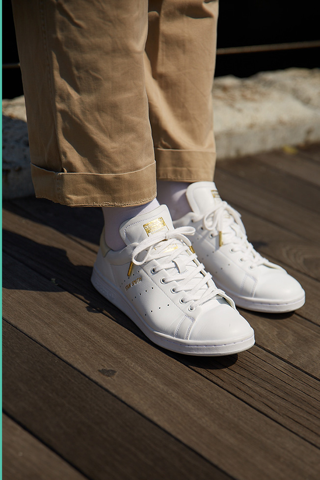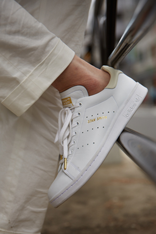 • アメリカの国民的テニスプレイヤーであったスタン・スミス氏の名を冠し、そのシグネイチャーモデルとして1970年代初頭にデビューして以来、その究極にシンプルなスタイルで誰もが知る名作スニーカーの仲間入りを果たした「スタンスミス」。お馴染みの薄型のカップソールやパンチングのスリーストライプスをオリジナルモデルから受け継ぎながら、今回の別注モデルにおいて最も重要なポイントは、アッパー素材を上質なレザーにアップデートし、シューレースの先端にはゴールドの弾丸チップを採用している点。さらにボディの側面にはモデルネームを特別に刺しゅうし、タンやヒールパッチ、インソールなど、いずれもさりげないゴールドの配色をあしらい、嫌味のない上品な印象へと仕上げている。また今回のモデルと相性抜群な別注仕様のコラボレーションセットアップのアイテムも発売予定。