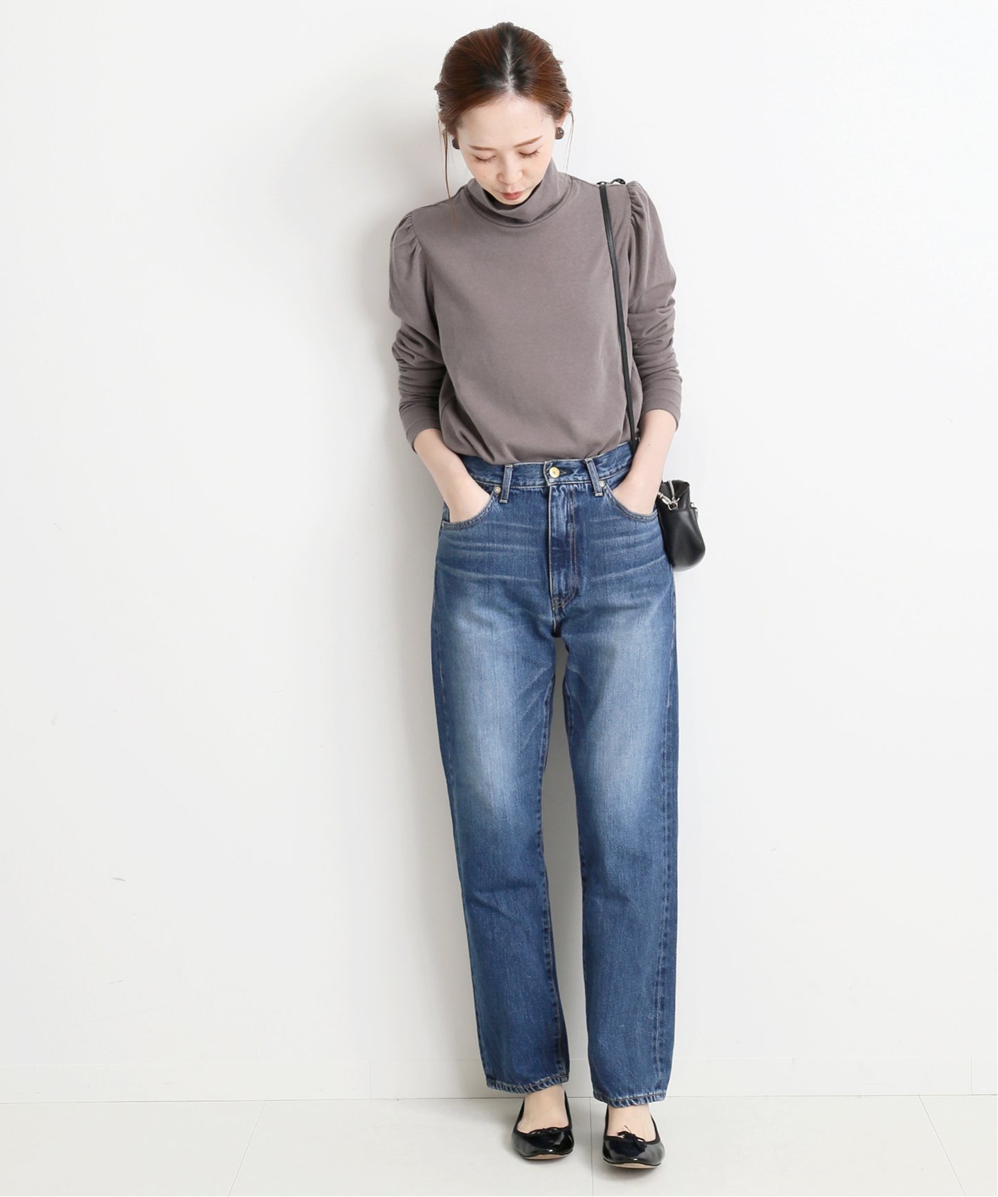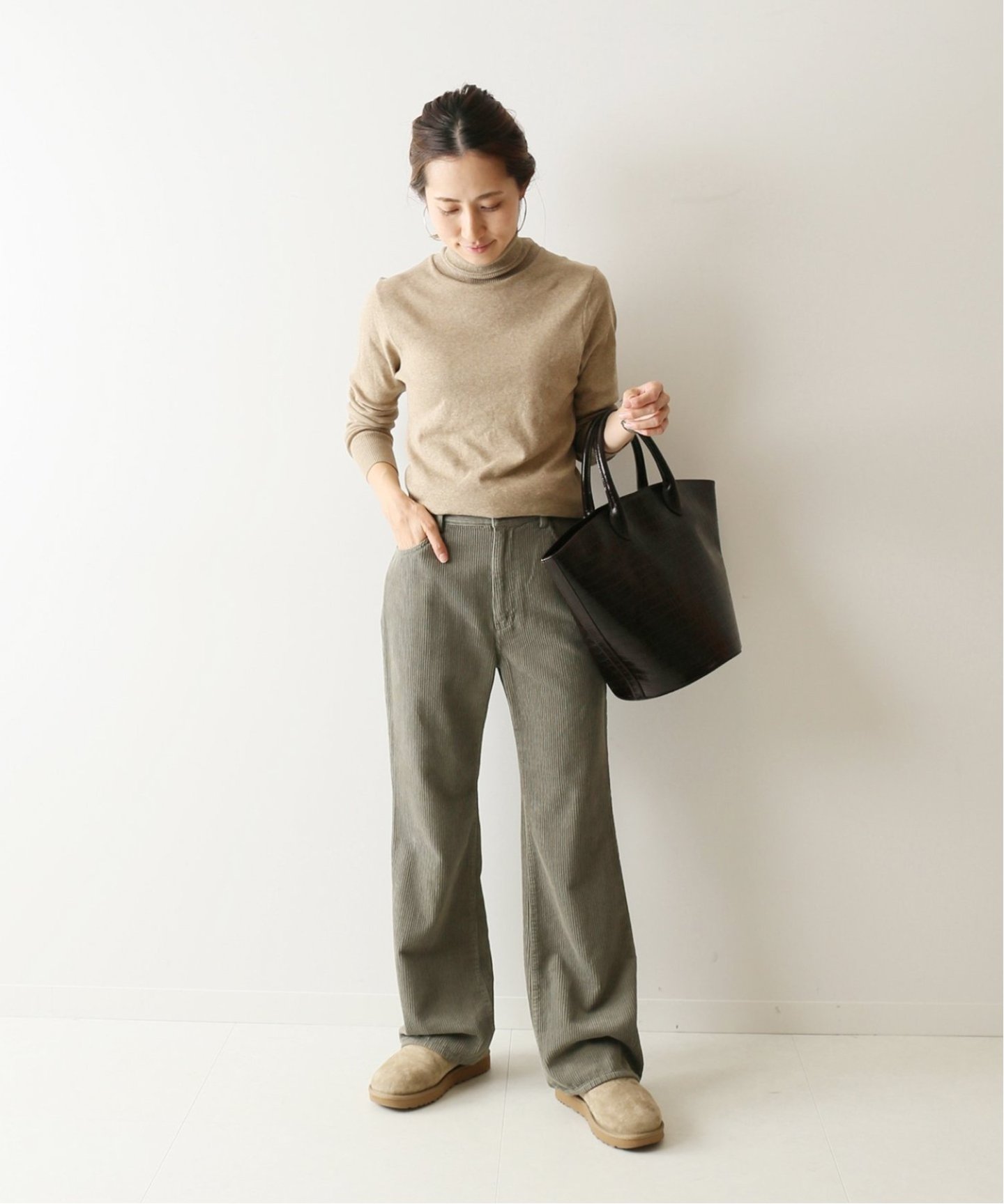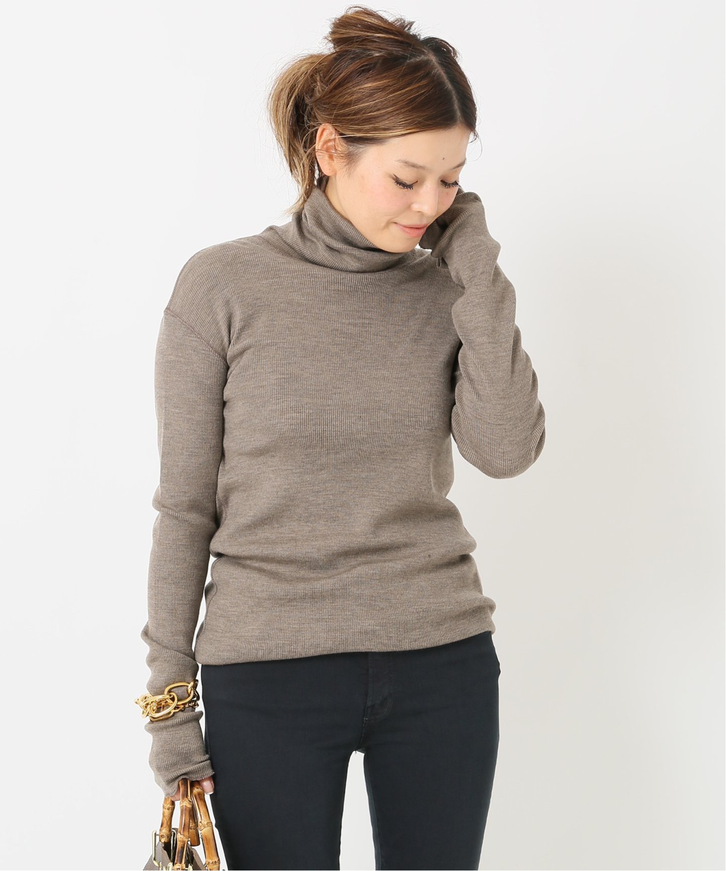 ブラウンのシンプルタートルネックトップス。