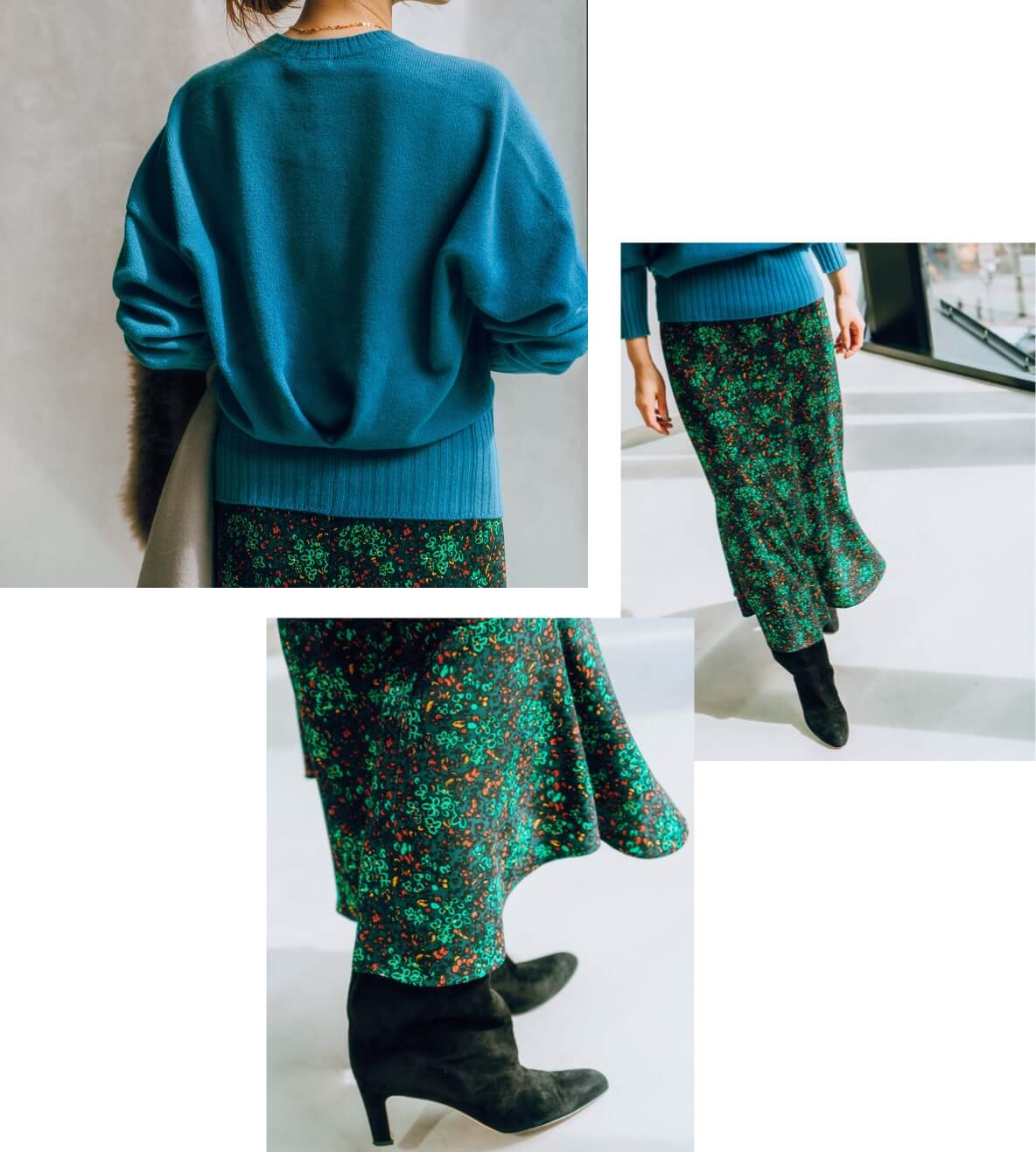 きれい色のニットは後ろにタックが入っているのでたぷんとしたニュアンスが出てフェミニンな一着。