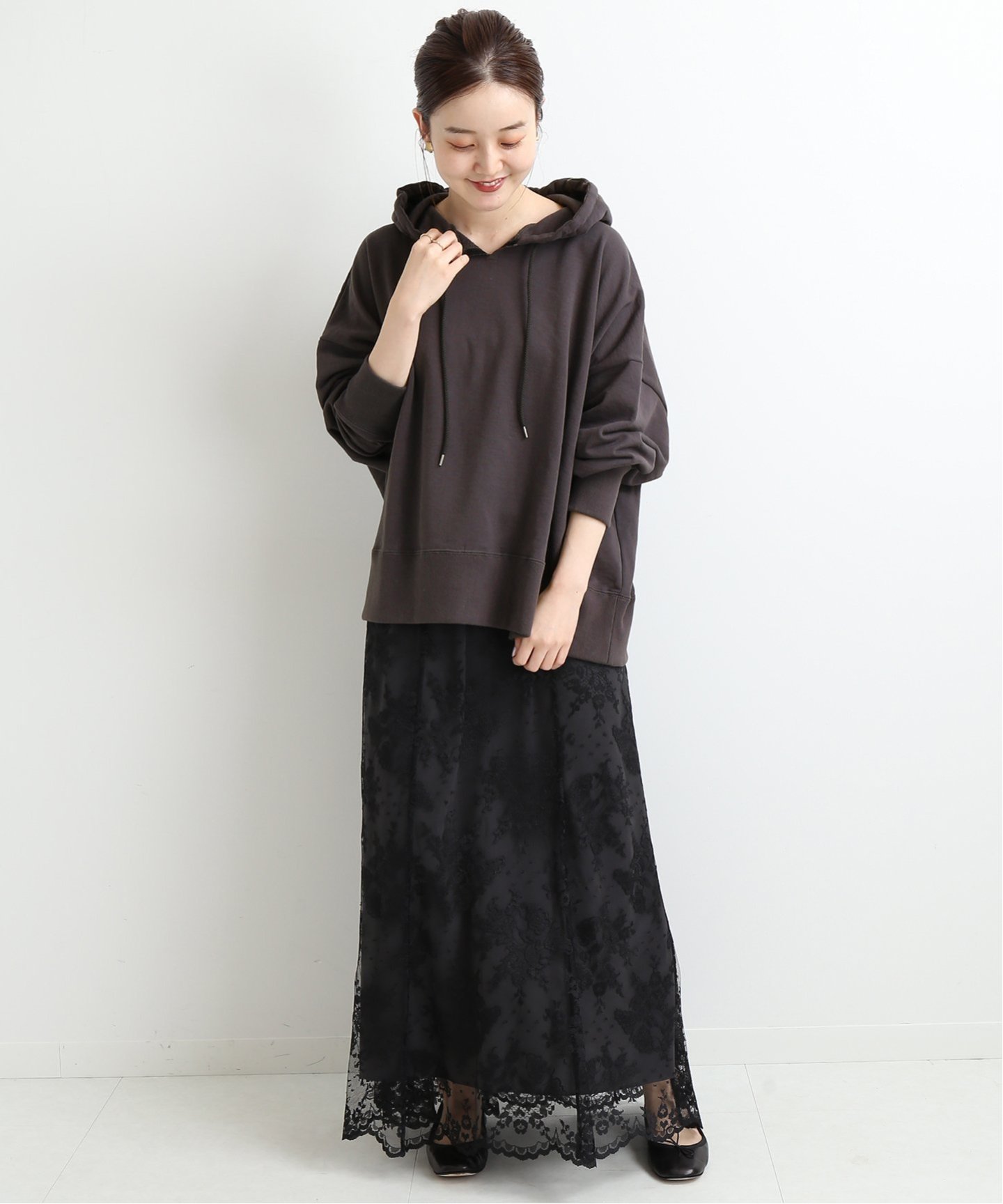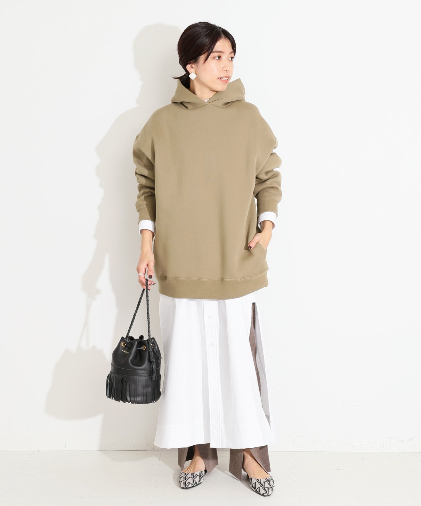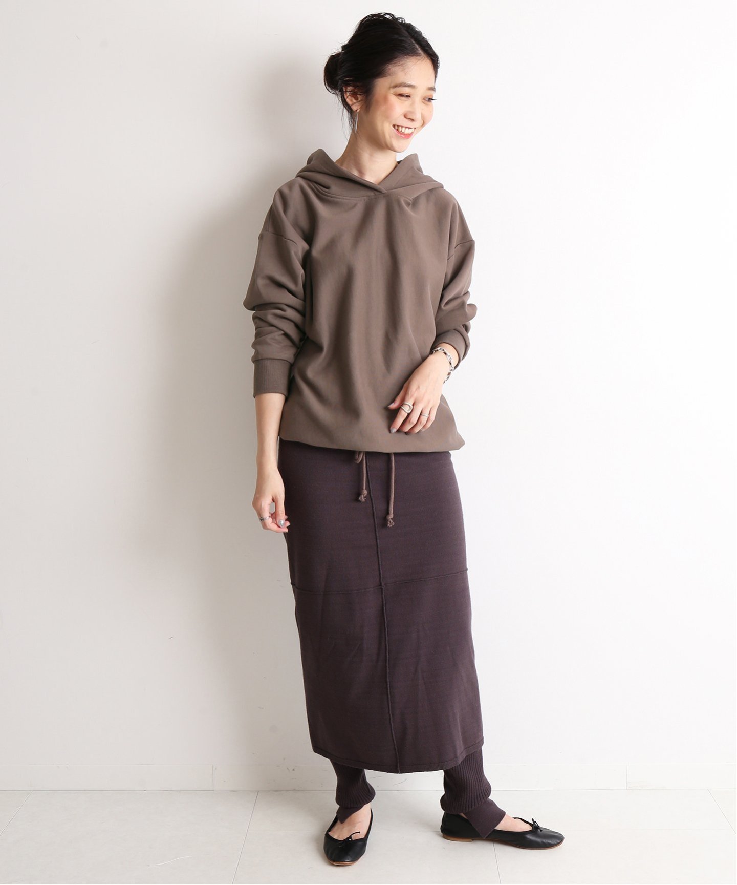 フーディは、着回し力抜群の万能色。フェミニンな