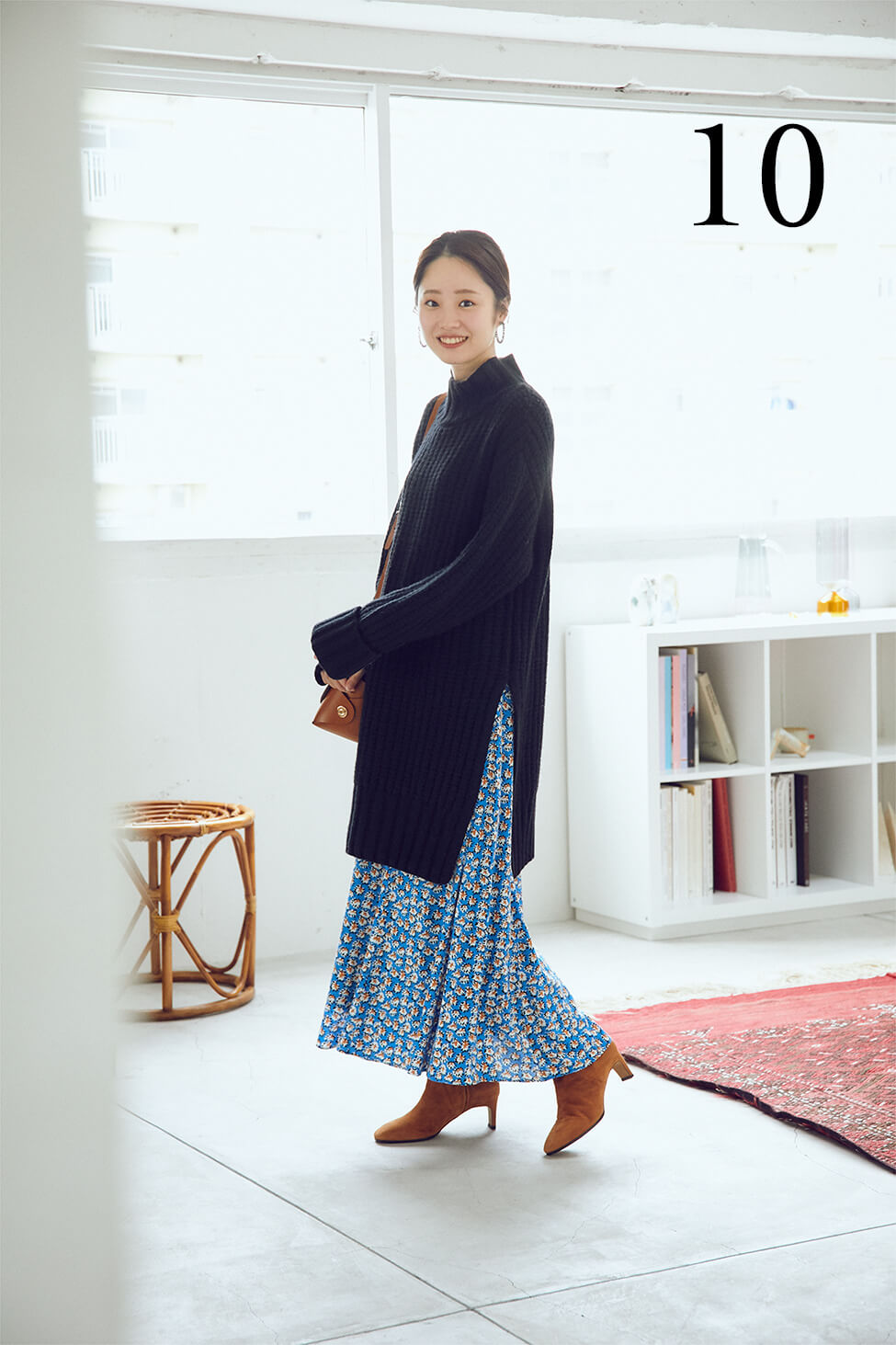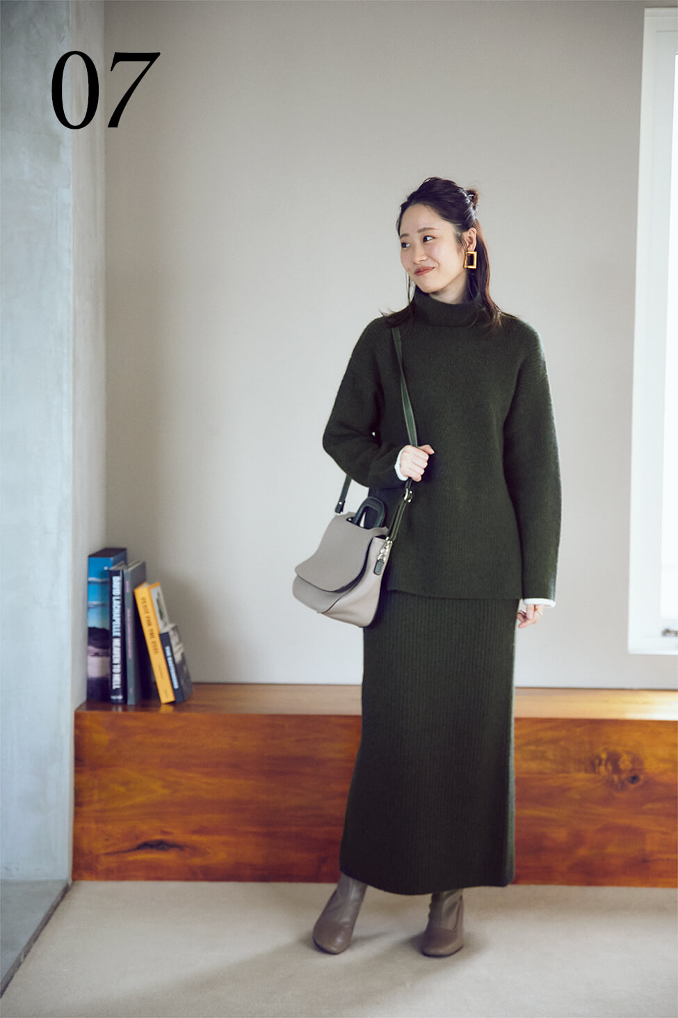ざっくりしたニットにとろみのある柔らかい素材のスカートを合わせたコーディネートは私もよくします。この素材のアンバランスさが大好きです。深めに入ったトップスのスリットが抜け感を演出してくれます。